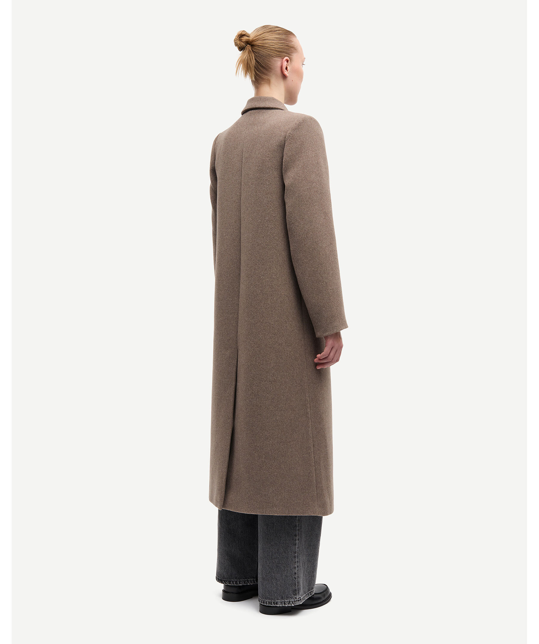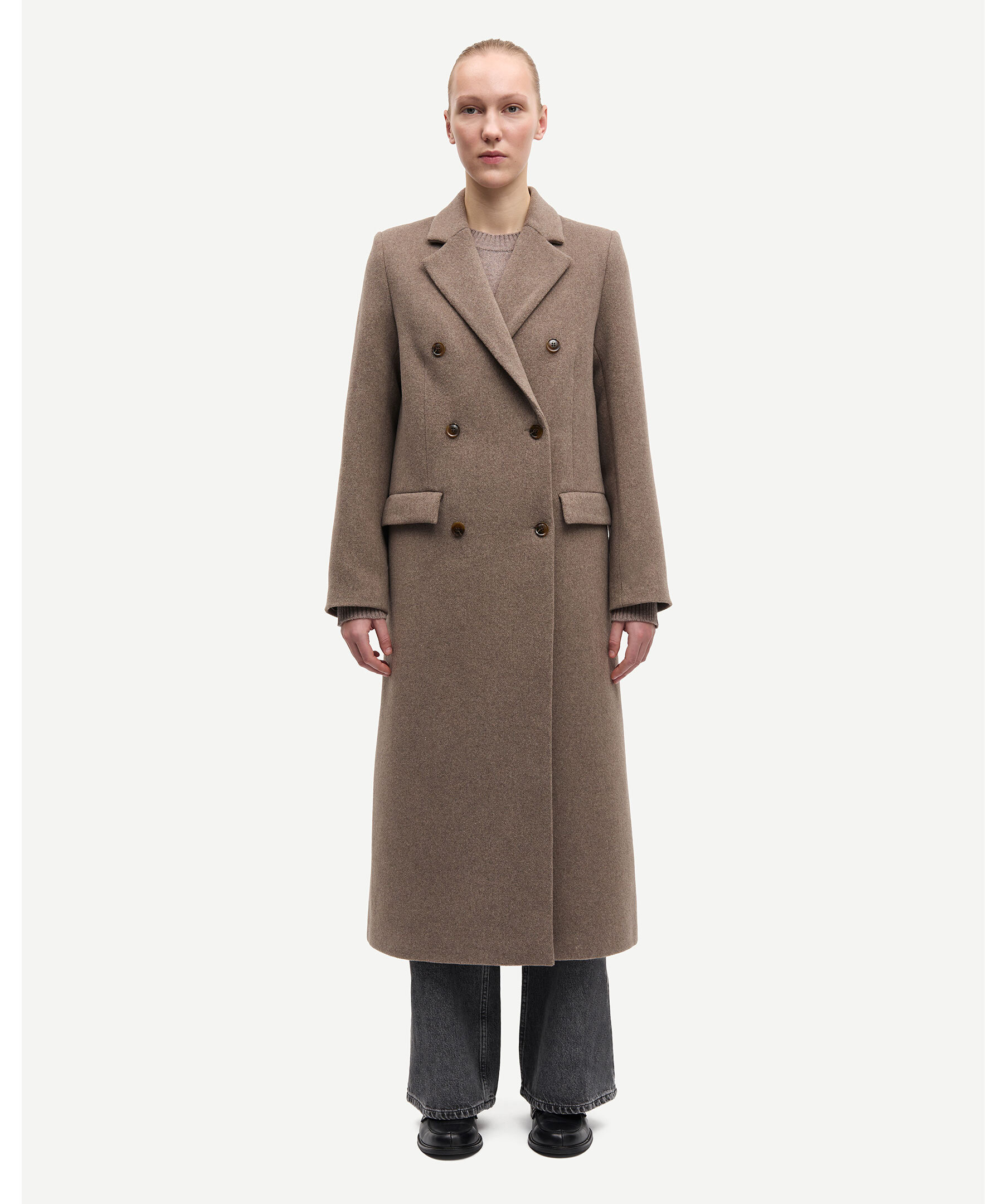 Skräddarsydd ullkappa från Samsoe Samsoe. Lång dubbelknäppt kappa med rak skuren kropp. Naggad lapelkrage, flaggade framfickor och lång öppning baktill. Fodrad och tillverkad i ullblandning. Modellen är 177 cm lång och bär storlek small.
