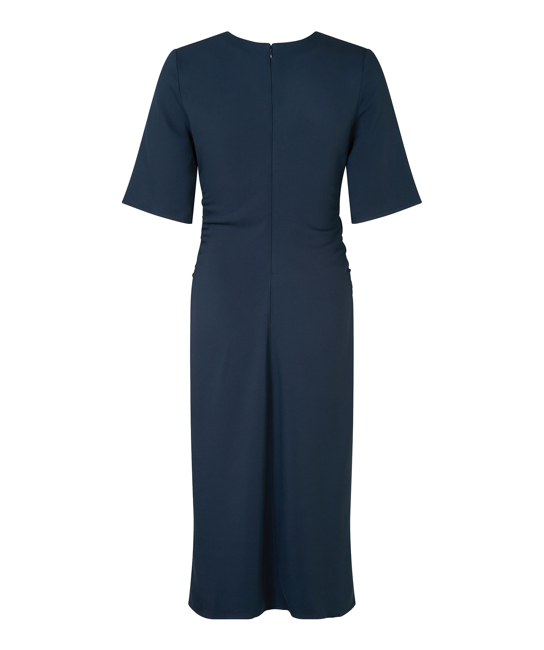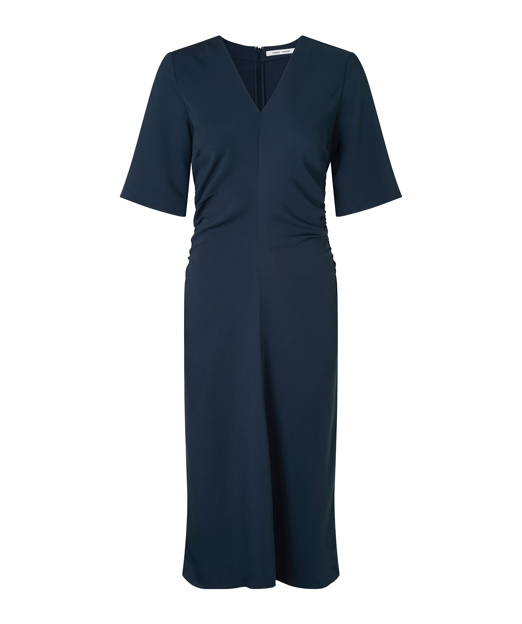 Blågrå klänning från Samsoe Samsoe. Midi modell. V-ringad. Dragkedja baktill i ryggen. Sömmar i sidorna för en veckade detaljer. Klänningen är tillverkad i ett elastiskt viskos tyg.