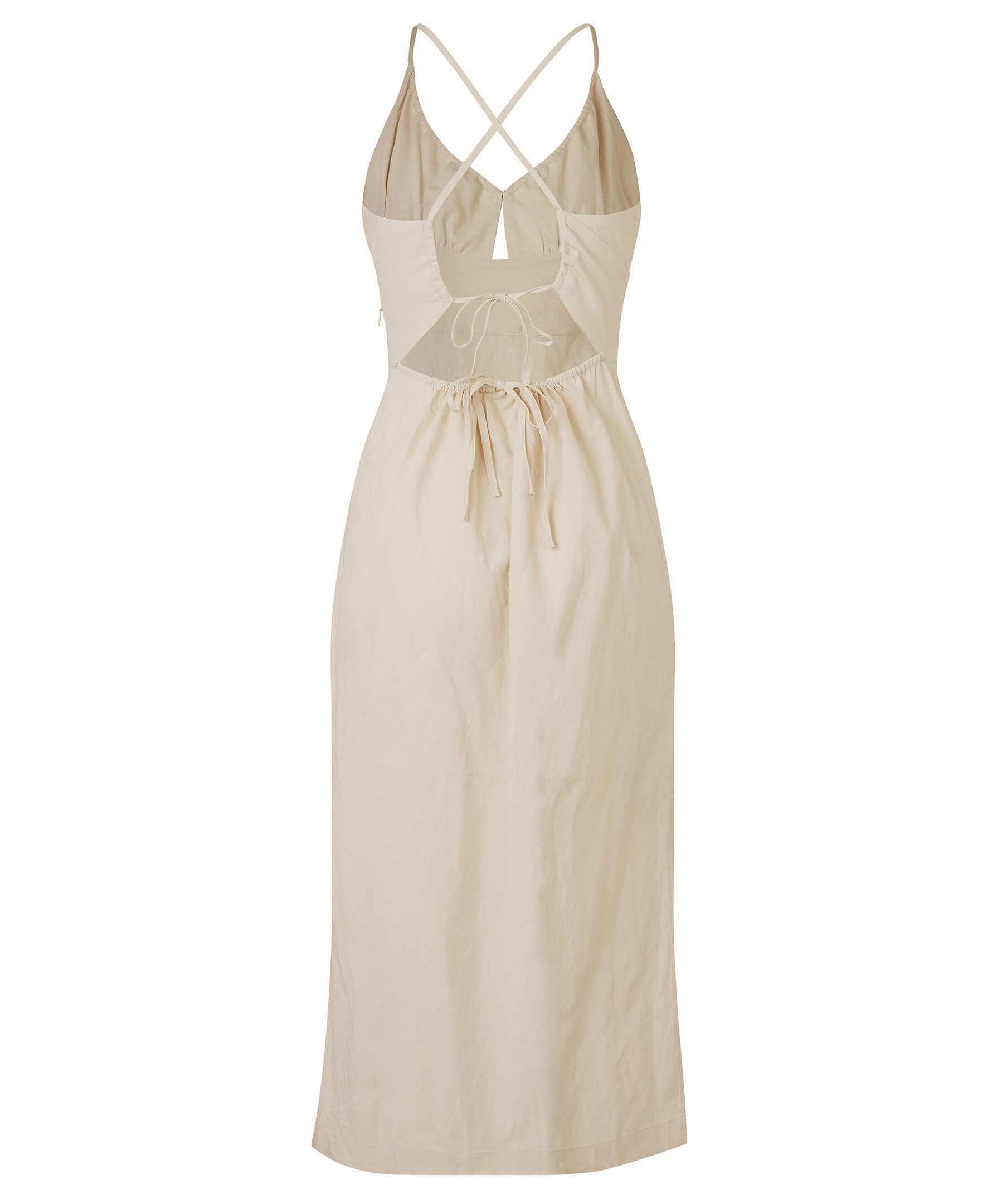 Ljusbeige långklänning med tunna axelband från Samsoe Samsoe. Slutar vid ankeln, har öppen rygg, knytband och rynkad halsringning. Osynlig dragkedja i sidorna, har fållslitsar och har ett foder. Tillverkad i lyocell, bomull och linne.