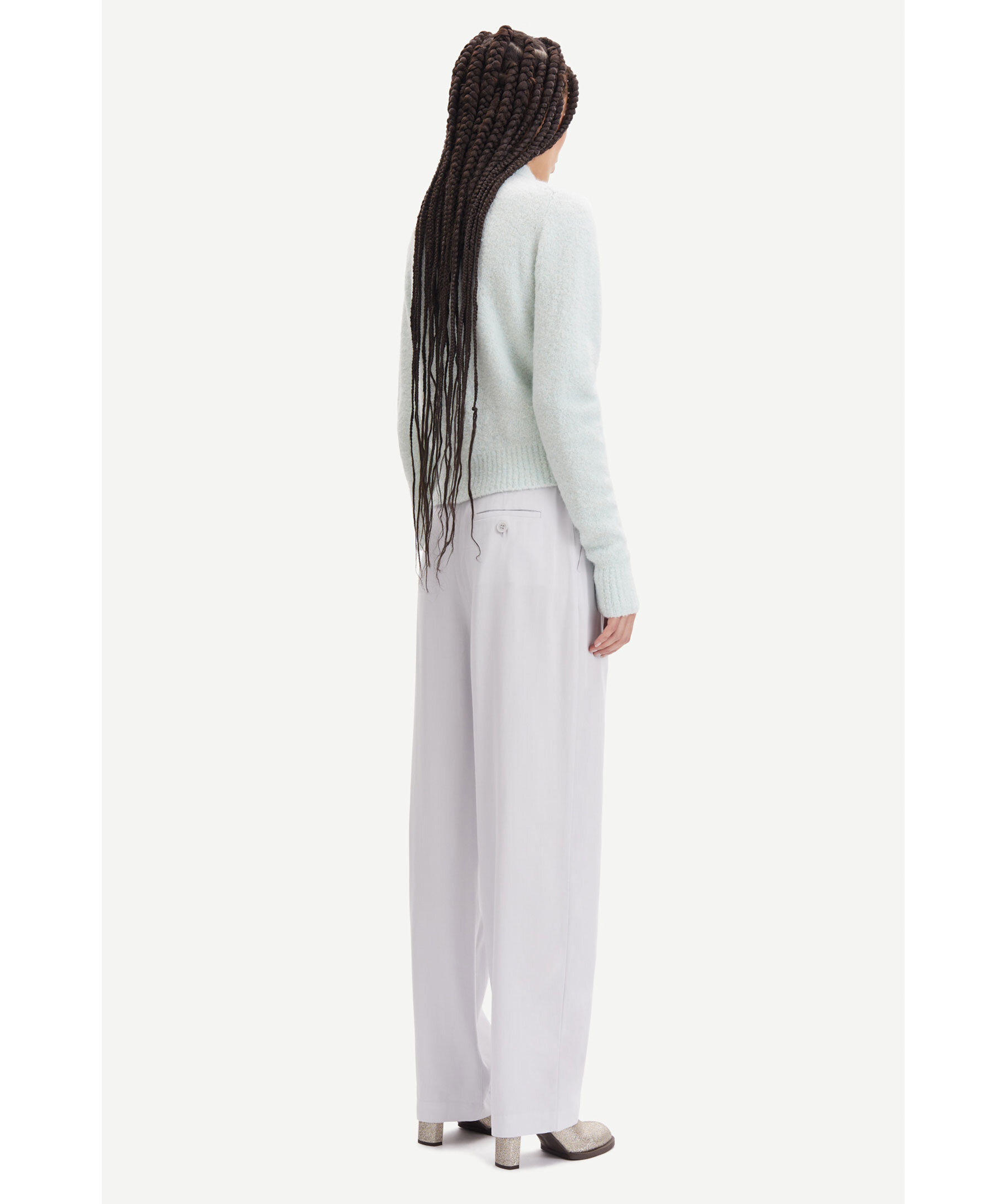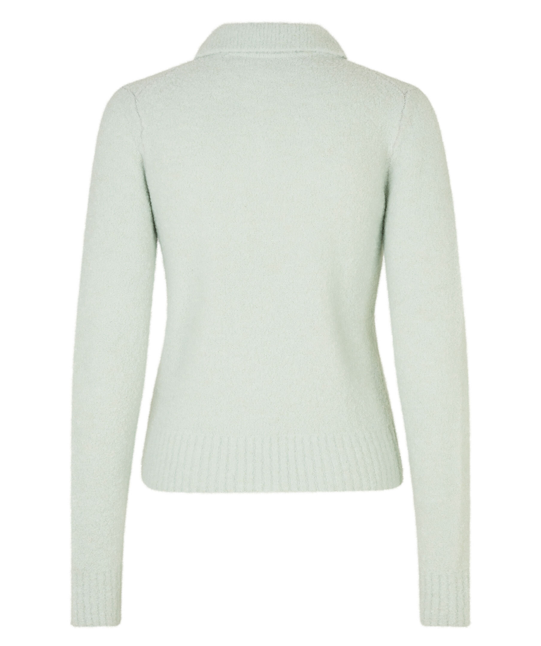 Mintgrön fluffig tröja från Samsøe Samsøe. Tröjan är gjord i en mjuk alpackablandning och har en krage med knappstängning. Ribbade muddar vid ärm och plaggslut. Modellen är 178cm lång och har på sig storlek S.