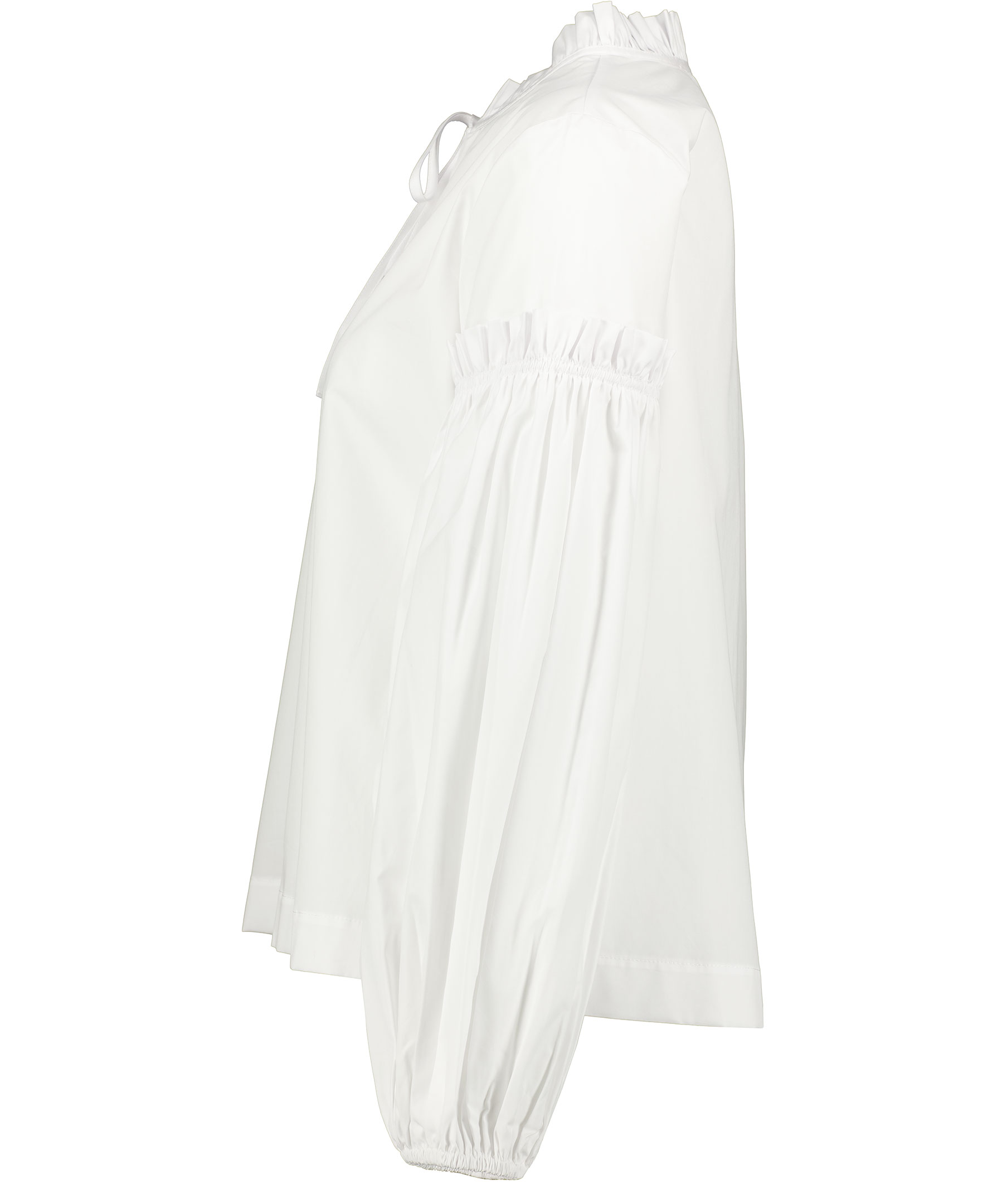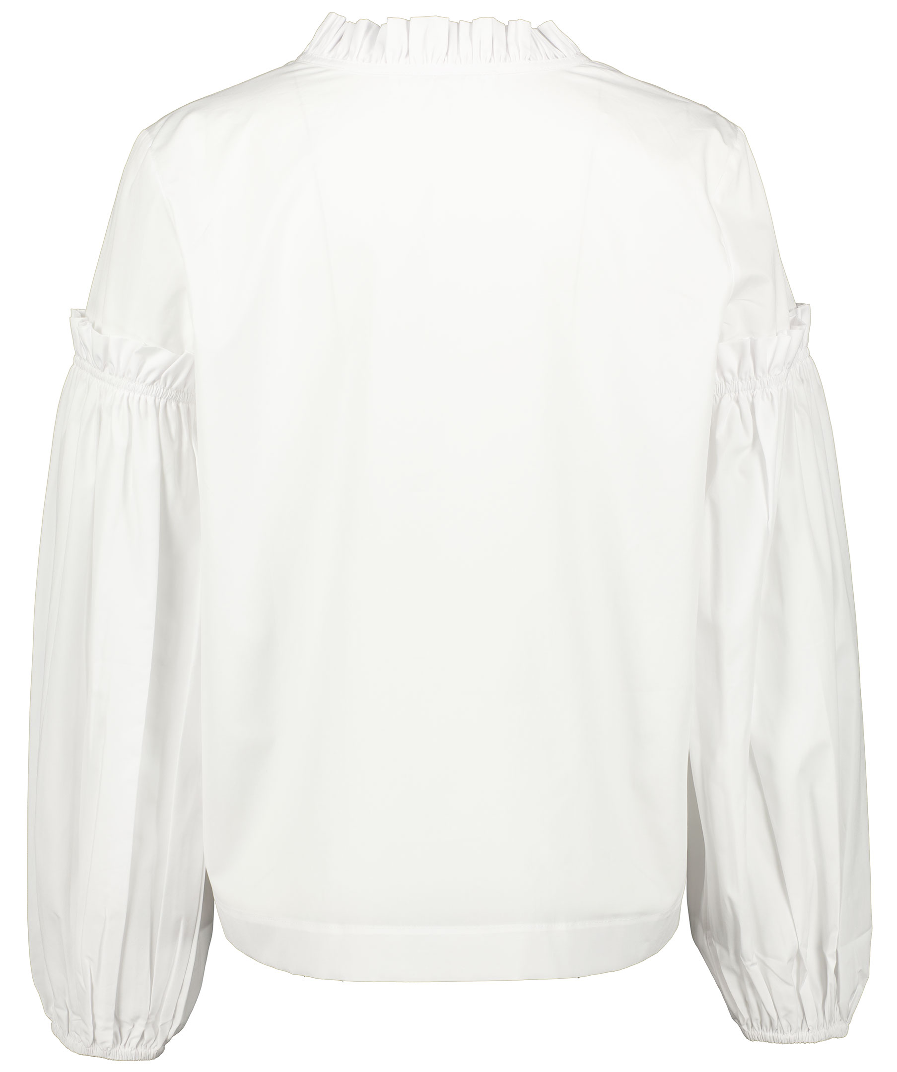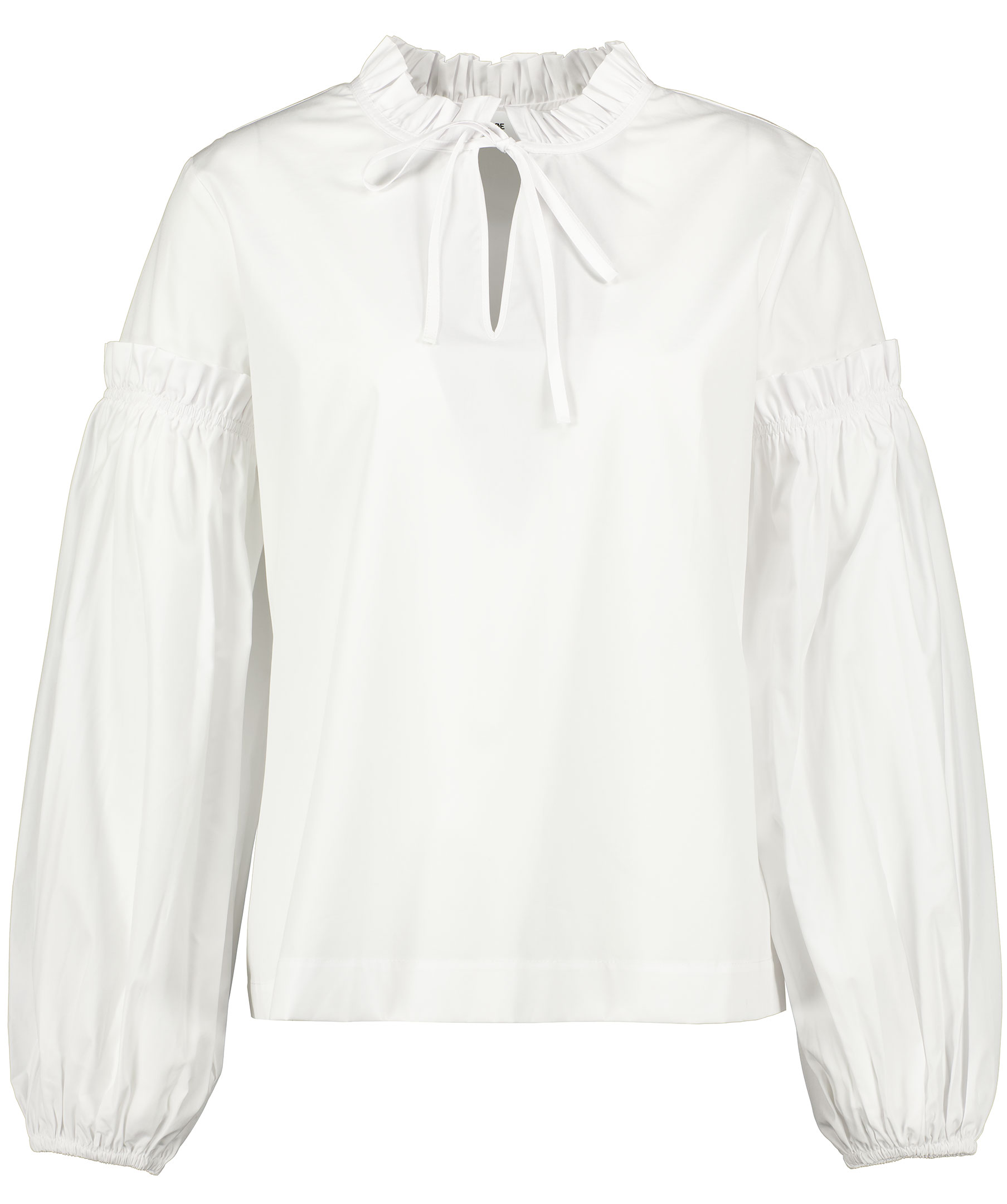 Vit långärmad blus från Samsøe Samsøe. Puffiga ärmar, knyt i halsringningen, resår i slutet av ärmen, tillverkad i 100% bomull.
