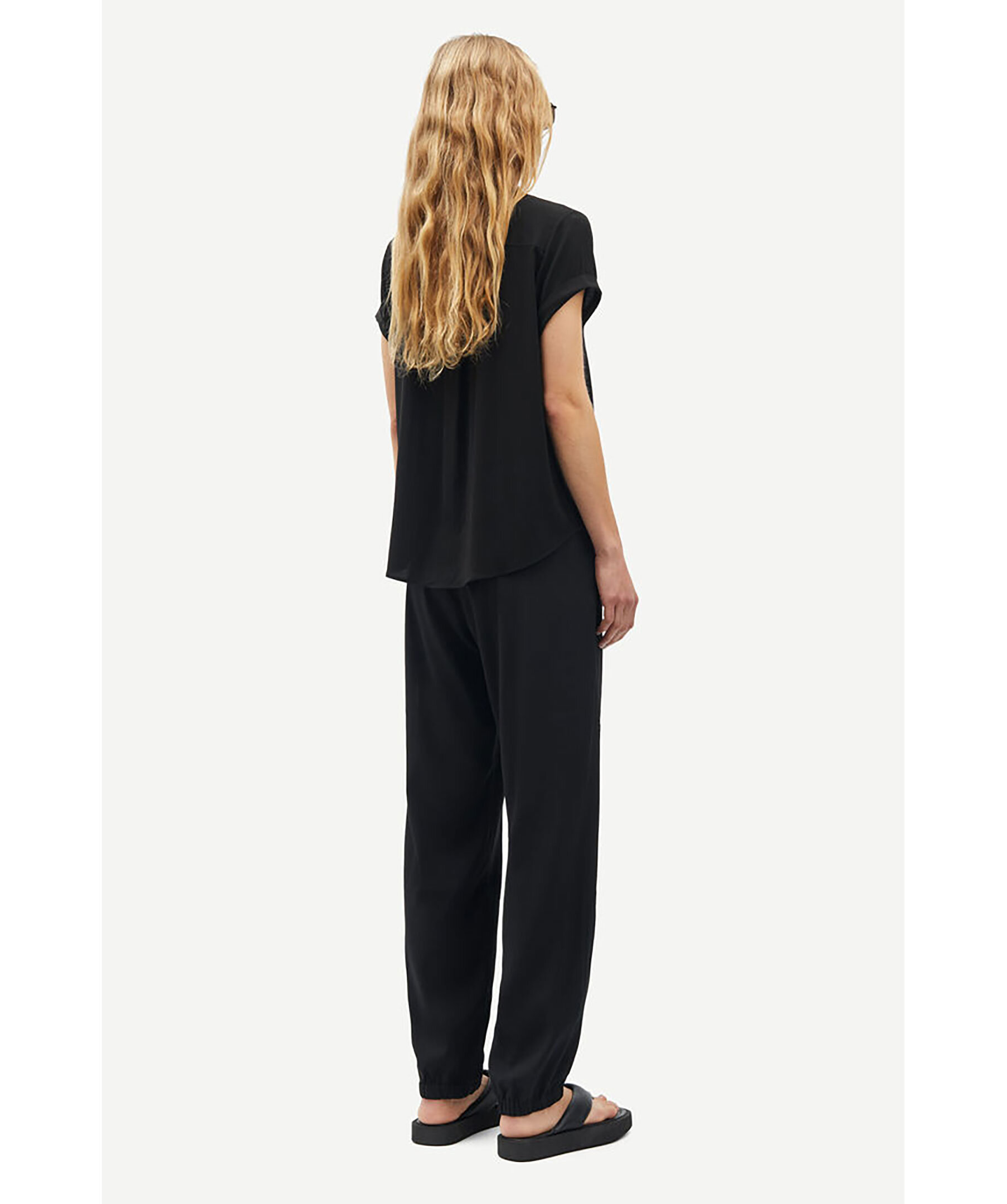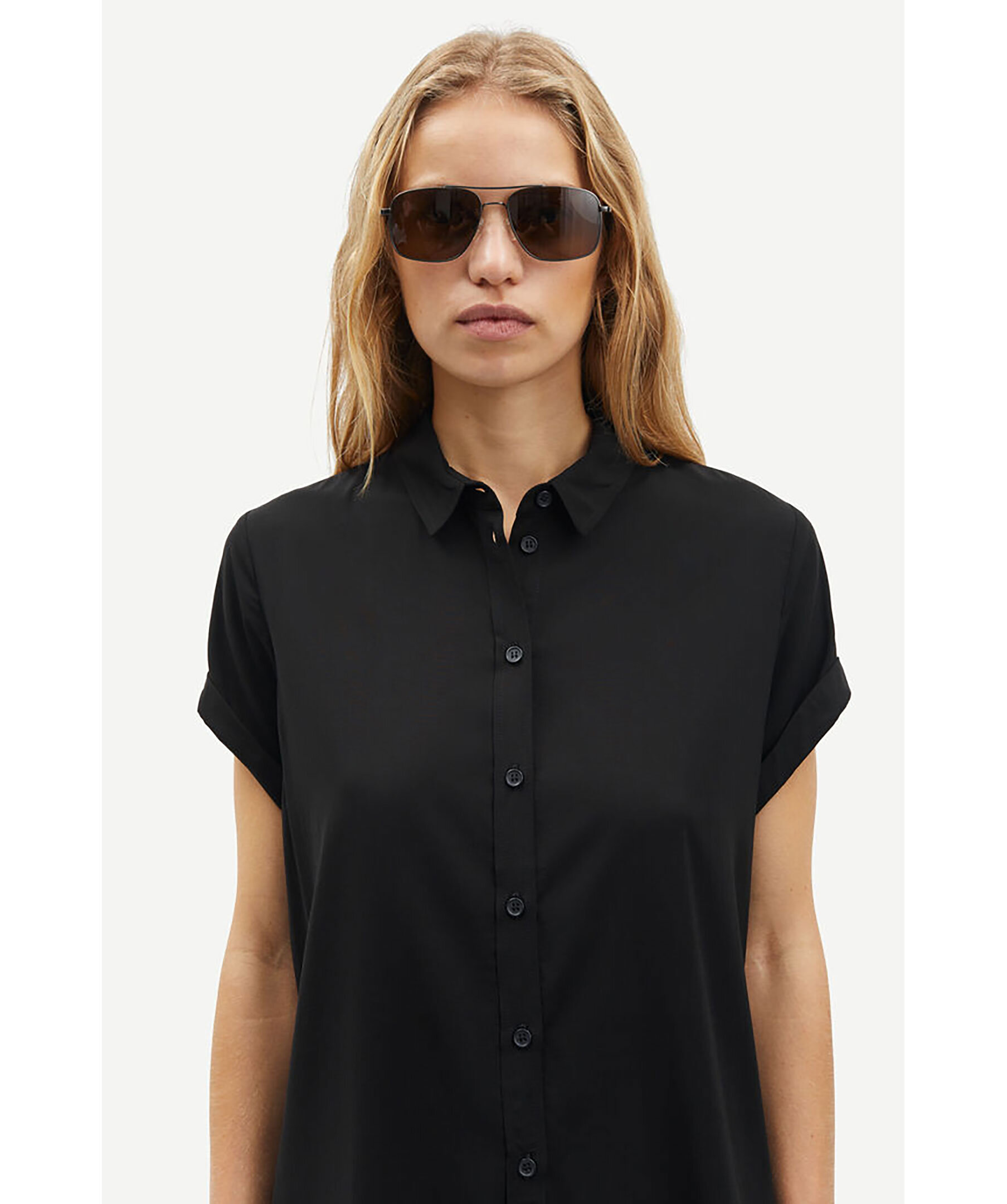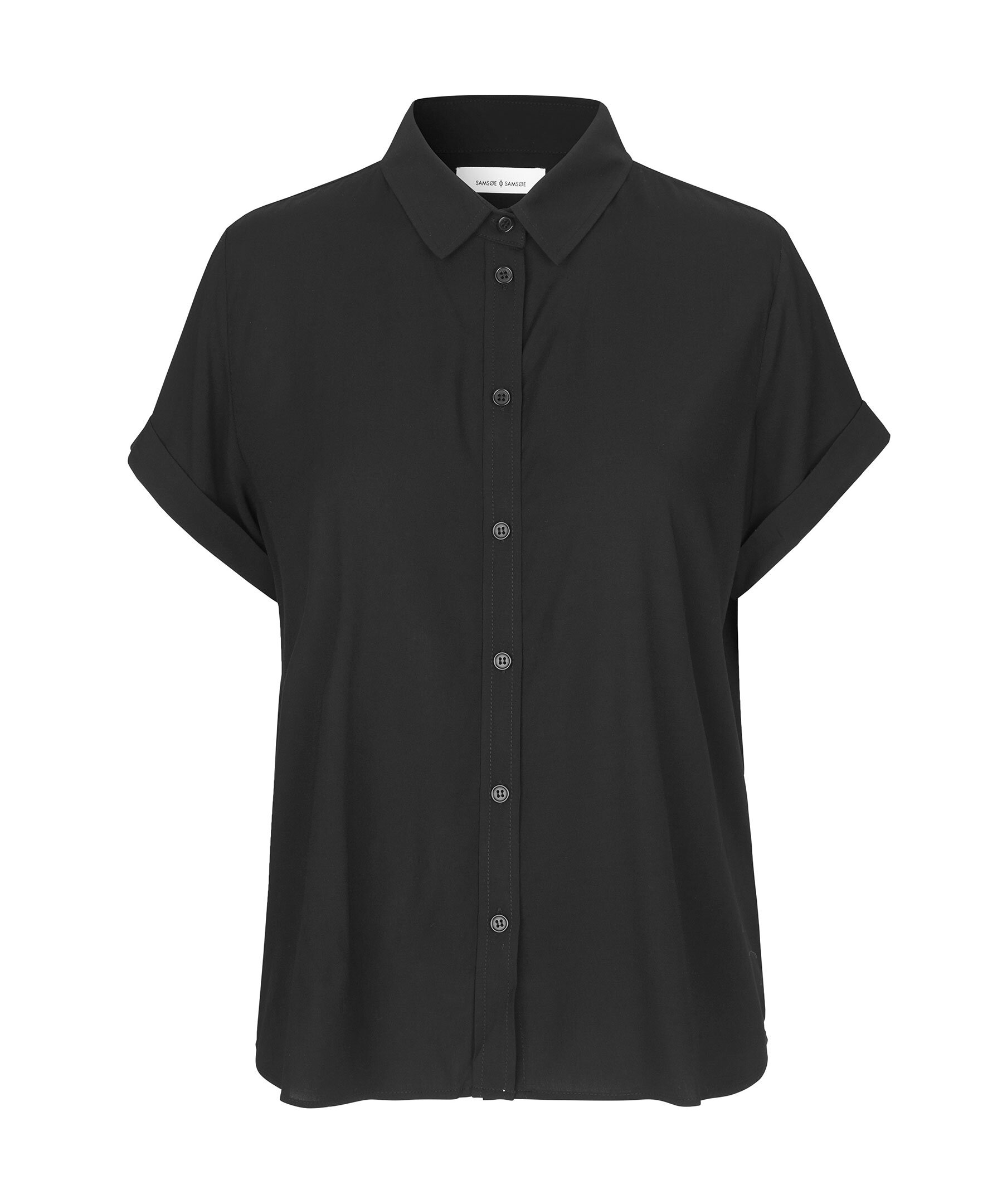 Svart kortärmad skjorta från Samsoe Samsoe. Stängs framtill med knappar. Spetsig krage. Uppvikta ärmar. Tillverkad i viskos blandning.