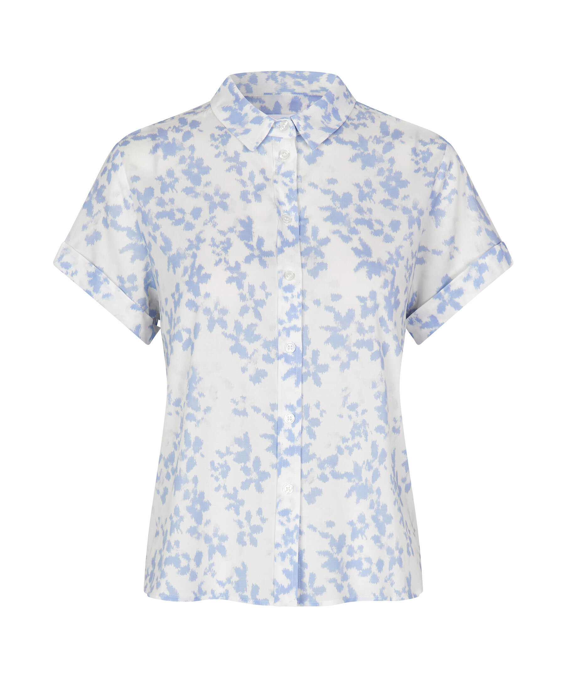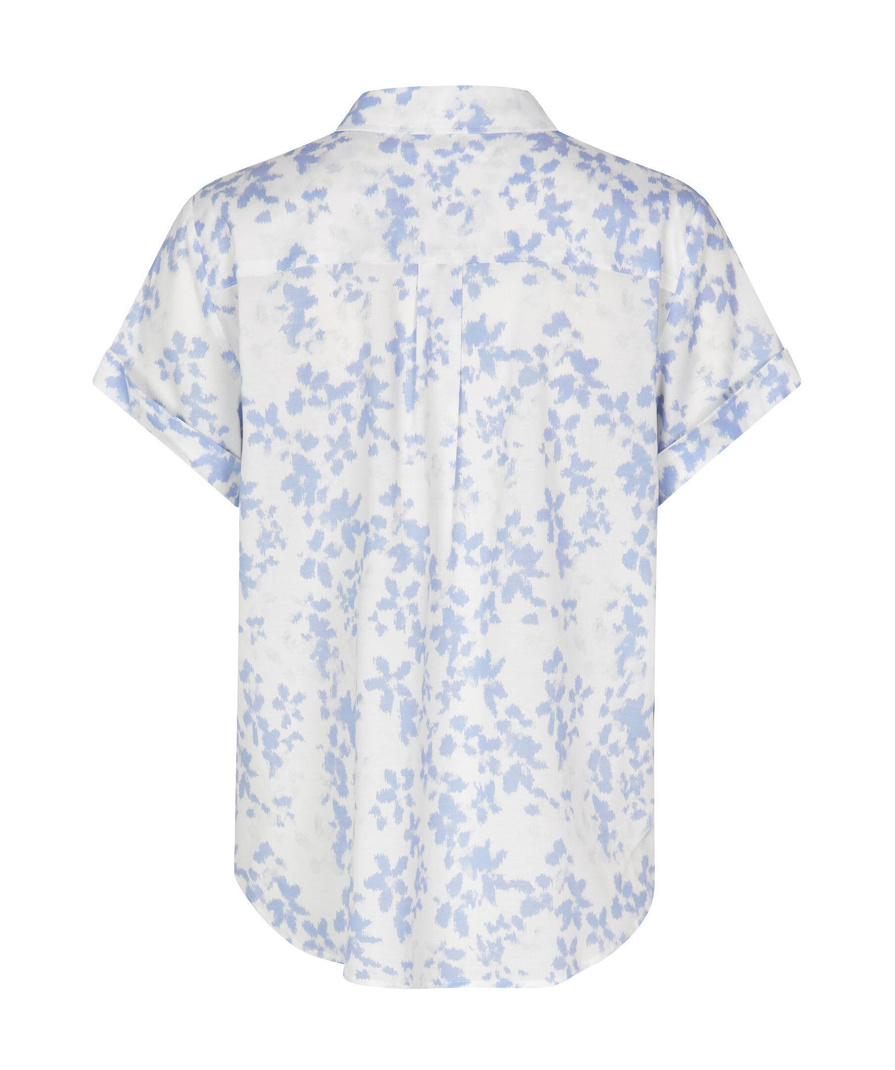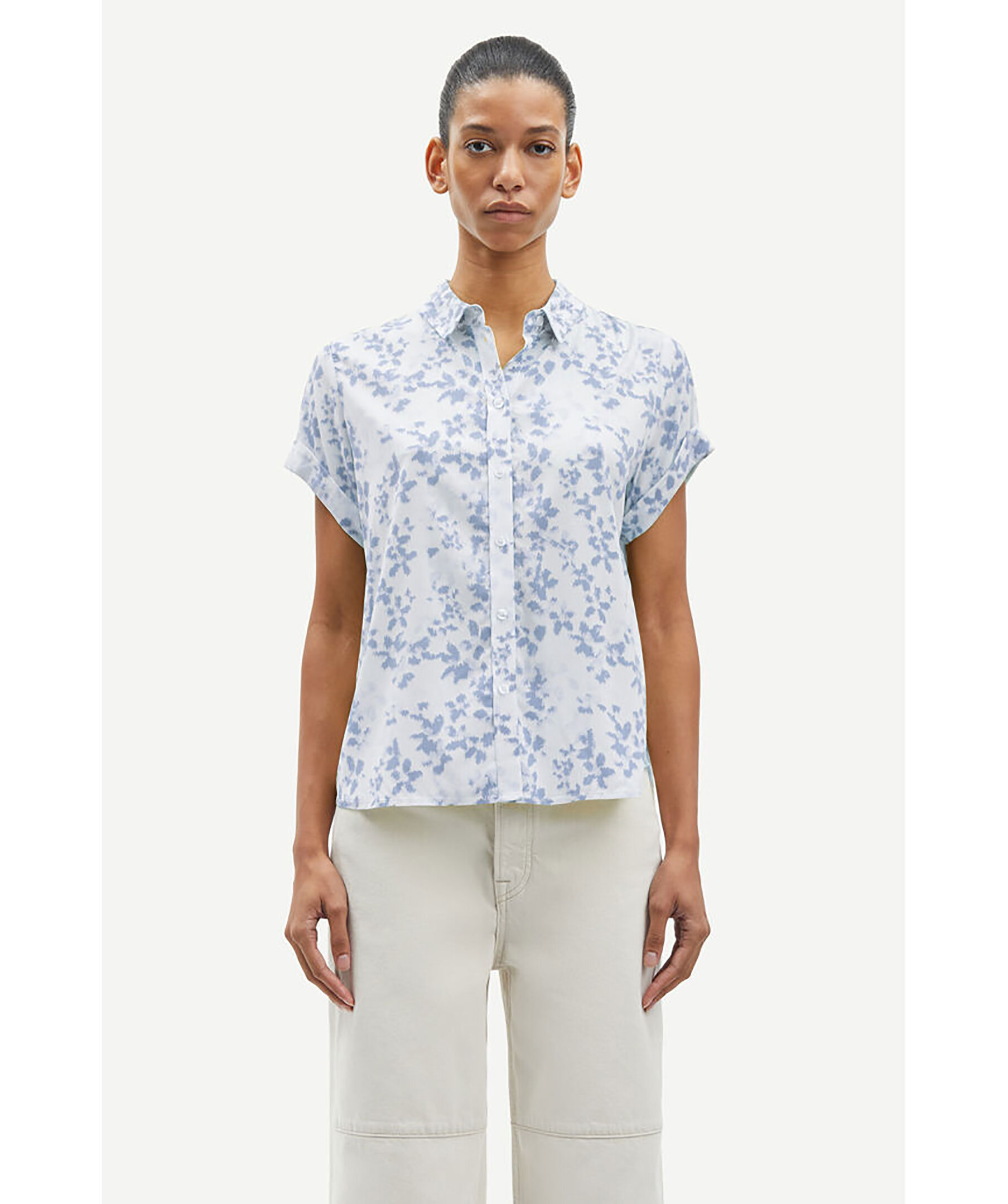 Ljusblå, mönstrad och kortärmad blus från Samsoe Samsoe. Upprullade ärmar och stängs med knappar hela vägen fram. Klassisk krage och en avslappnad passform. Tillverkad i en viskosblandning.
