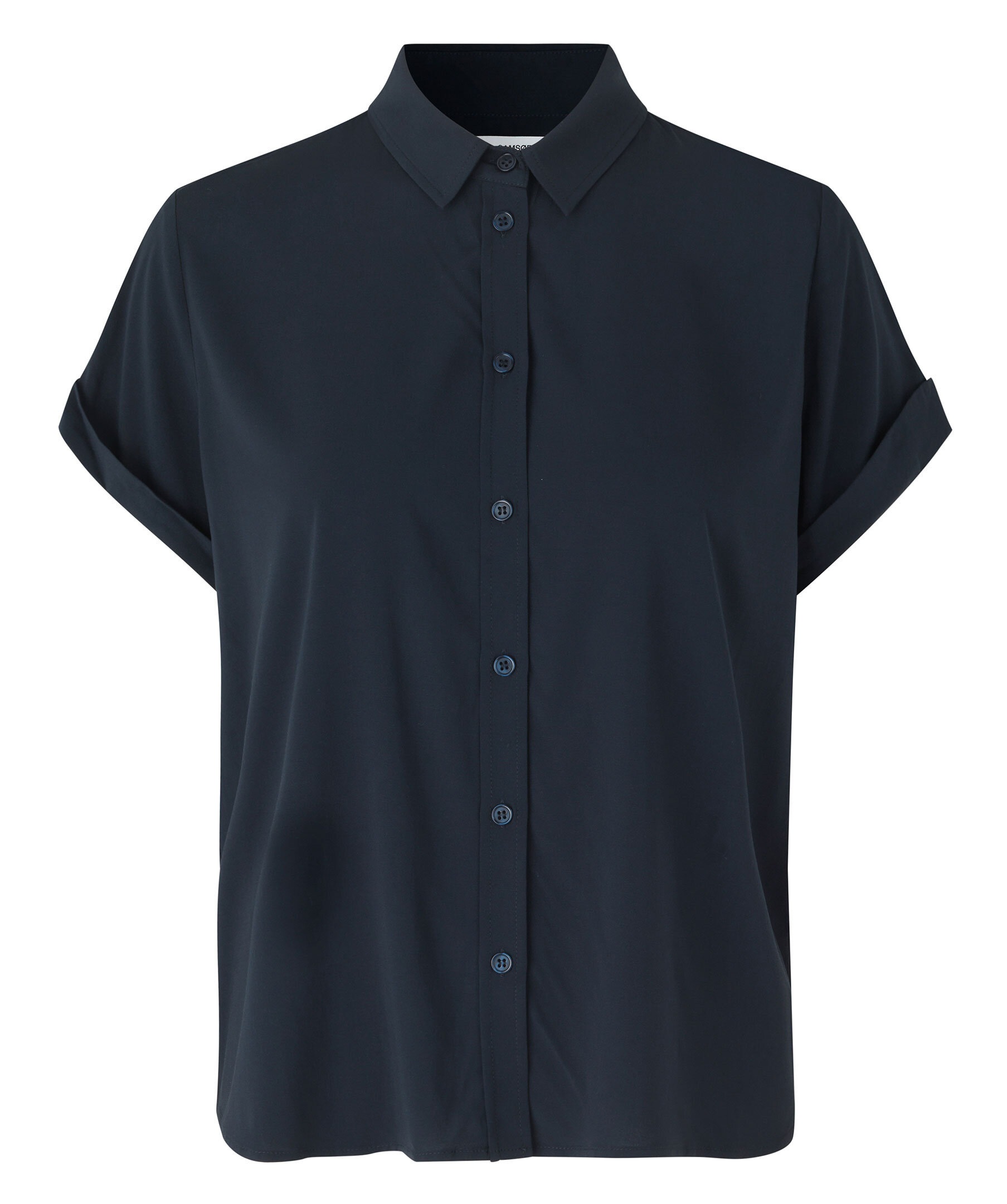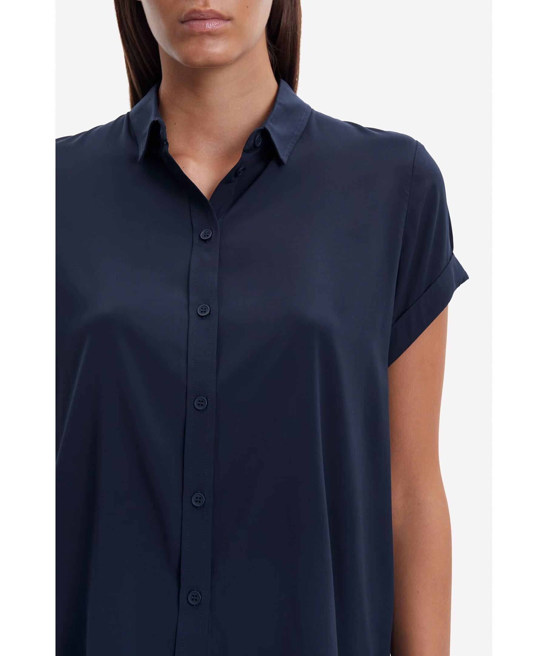 Mörkblå kortärmad skjorta med normal passform och knappstängning framtill från Samsoe Samsoe. Nackok med plisserade detaljer. Huvudmaterialet är en elastisk blandning av LENZING™ ECOVERO™ viskos. Denna produkt innehåller LENZING™ ECOVERO™ viskos, certifierad med EU Ecolabel för att uppfylla höga miljöstandarder. Modellen är 174cm lång och har på sig strl S.