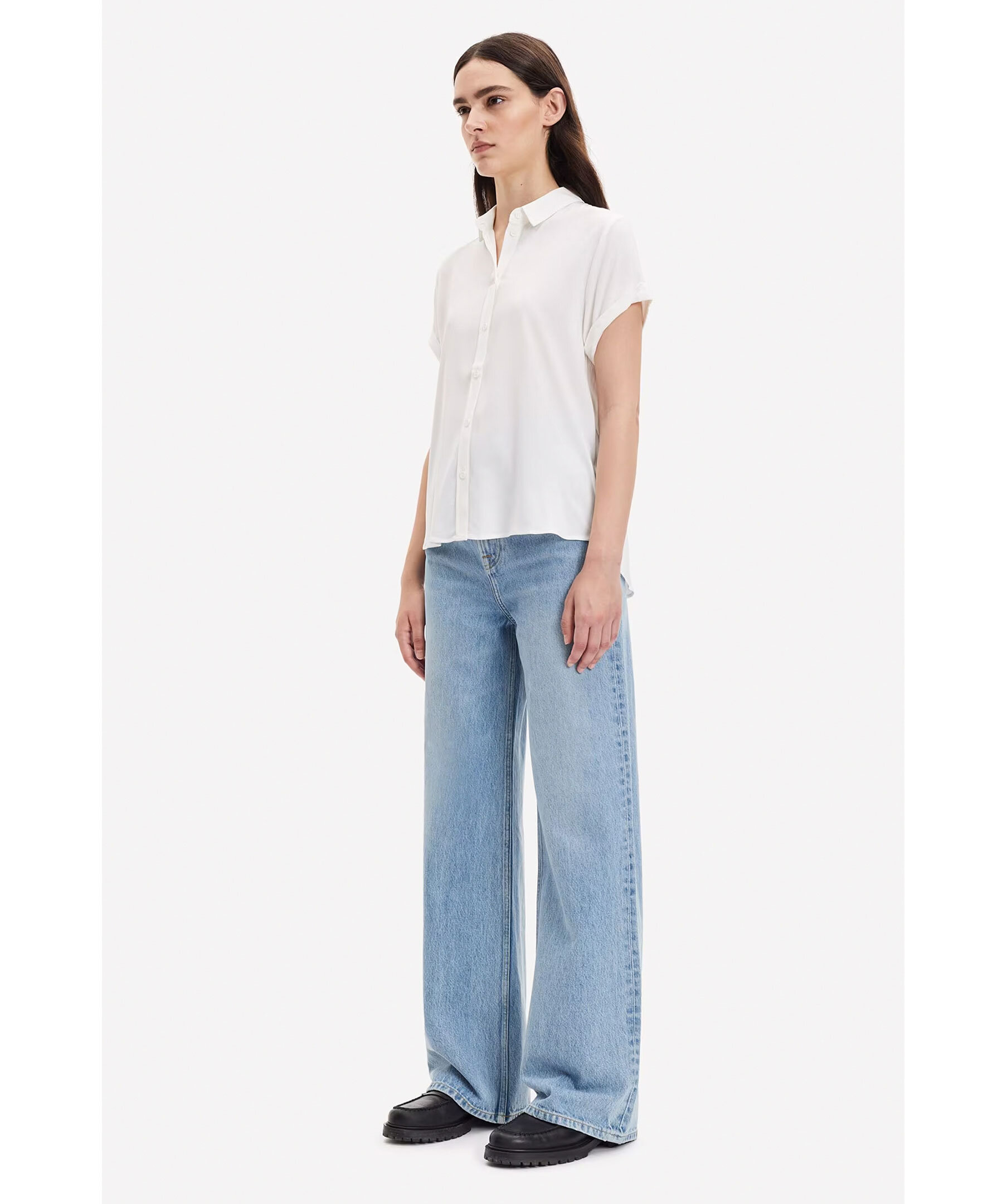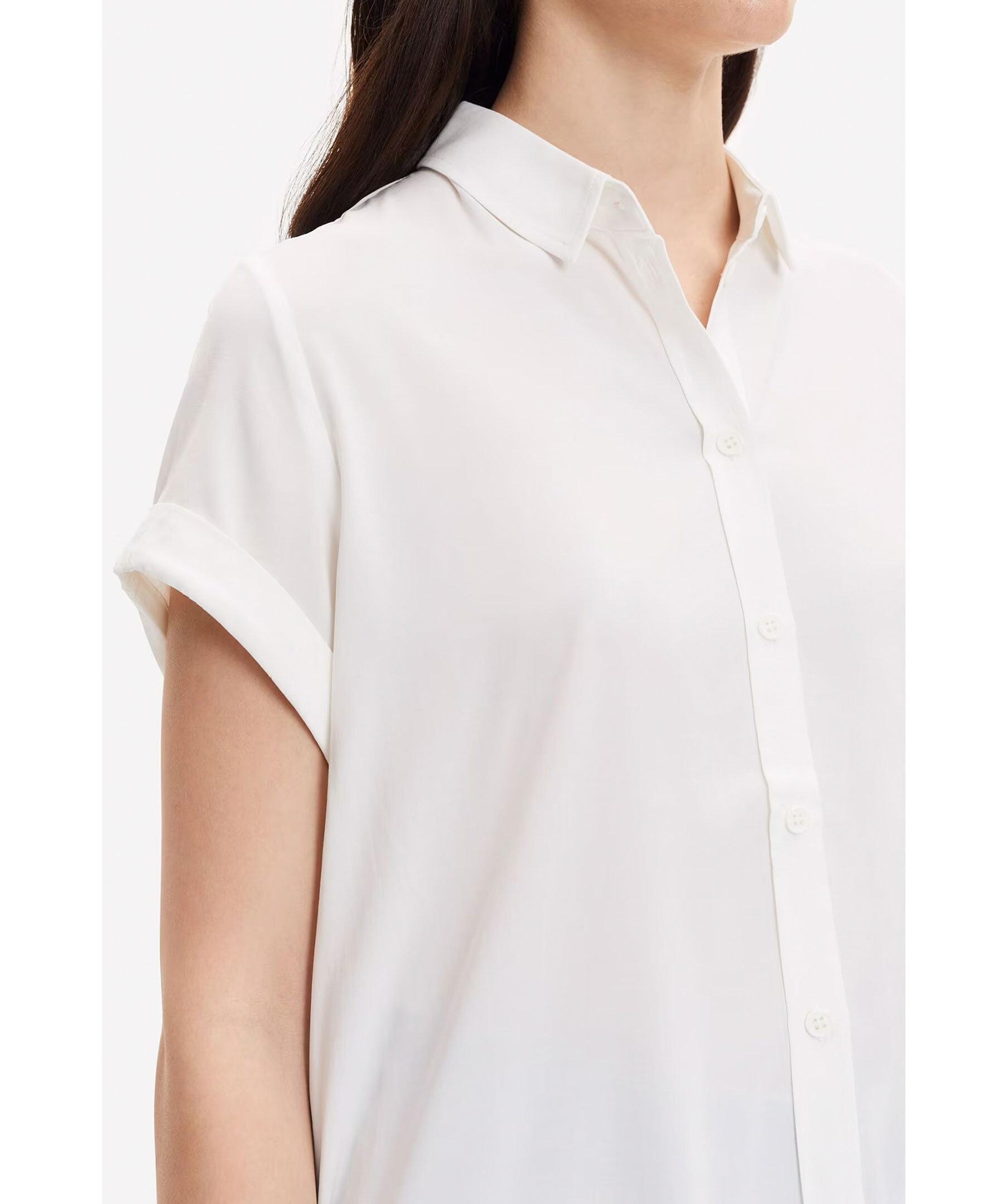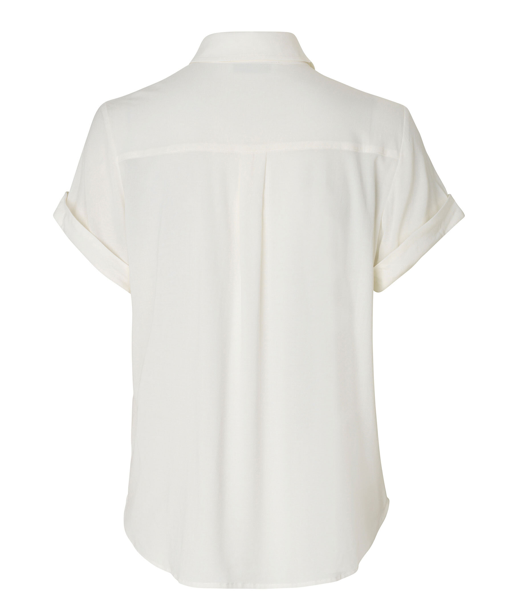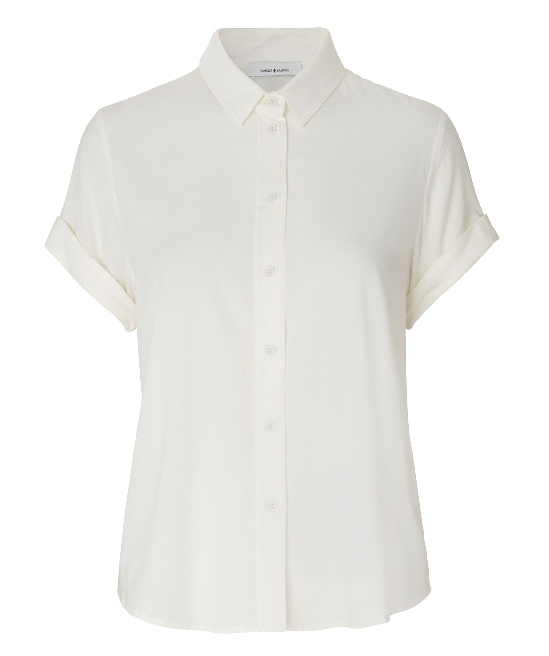 Vit kortärmad skjorta med normal passform och knappstängning framtill från Samsoe Samsoe. Nackok med plisserade detaljer. Huvudmaterialet är en elastisk blandning av LENZING™ ECOVERO™ viskos. Denna produkt innehåller LENZING™ ECOVERO™ viskos, certifierad med EU Ecolabel för att uppfylla höga miljöstandarder. Modellen är 174cm lång och har på sig strl S.