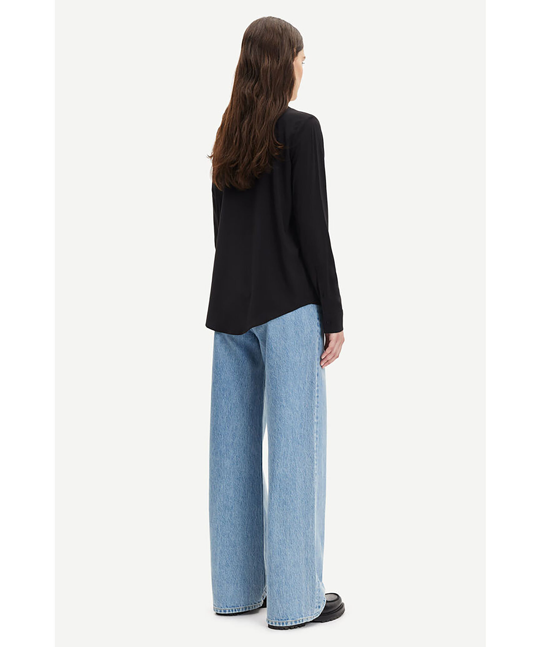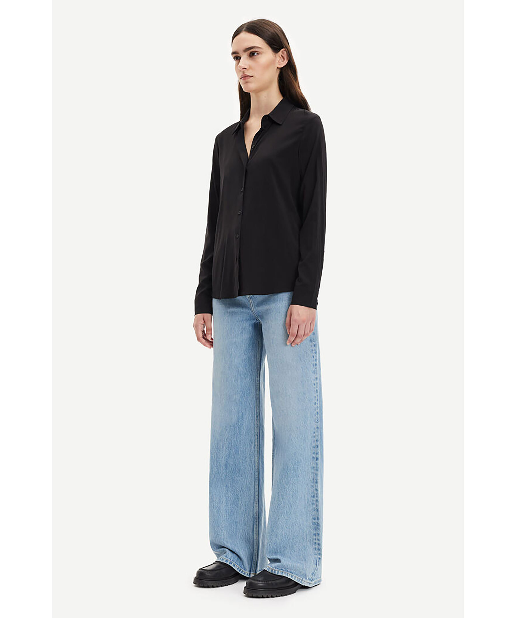 Svart skjorta med normal passform, långa ärmar och rundad fåll från Samsoe Samsoe. Spetsig krage och knäppning framtill samt vid manschetterna. Huvudmaterialet är vävt av en elastisk viskosblandning. Denna produkt innehåller LENZING™ ECOVERO™ viskos, certifierad med EU Ecolabel för att uppfylla höga miljöstandarder.
