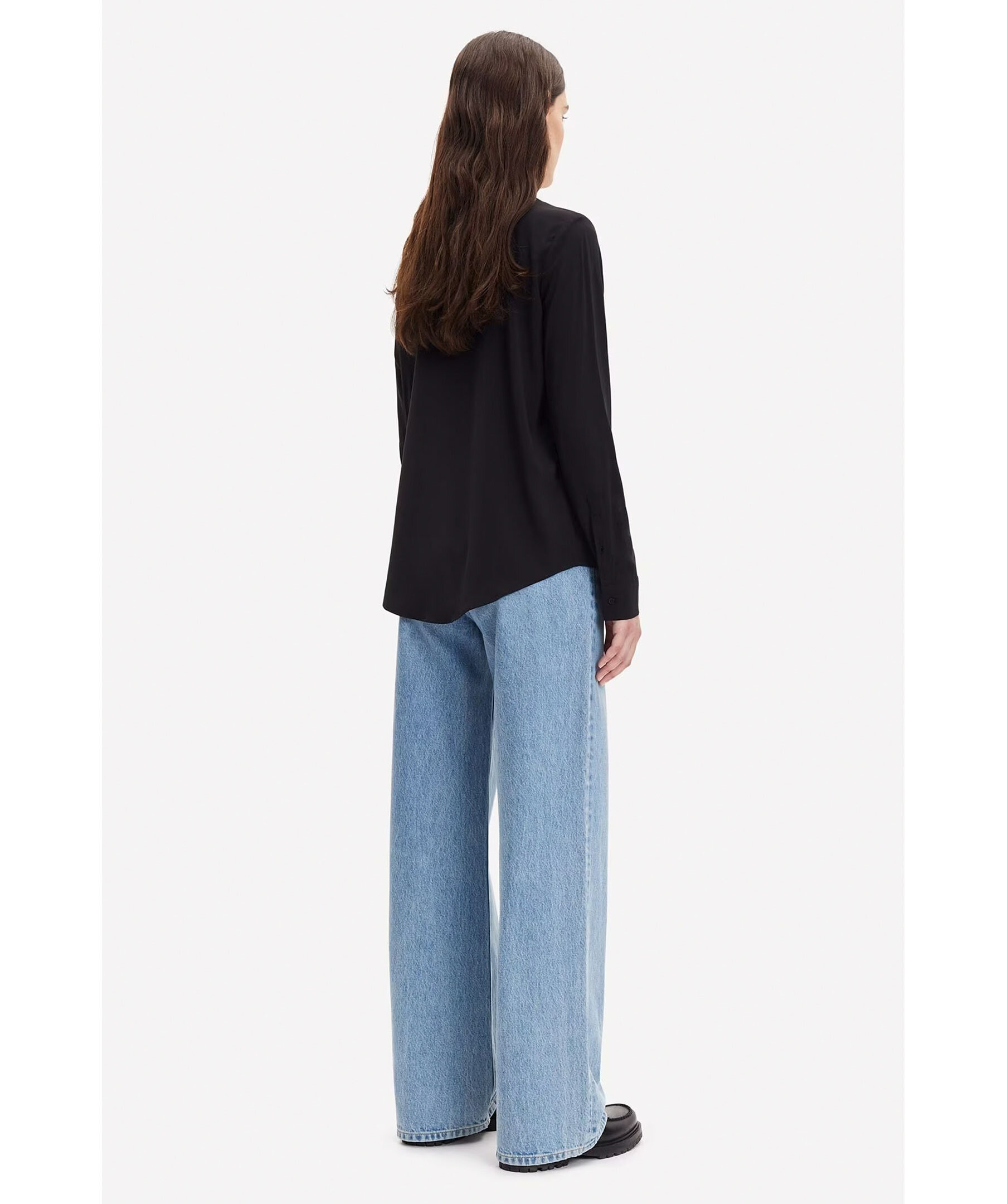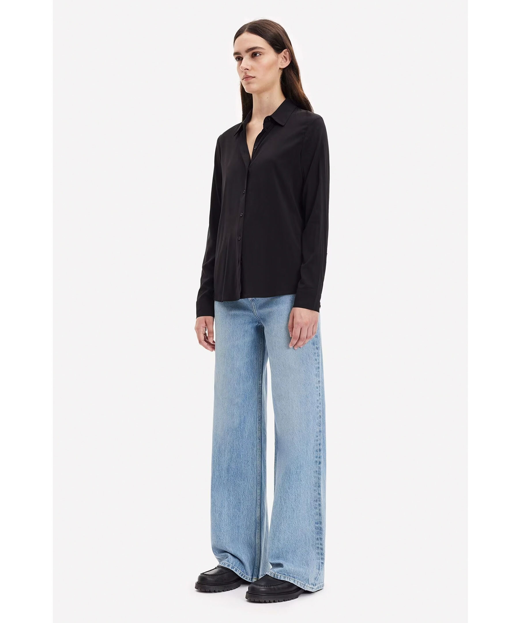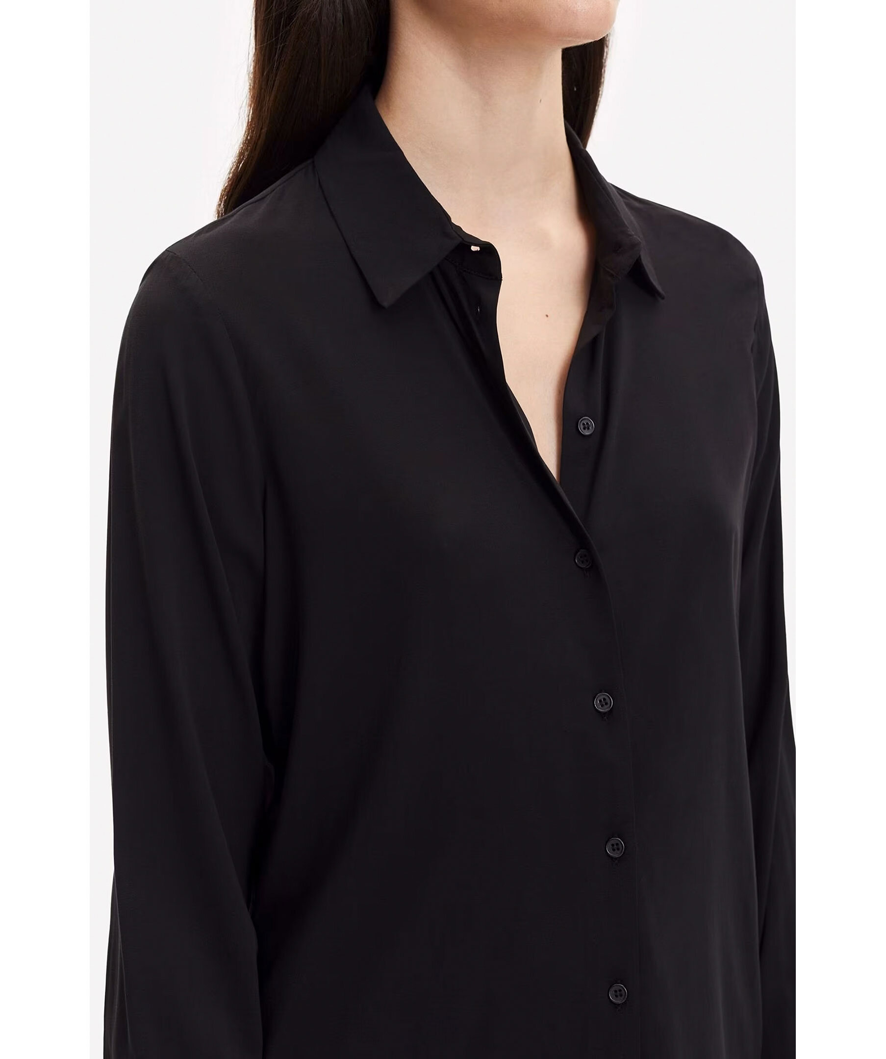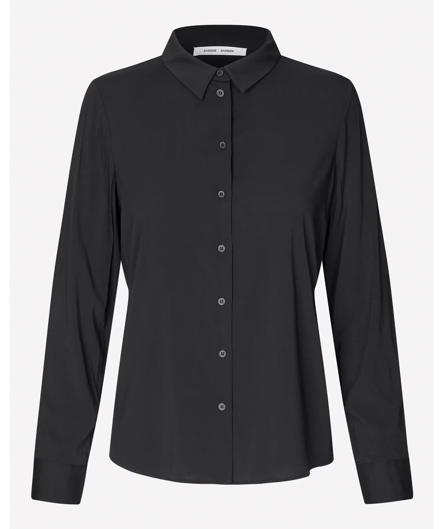 Svart skjorta med normal passform, långa ärmar och rundad fåll från Samsoe Samsoe. Spetsig krage och knäppning framtill samt vid manschetterna. Huvudmaterialet är vävt av en elastisk viskosblandning. Denna produkt innehåller LENZING™ ECOVERO™ viskos, certifierad med EU Ecolabel för att uppfylla höga miljöstandarder. Modellen är 176cm och har på sig strl S.