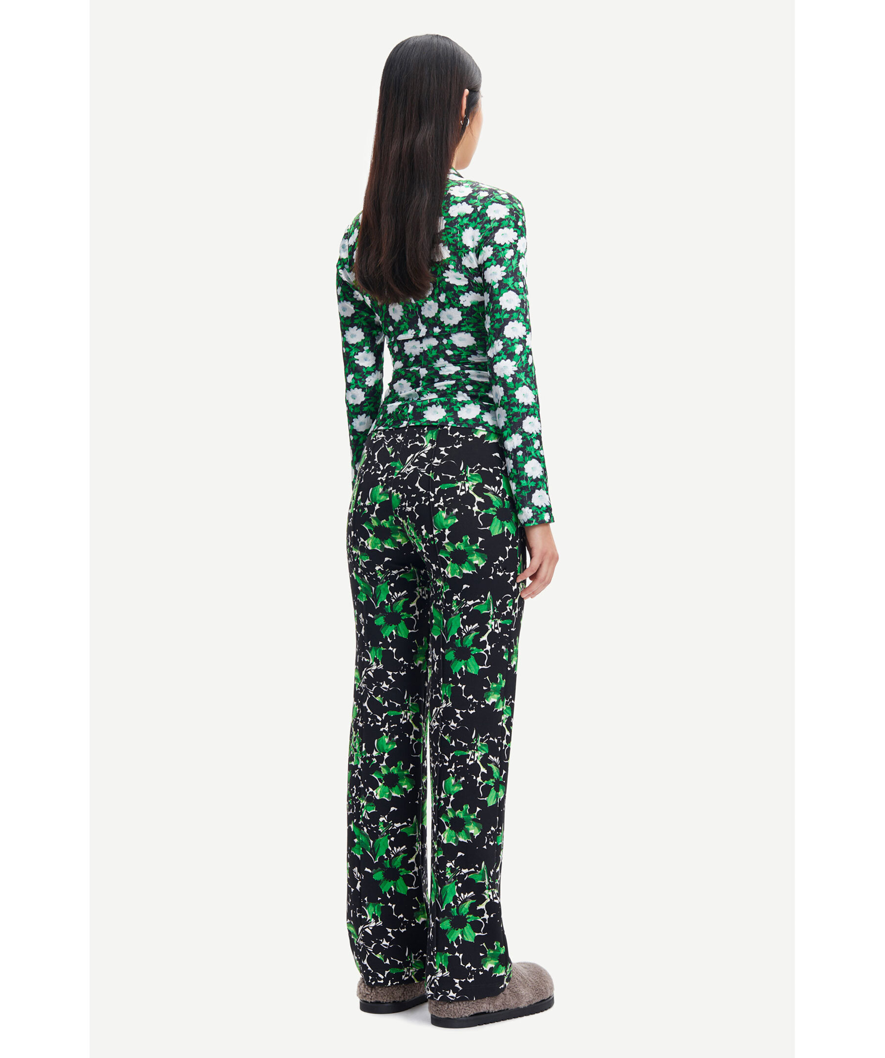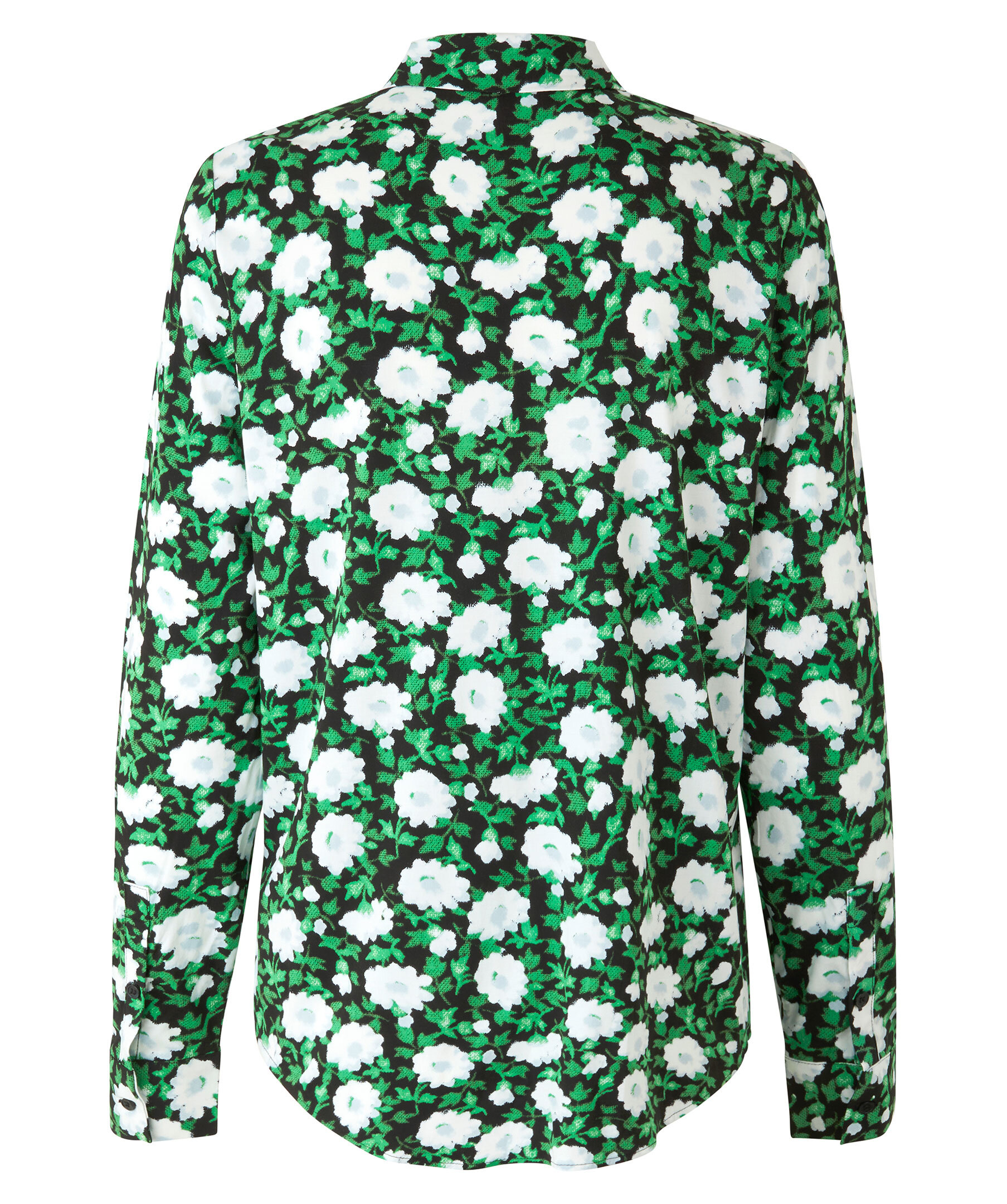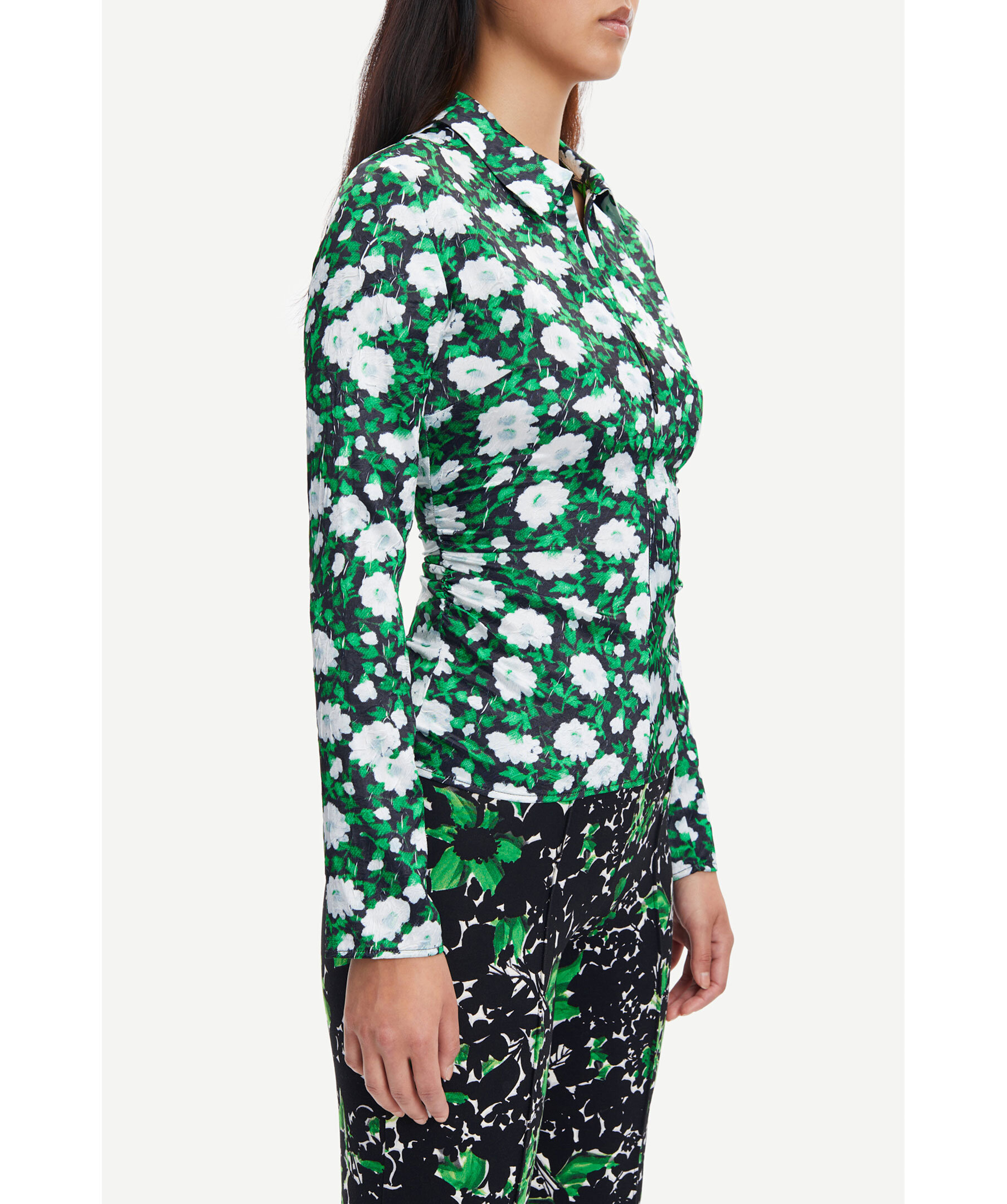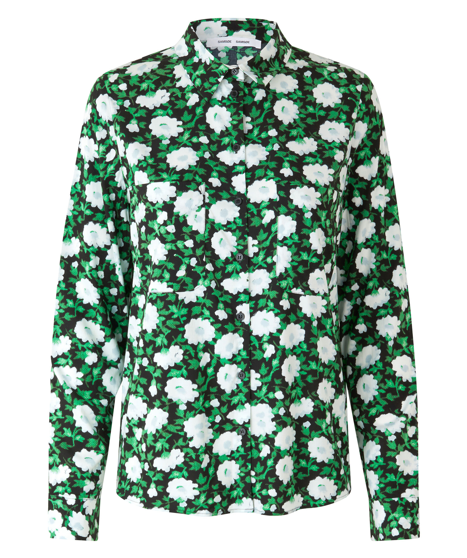 Skjorta med blommigt mönster från Samsoe Samsoe. Mönster i grönt, svart och vitt. Snygg spetsig krage, böjd fåll, bröstfickor och knäppning mitt fram samt i ärmslut. Tillverkad i Lenzing viskostyg vävt med extra stretch.