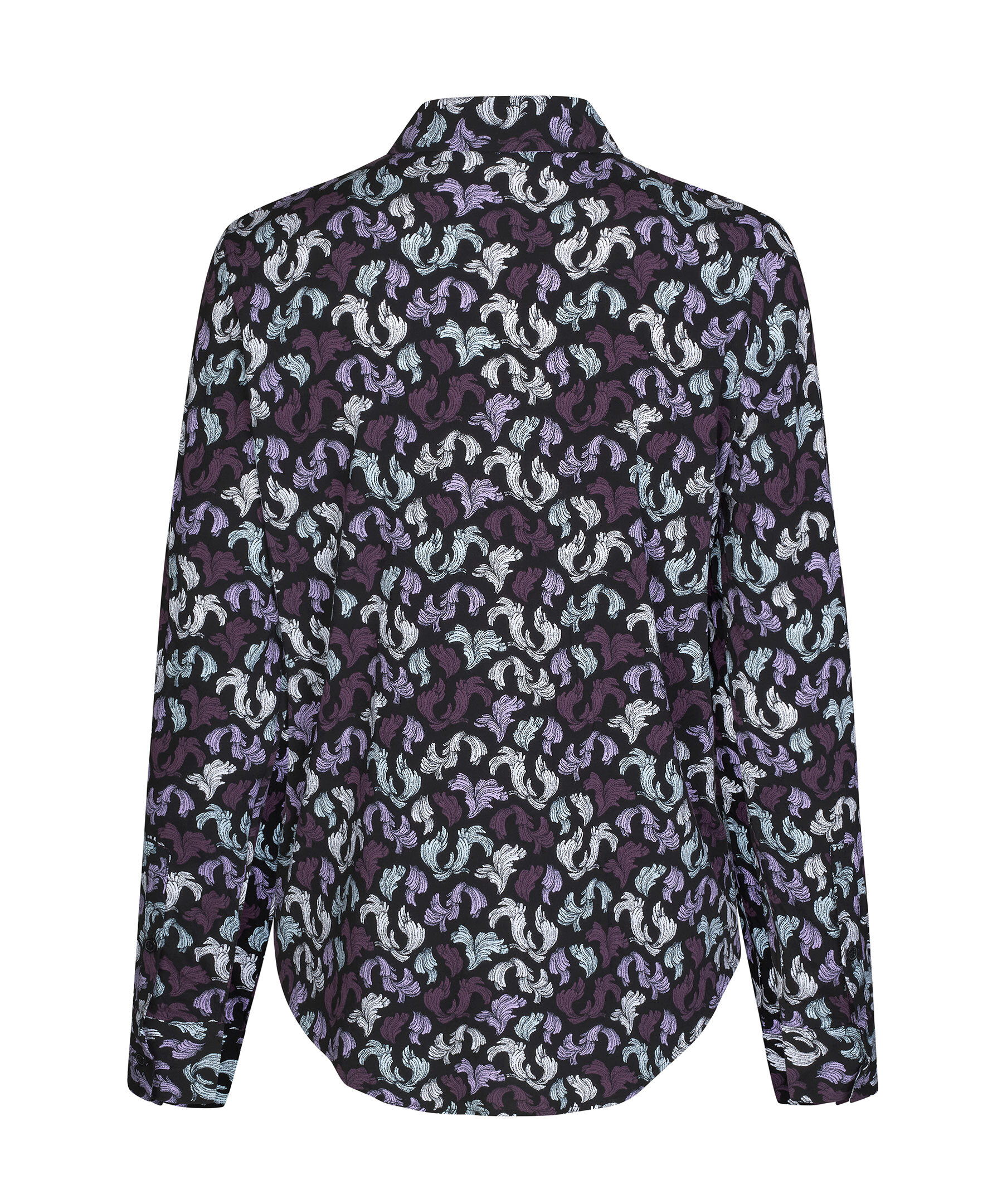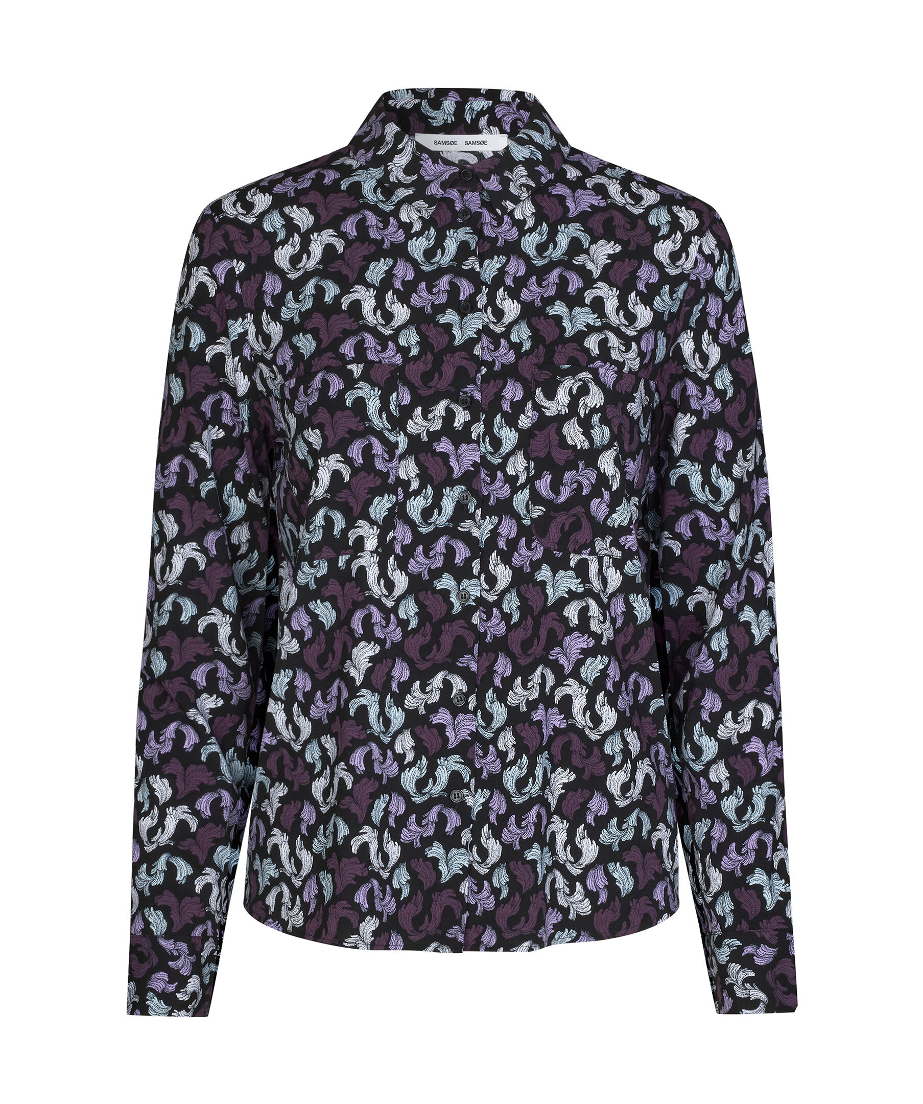 Svart långärmad skjorta från Samsoe Samsoe. Snygg spetsig krage, bröstfickor. Knäppning mitt fram och ärmslut. Böjd fåll. Lenzing viskostyg vävt med extra stretch. Tryckt konstmönster i lila.