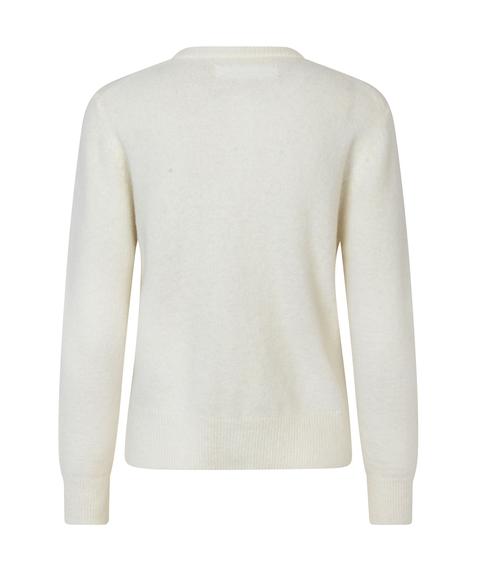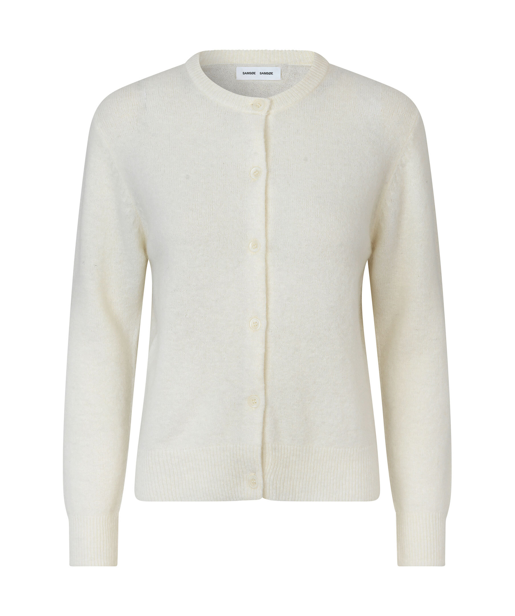 Krämvit kofta med normal passform och kortare silhuett Samsoe Samsoe. Knappstängning framtill. Ribbstickad krage, muddar och nederkant. Huvudmaterialet består av en elastisk blandning med ull och alpackaull. Denna produkt är RWS-certifierad, vilket garanterar att djurvälfärd och markförvaltning uppfyller höga krav från gård till färdig produkt