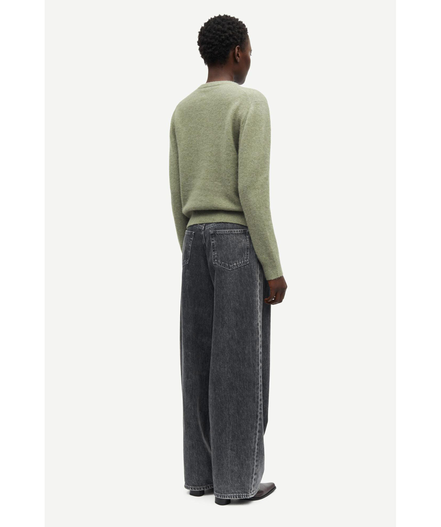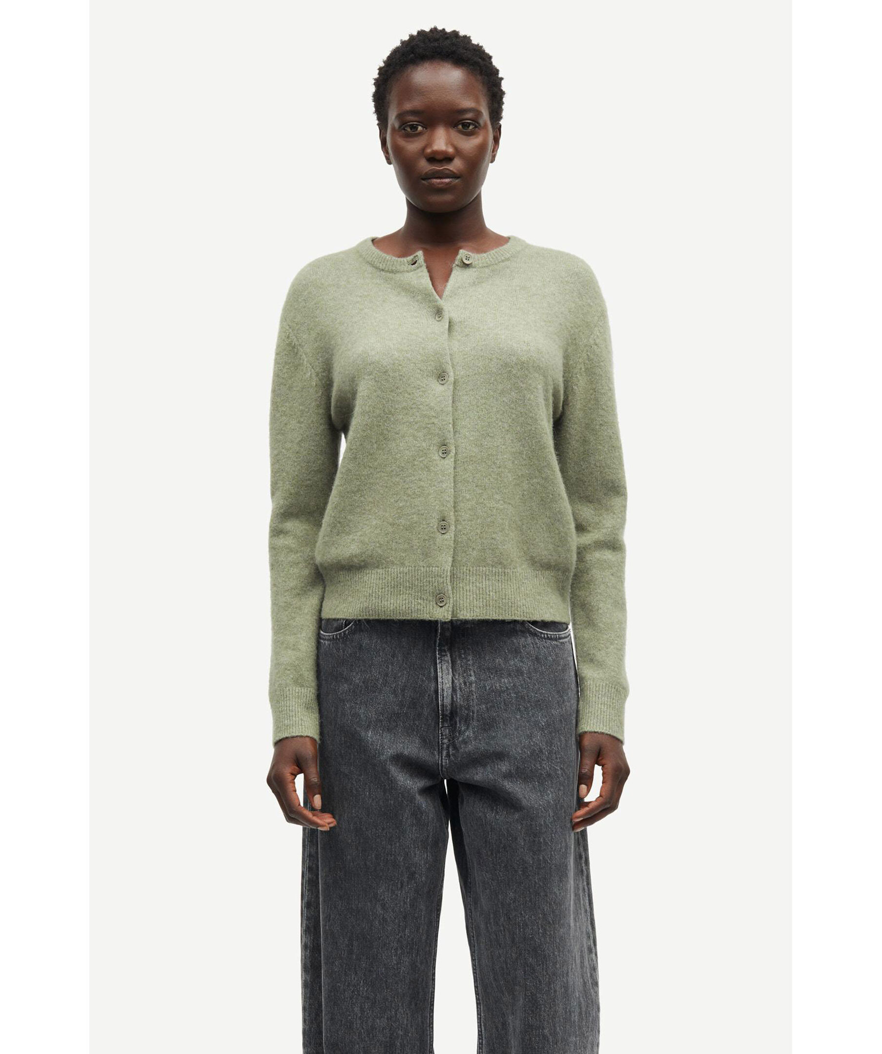 Grön melerad kofta från Samsoe Samsoe. Koftan har en croppad siluett, stängs med knappar fram och har ribbstickad ärm- och tröjslut. Ribbstickad rundad halsringning. Tillverkad av en ullblandning.