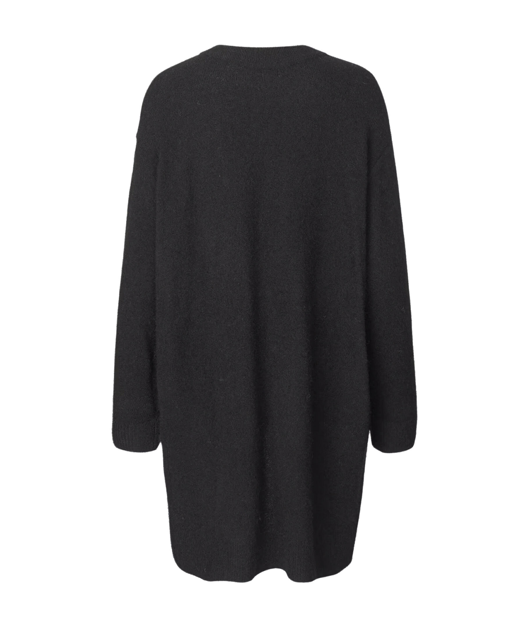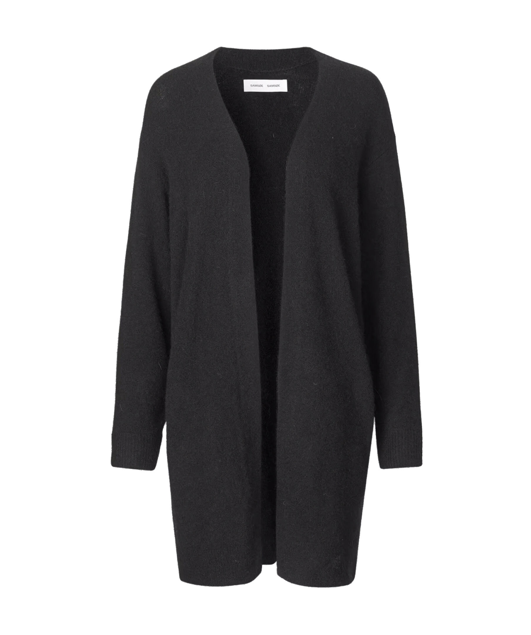 Svart, lång, öppen kofta från Samsoe Samoe. Stickad i en ullblandning och har en mjuk och fluffig look. Ribbade muddar i ärmslut och plaggslut.