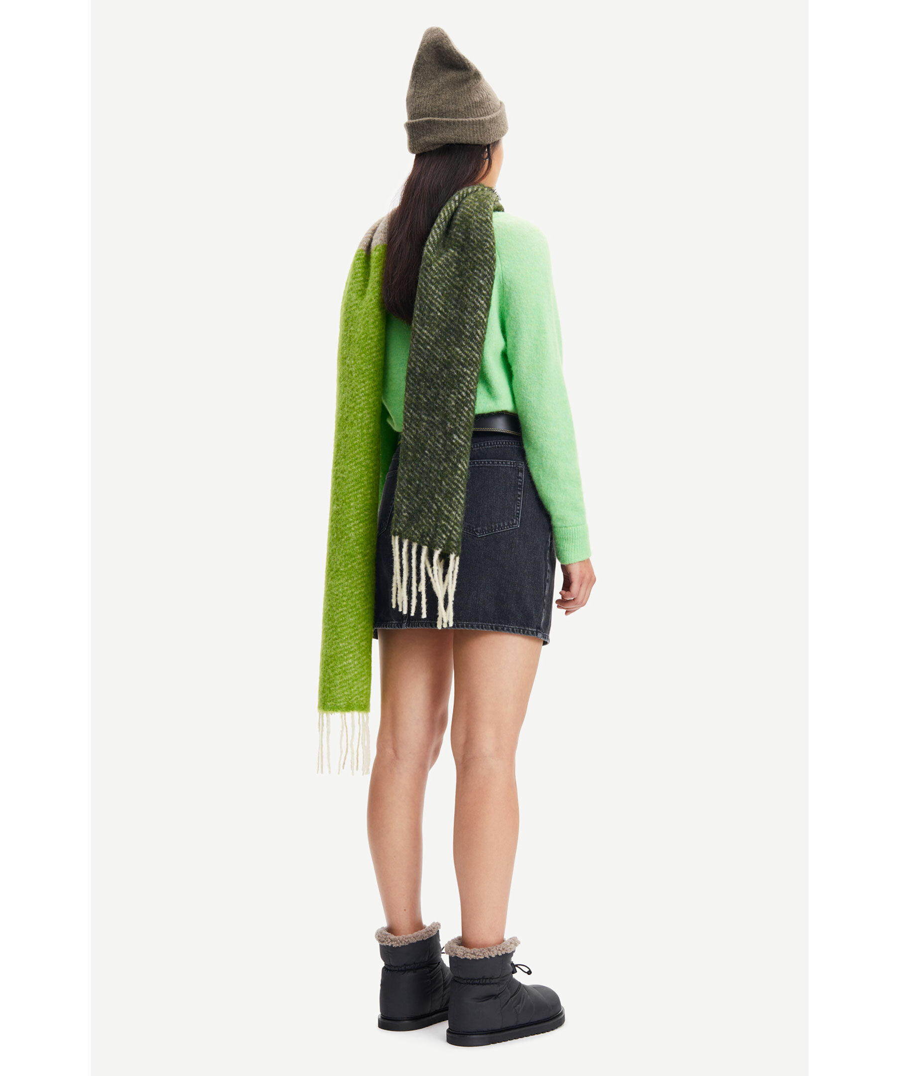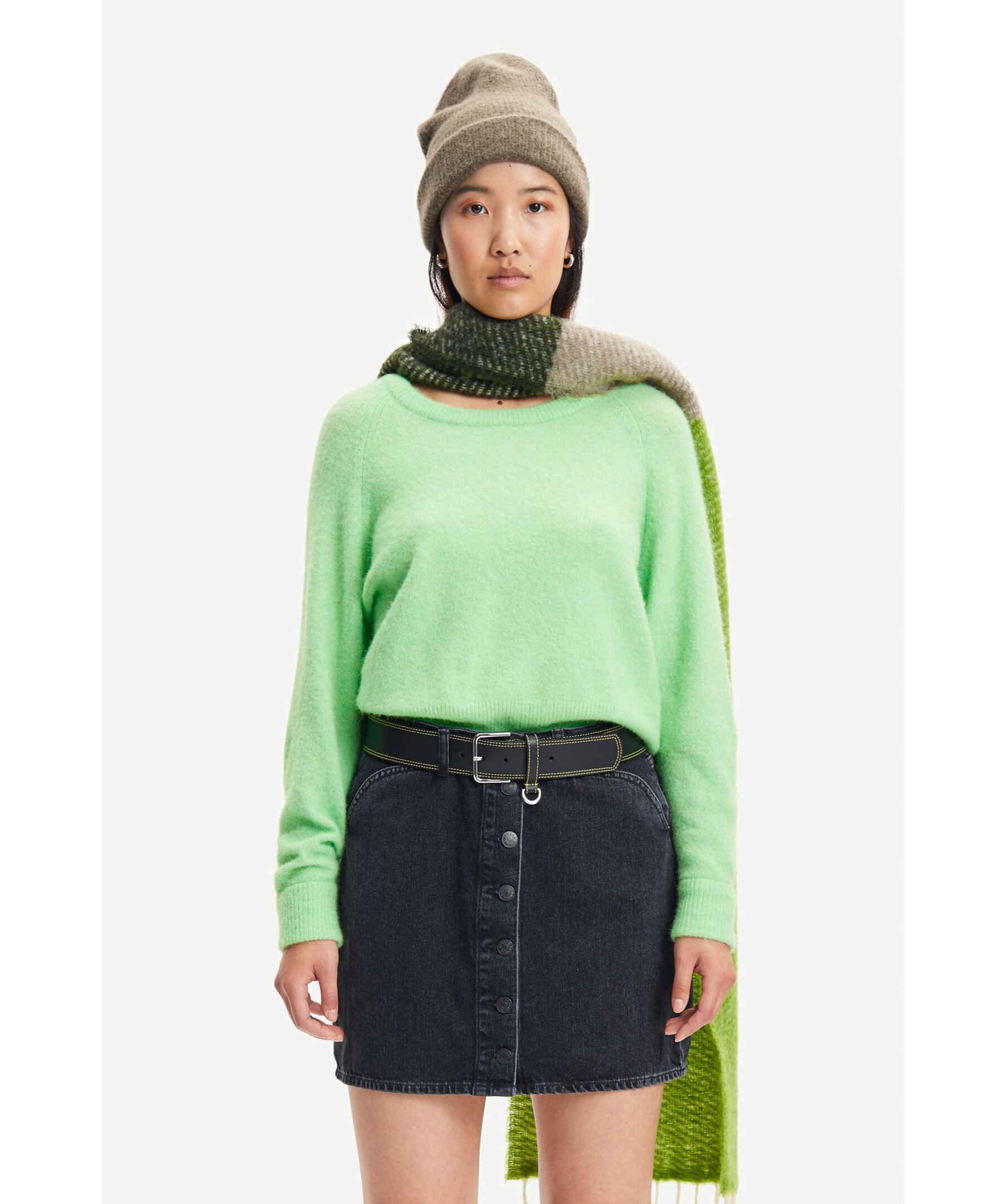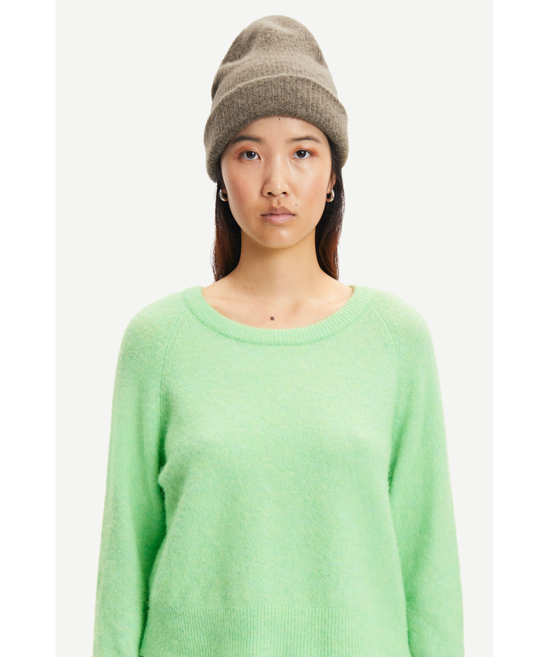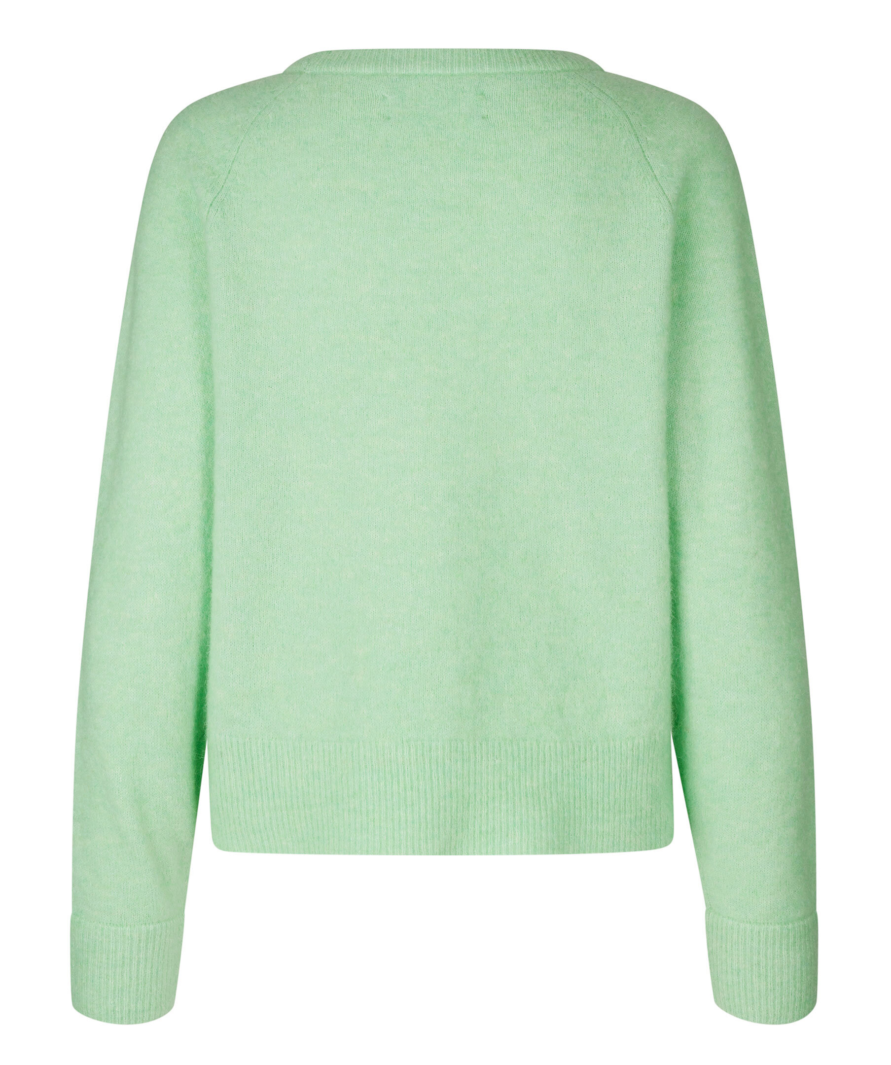 Ljusgrön finstickad tröja från Samsøe Samsøe. Tillverkad i en merinoull och alpacka blandning. Rundad krage och ribbade muddar i ärmslut, halsring och plaggslut. Längden baktill i storlek S är 51cm.