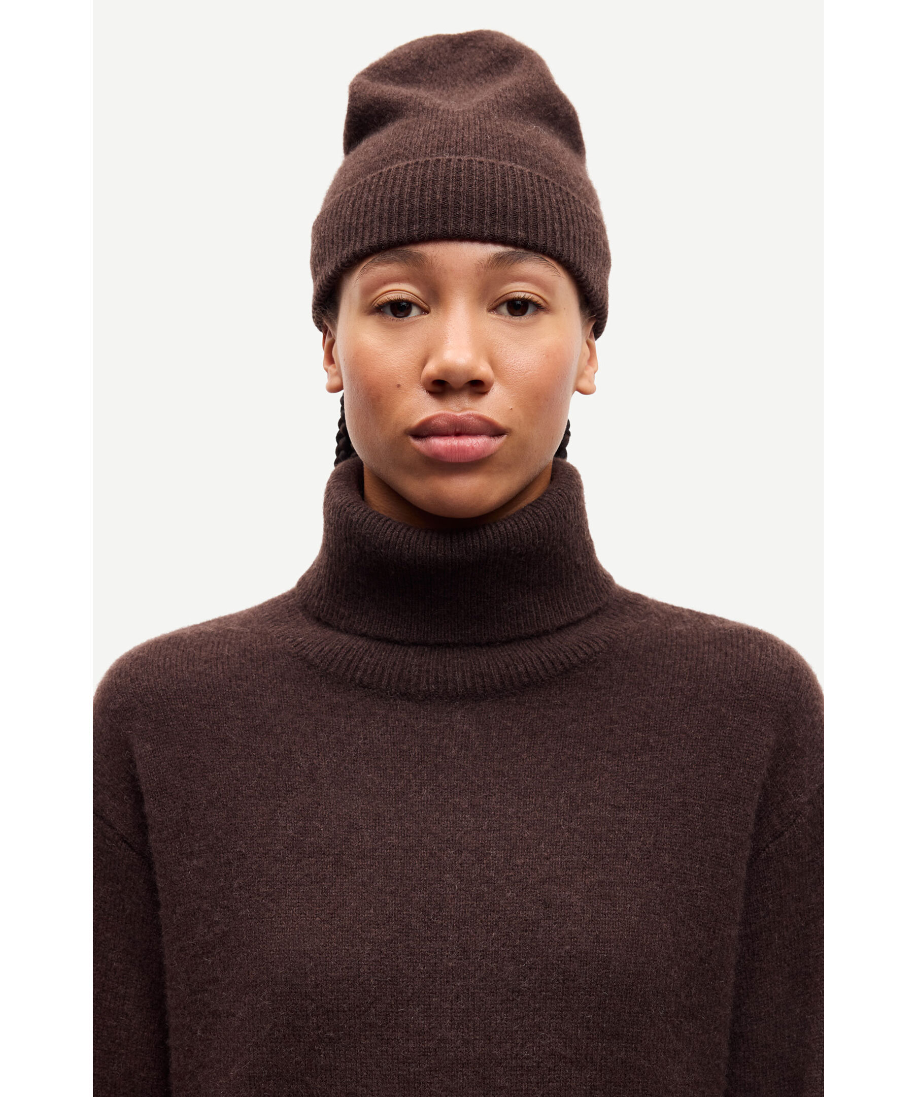 Mörkbrun, ribbstickad mössa från Samsoe Samsoe. Mössan har en bred, uppvikt kant och är tillverkad i en ullblandning.