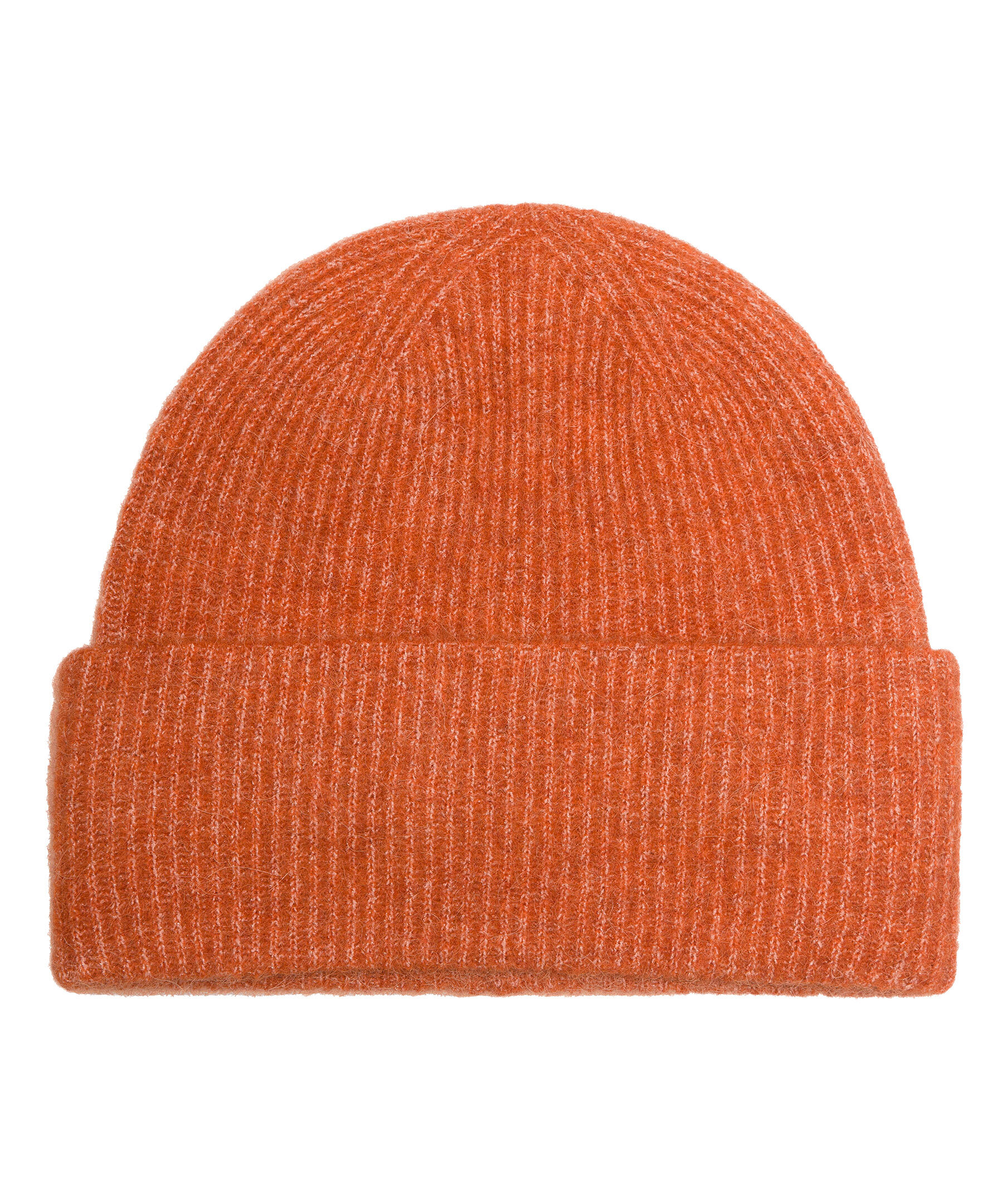 Rostfärgad, ribbstickad mössa i ullmix. Uppvikt kant.