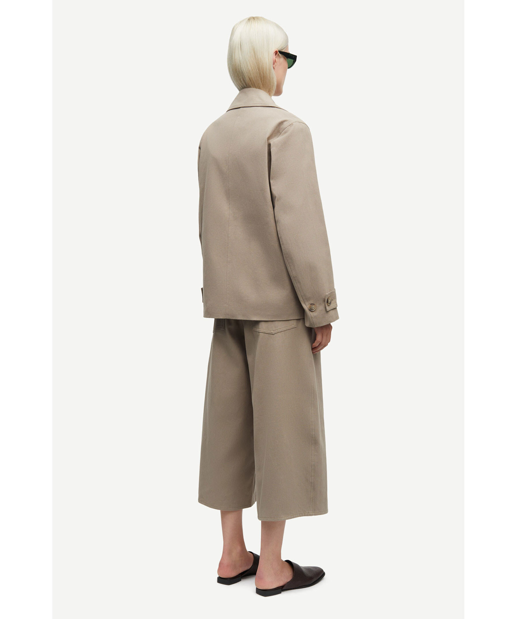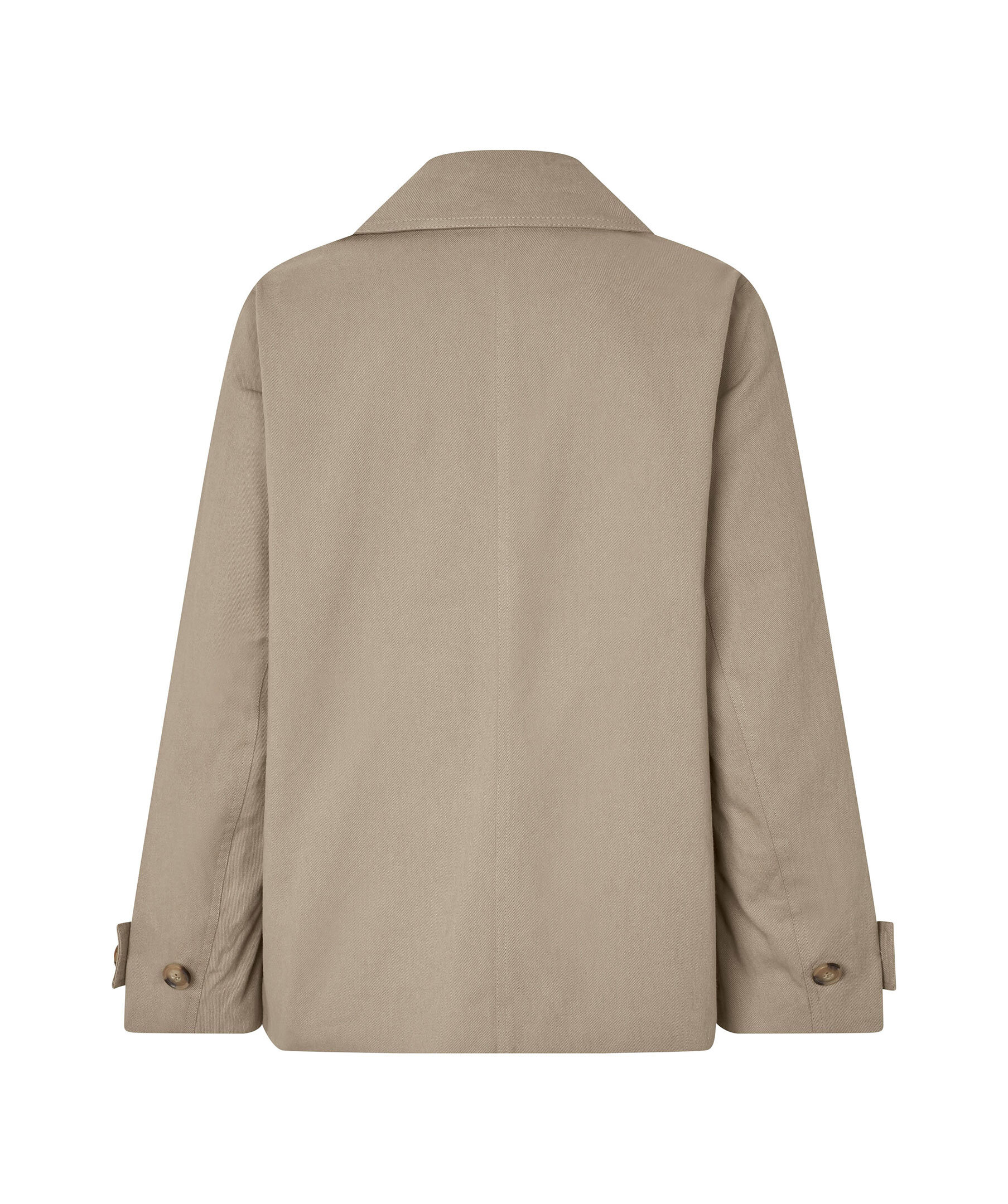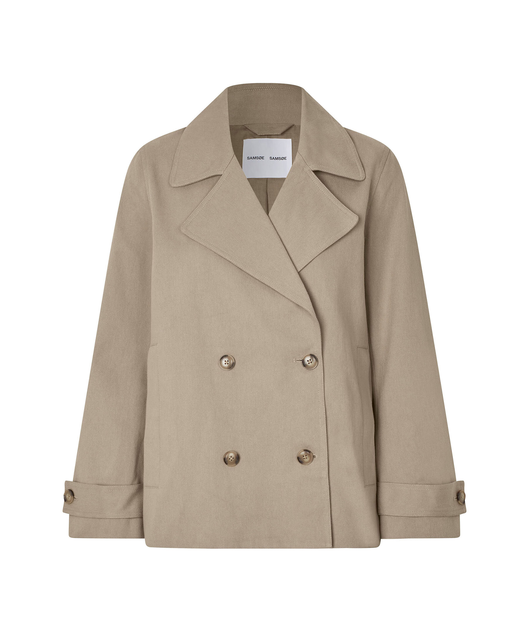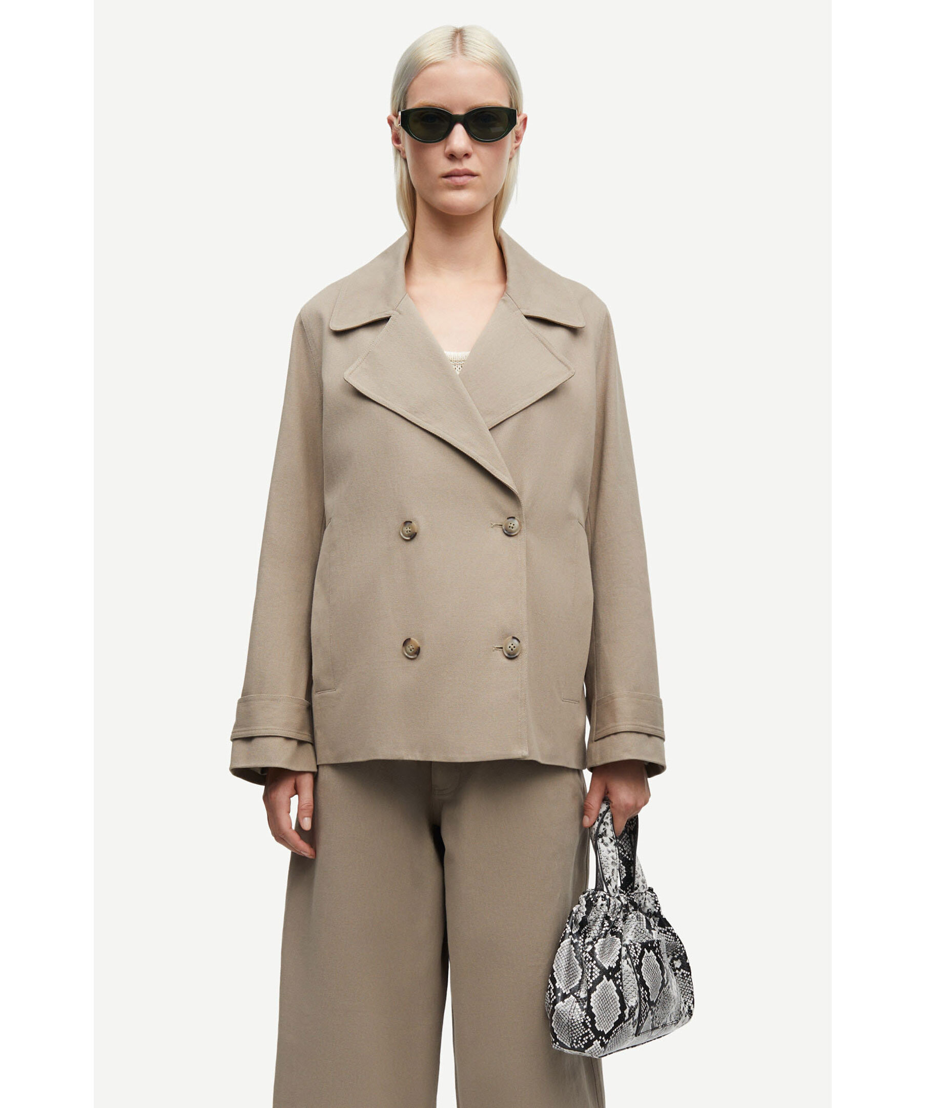 Greige, kort kappa från Samsoe Samsoe. Stängs med dubbelknäppt knäppning framtill och har justerbara ärmslut, skårat slag, passpoalfickor framtill och passpoalficka med knapp på insidan. Helfodrad. Tillverkad i bomull.