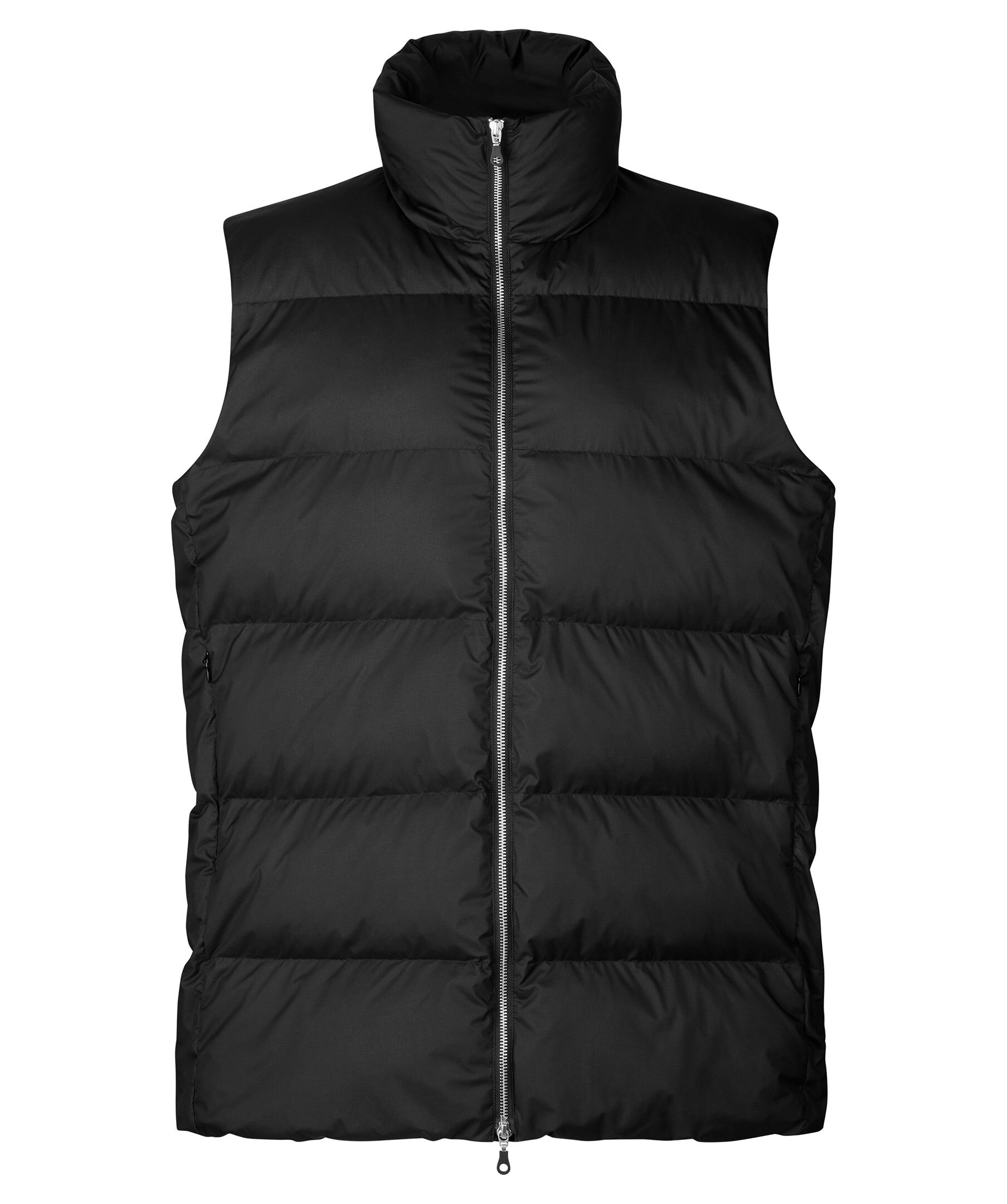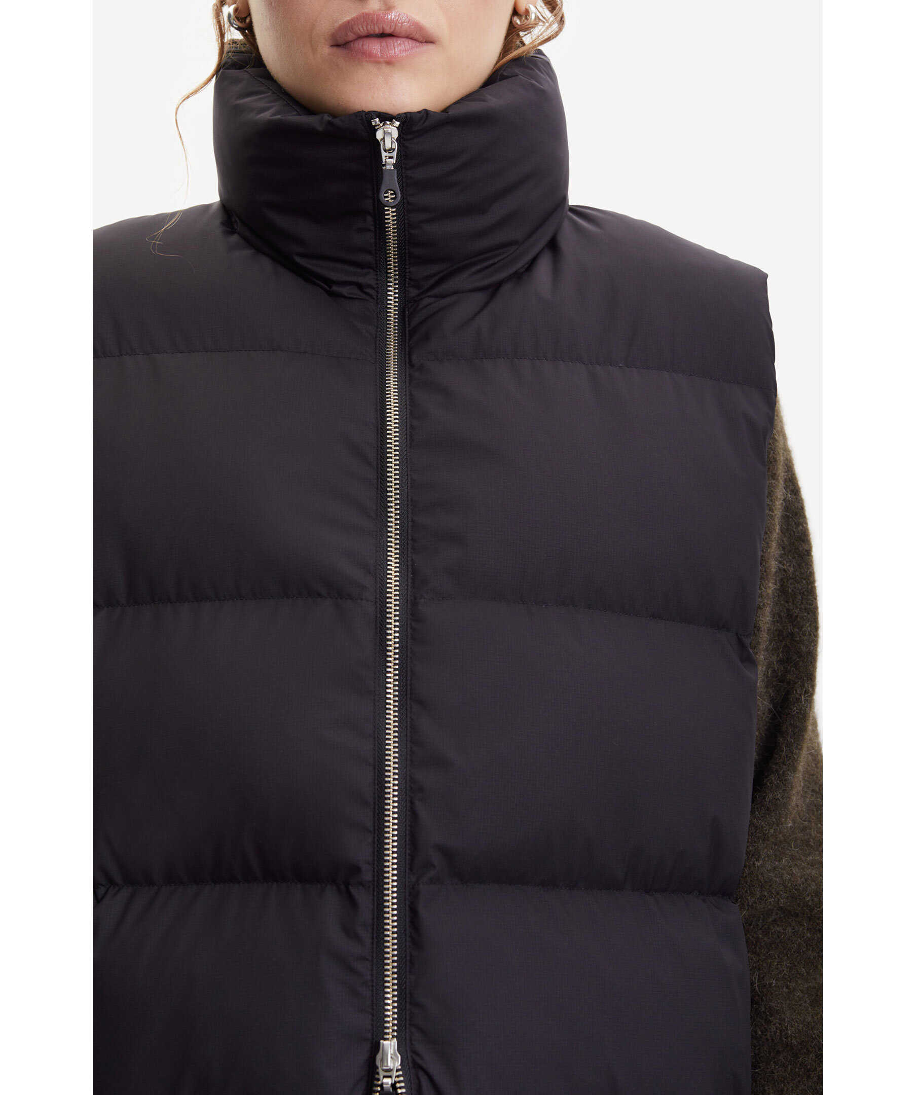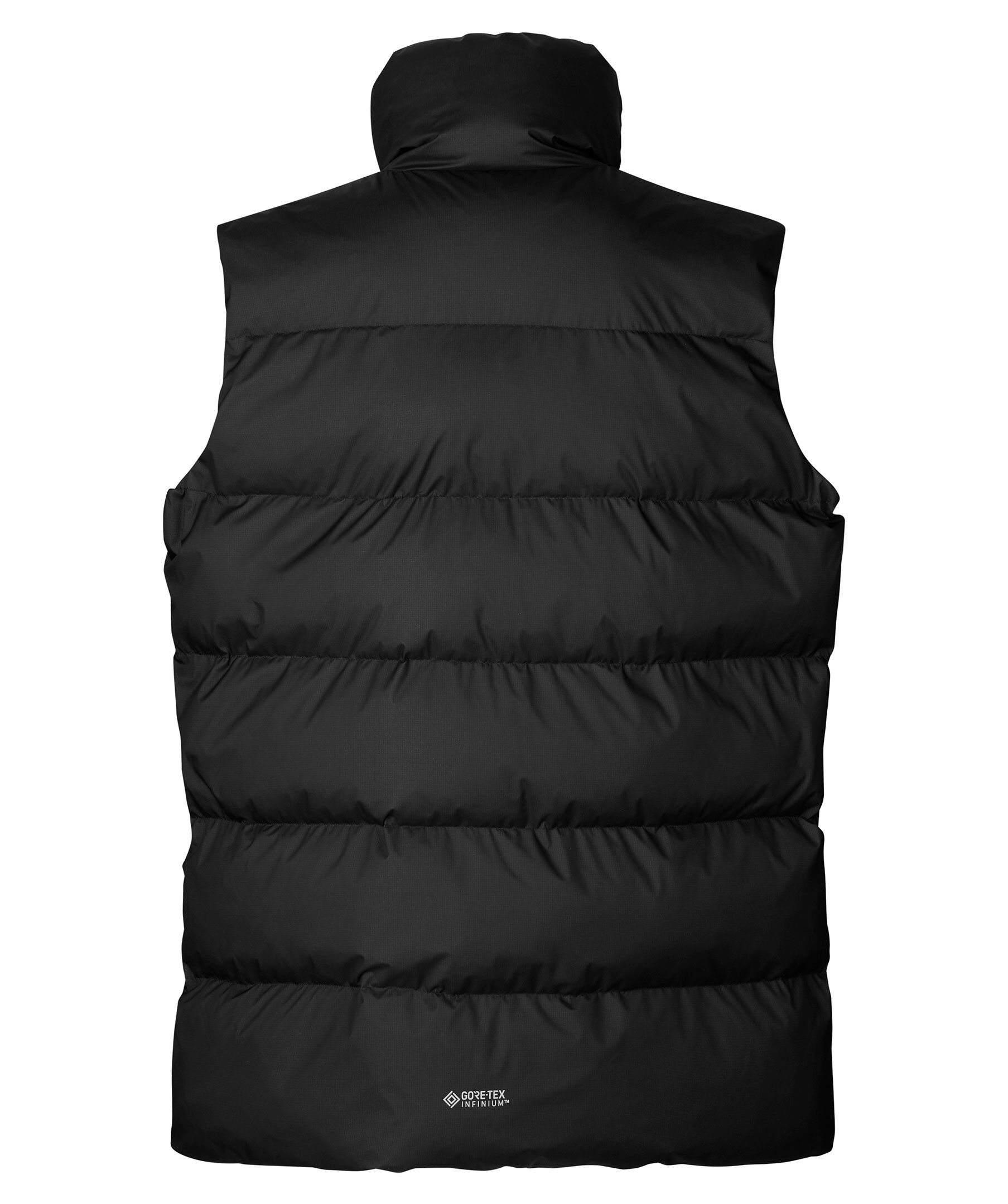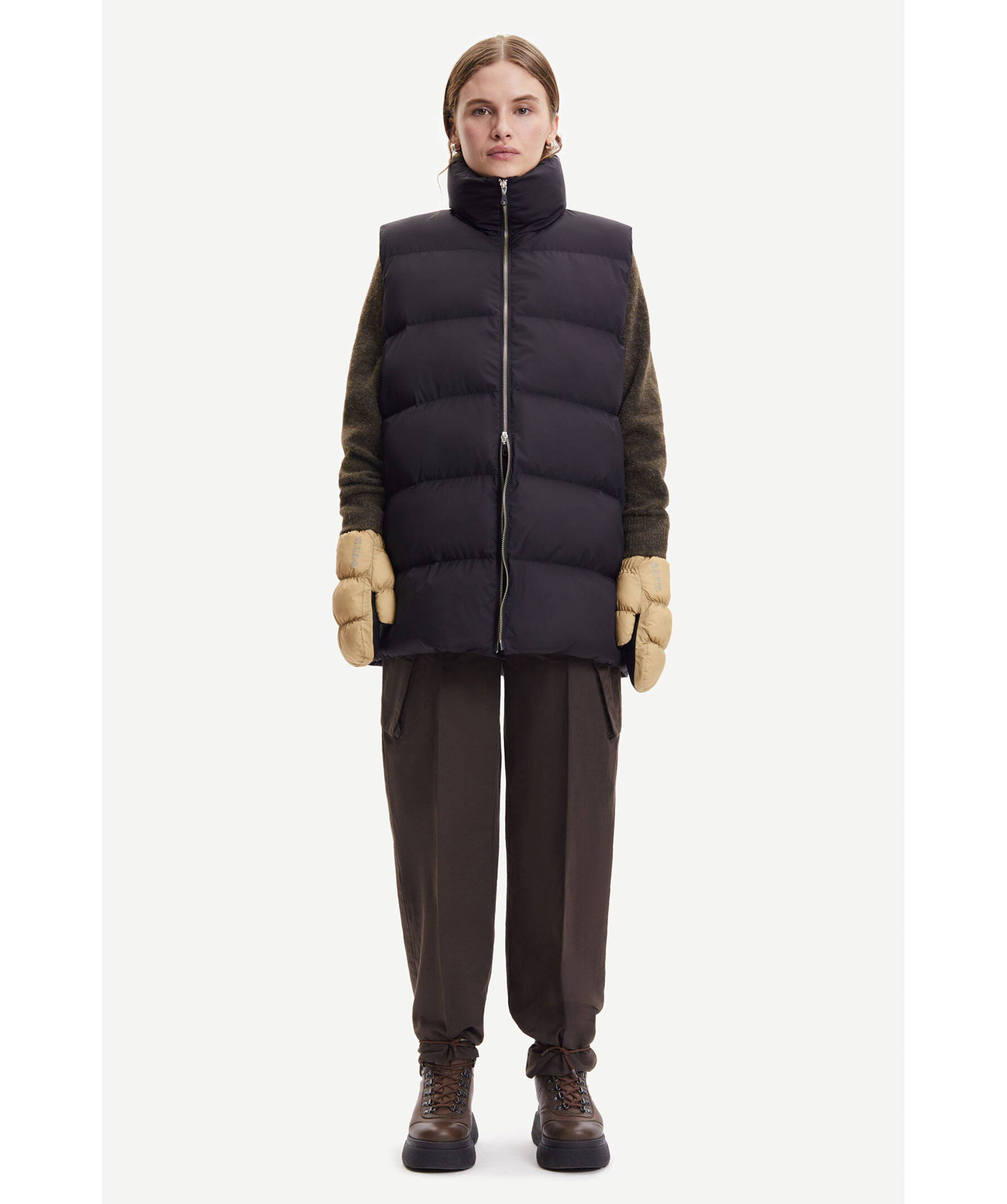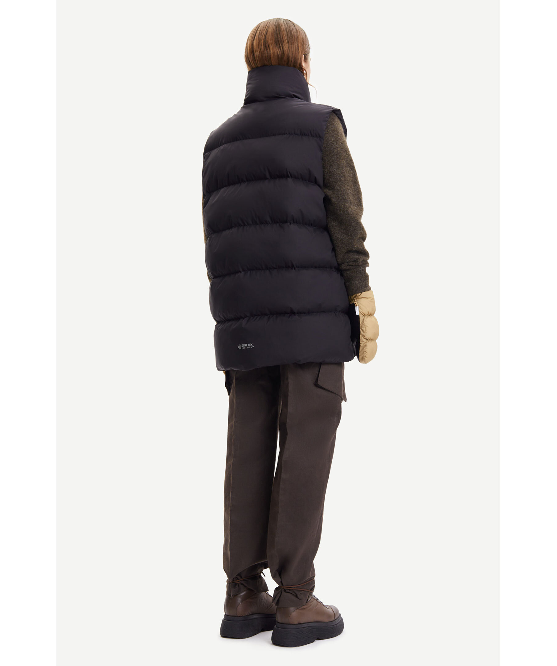 Svart vadderad väst från Samsøe Samsøe. Hög krage, tvåvägsdragkedja, fickor fram som stängs med dragkedjor. Vatten- och vindresistent yttertyg i Gore-Tex Infinium teknik. Gore-Tex branding baktill.
