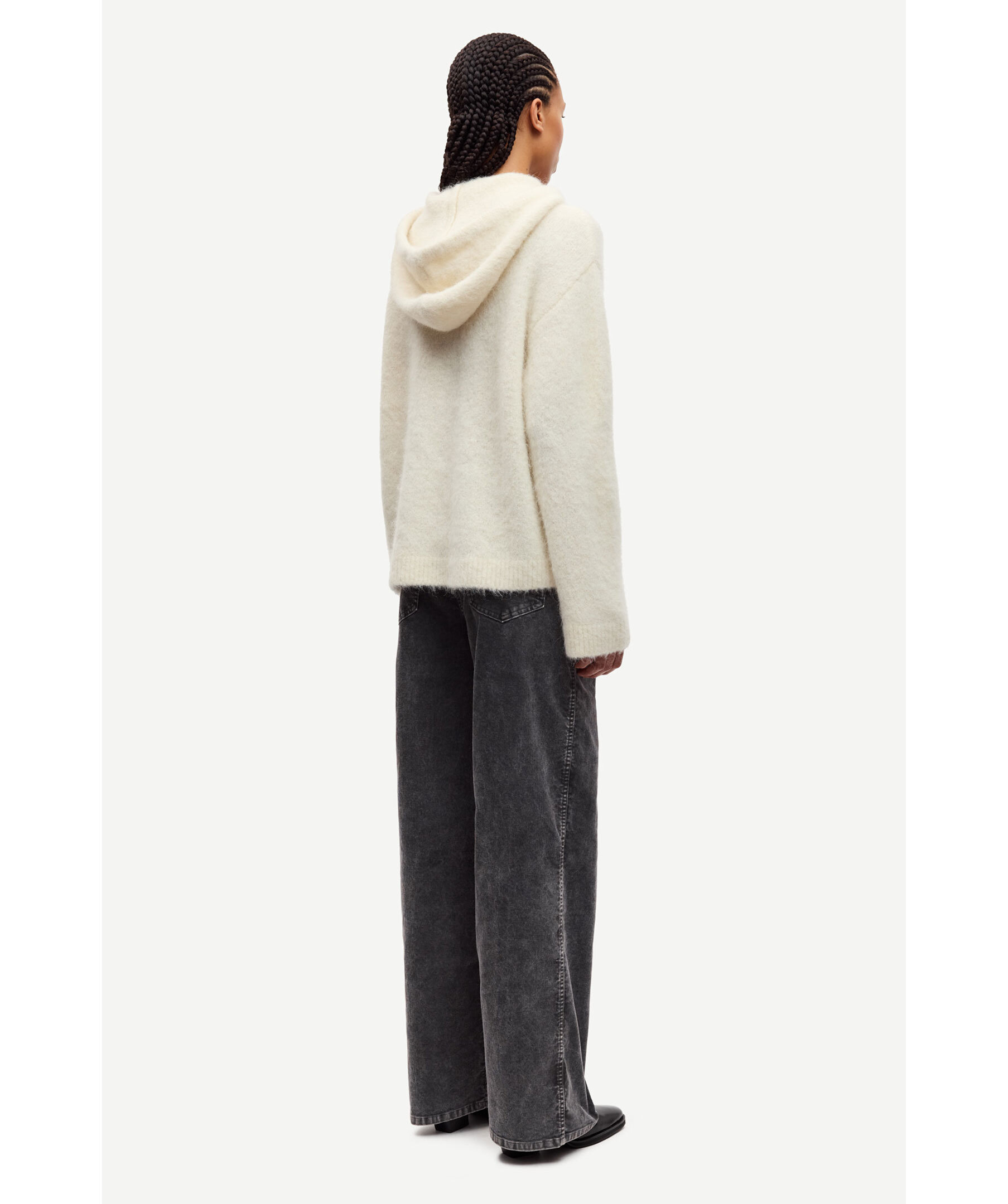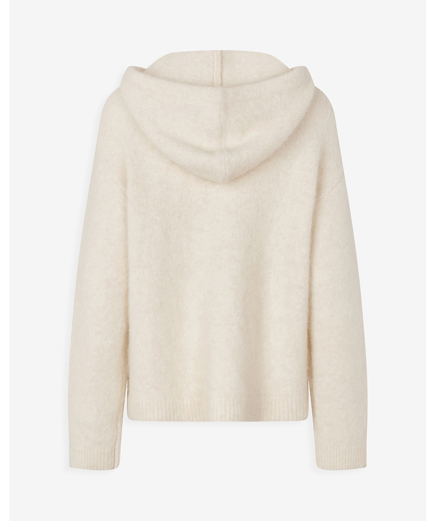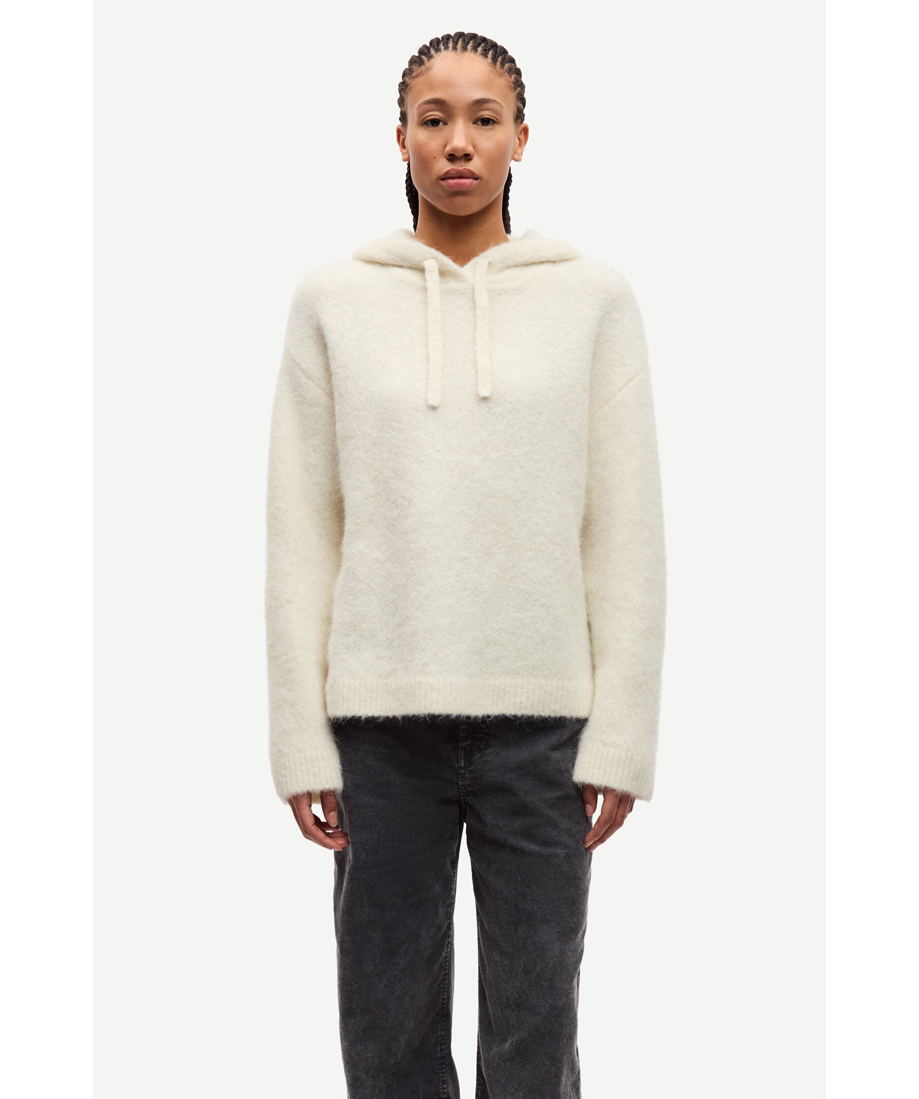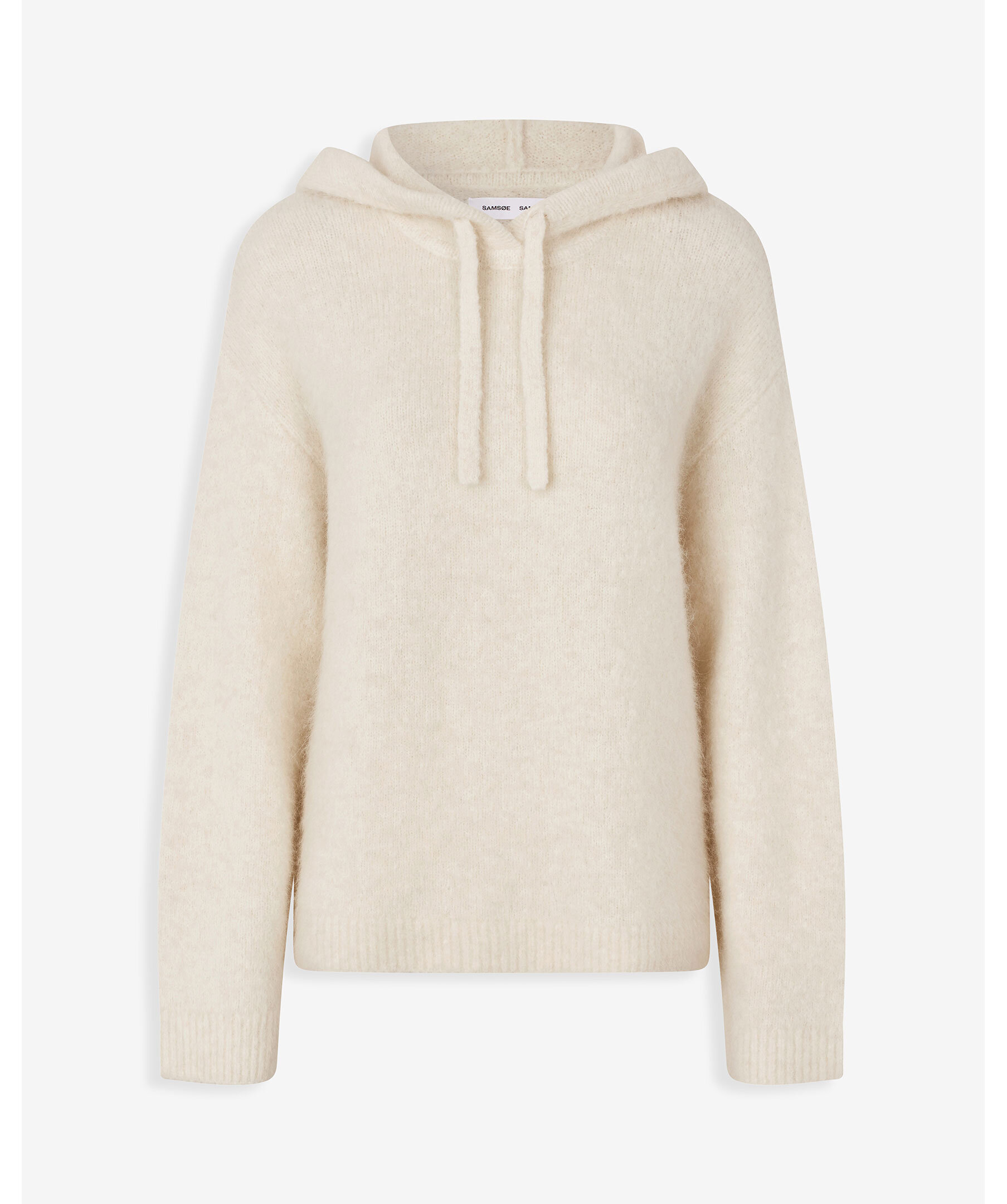 Krämvit stickad hoodie från Samsøe Samsøe. Tröjan har en avslappnad passform och droppade axlar. Snörning vid luvan och ribbstickade muddar. Gjord i en alpackablandning.