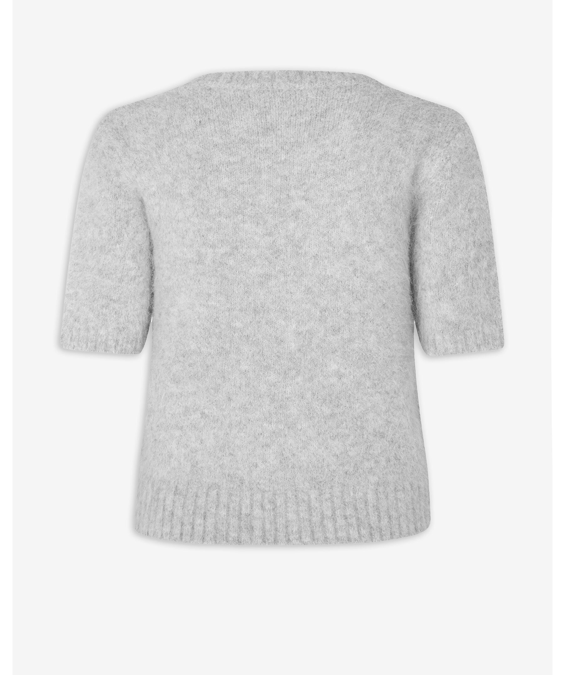Ljusgrå stickad tröja från Samsoe Samsoe. Tröjan har trekvartsärm och en croppad siluett. Ribbstickad rund krage samt ribbstickade ärm- och tröjavslut. Borstad look och tillverkad av en elastisk blandning med alpacka.