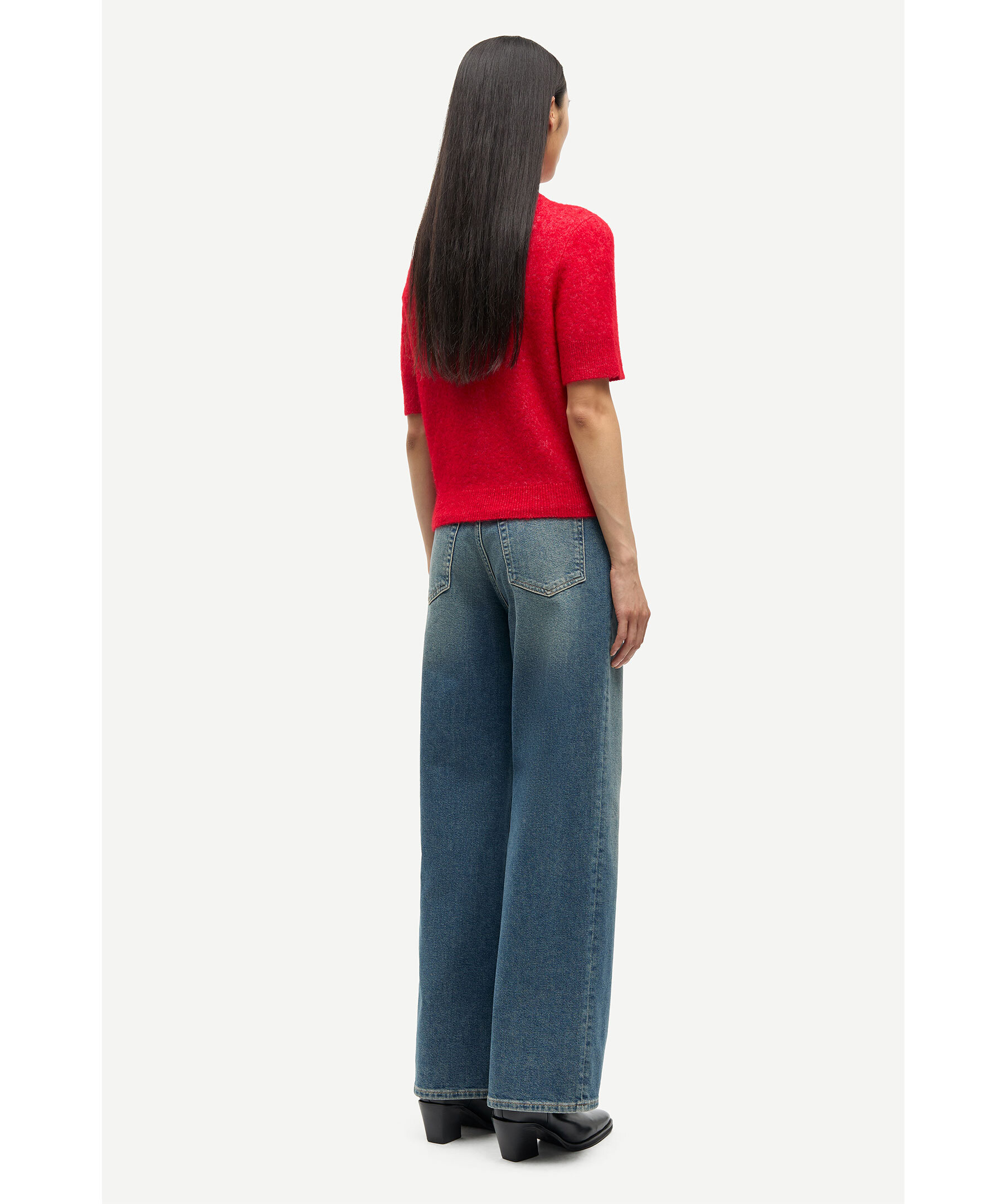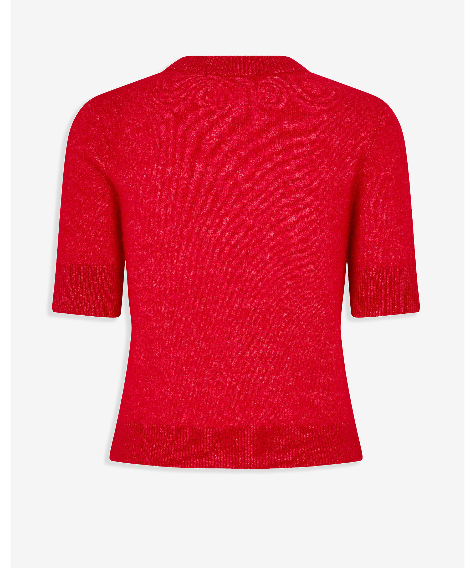 Klarröd cardigan Samsoe Samsoe. Koftan har trekvartsärm, rundad halsringning och stängs med knappar fram. Tillverkad av en ullblandning. Modellen har på sig strl S.