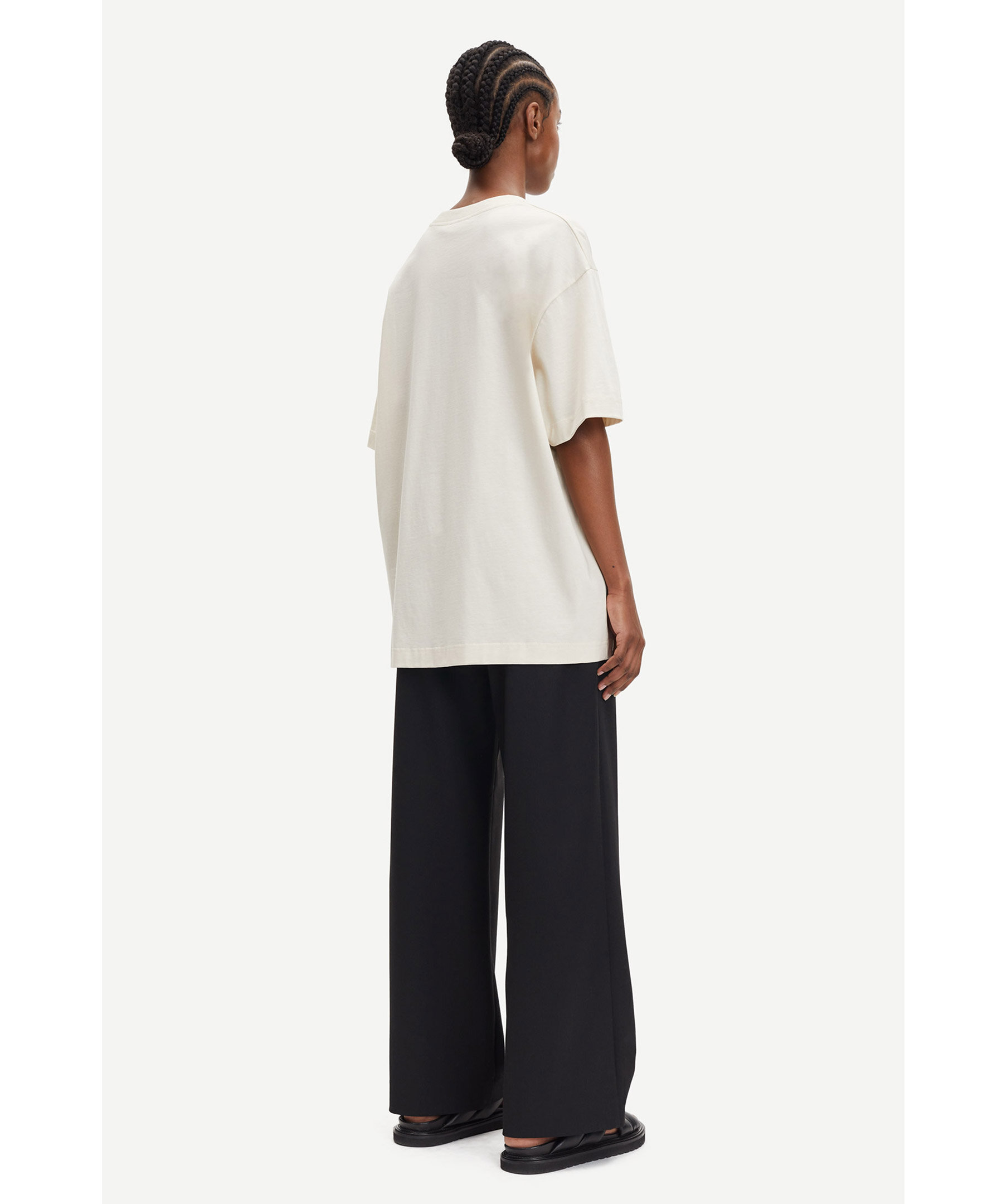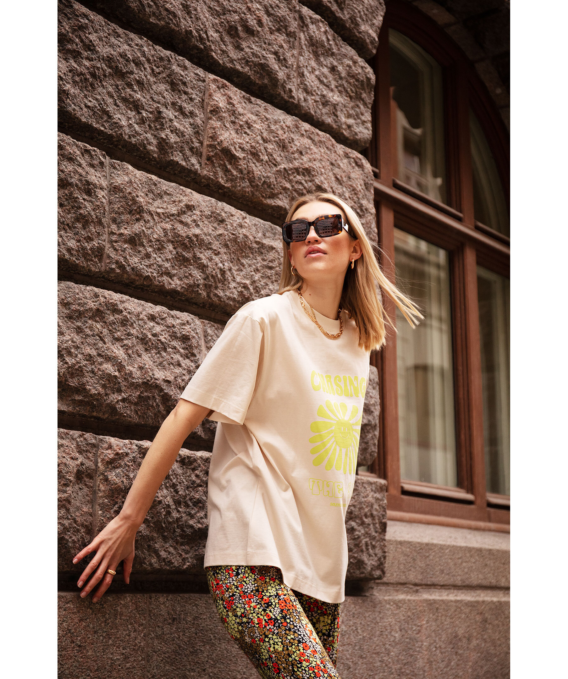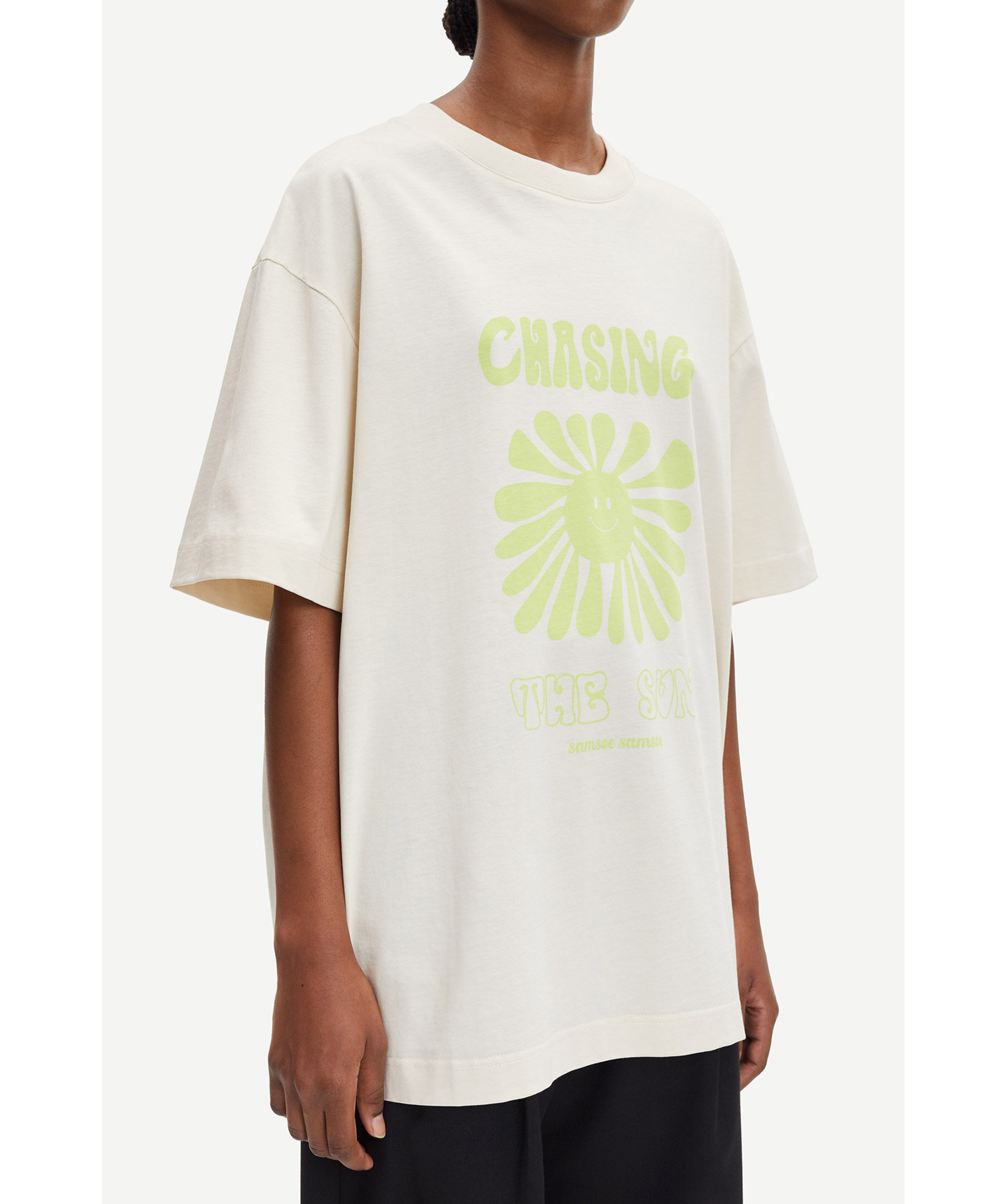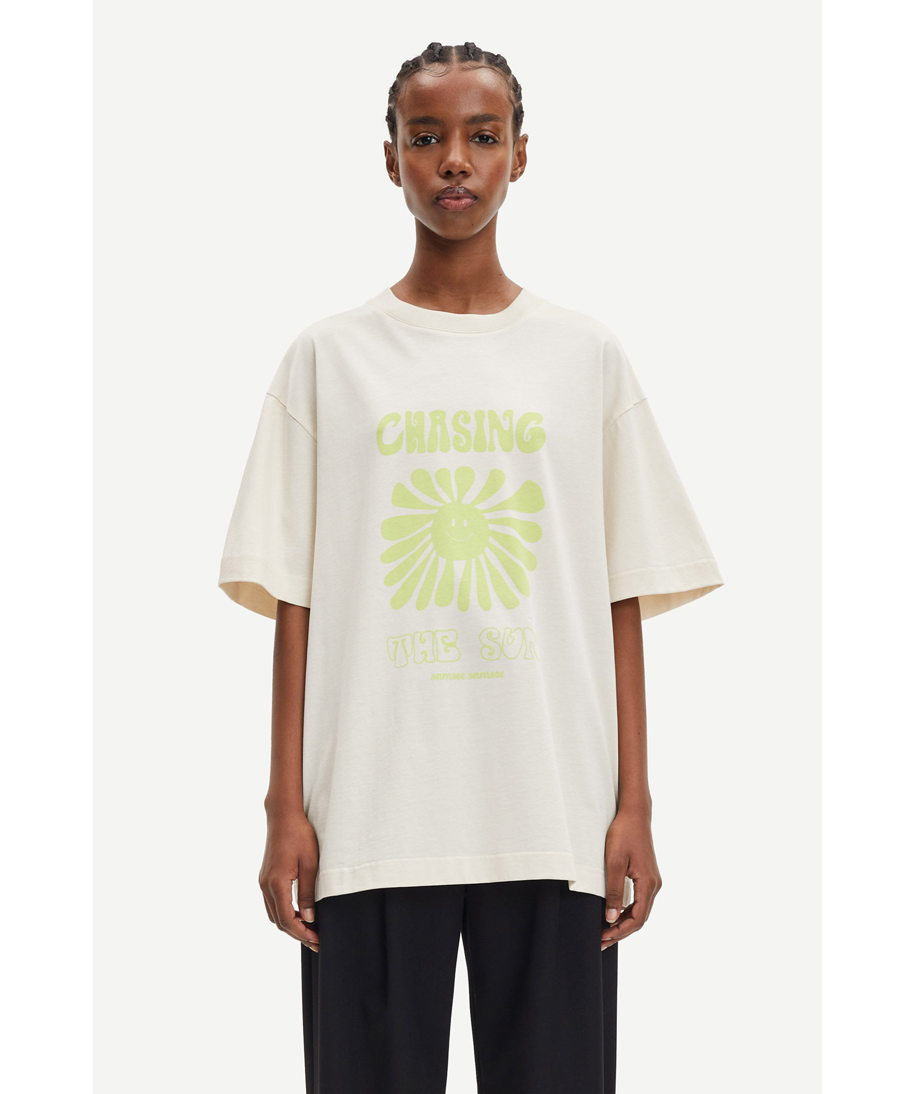Ljusbeige T-shirt från Samsøe Samsøe i avslappnad modell. Stort neongrönt tryck, rundad hals, korta ärmar. Tillverkad i 100% bomull.