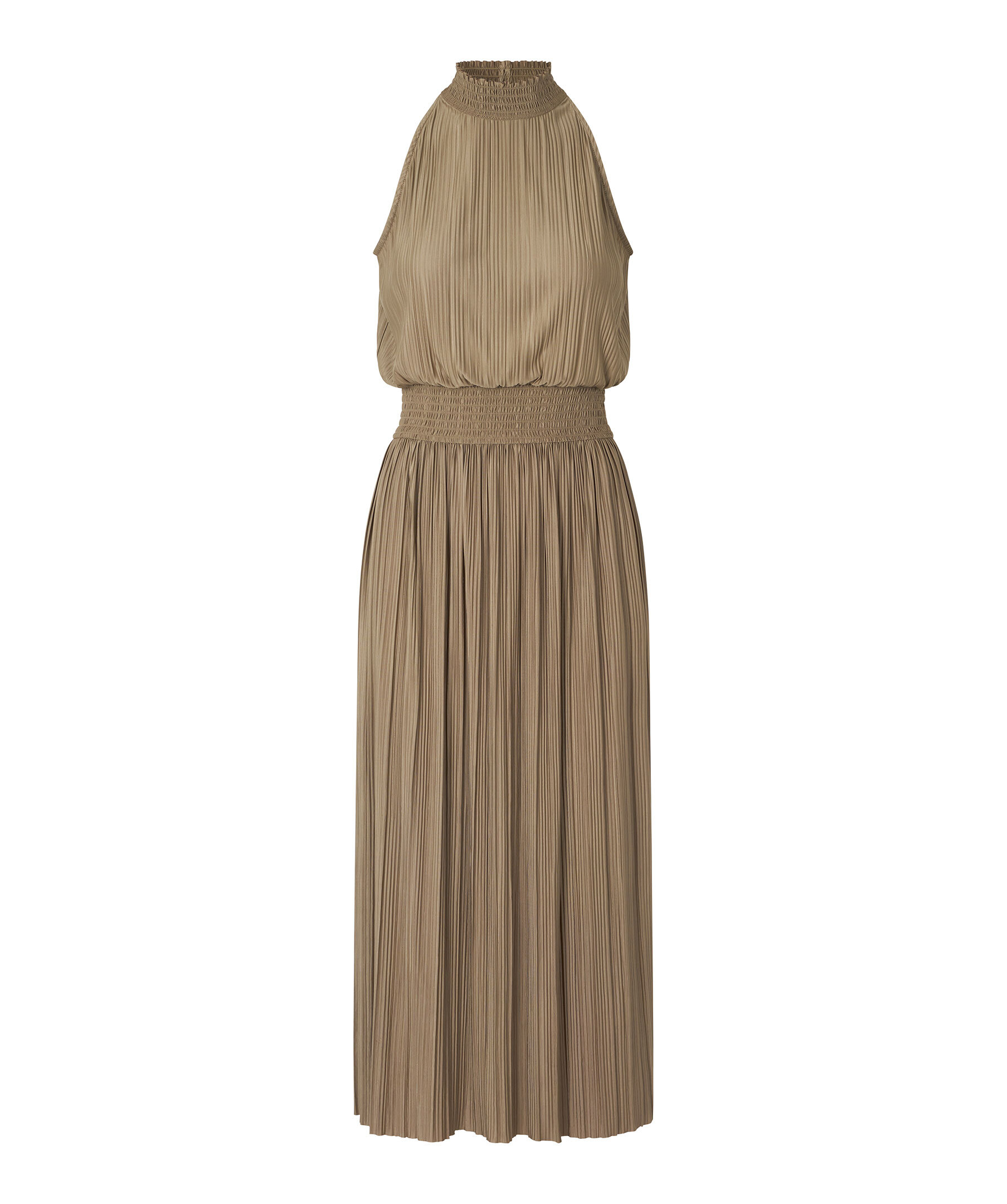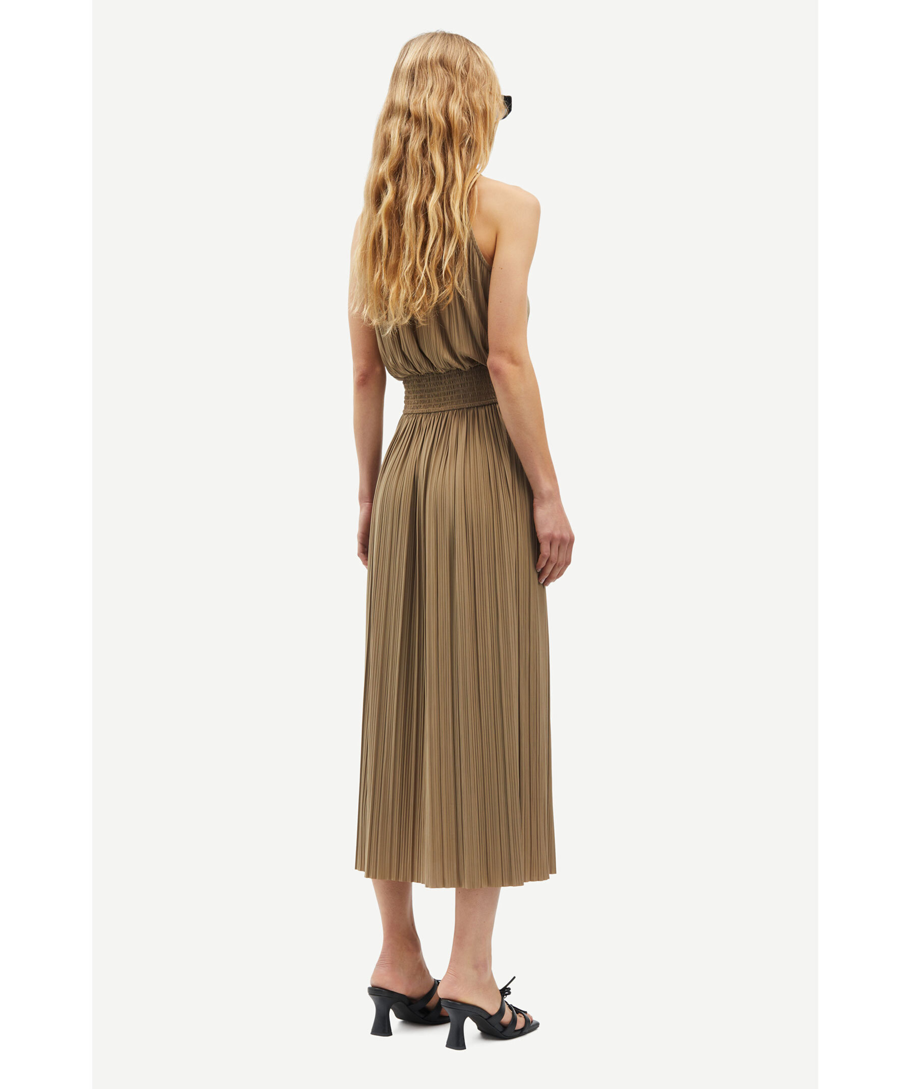 Khakifärgad maxiklänning med A-linjeskärning och halterneck från Samsoe Samsoe. Har en smockad elastisk midja för bättre passform. Tillverkad av en stretchig återvunnen polyesterblandning. Produkten är GRS-certifierad och uppfyller höga standarder för sociala, miljömässiga och kemiska krav genom hela tillverkningsprocessen.