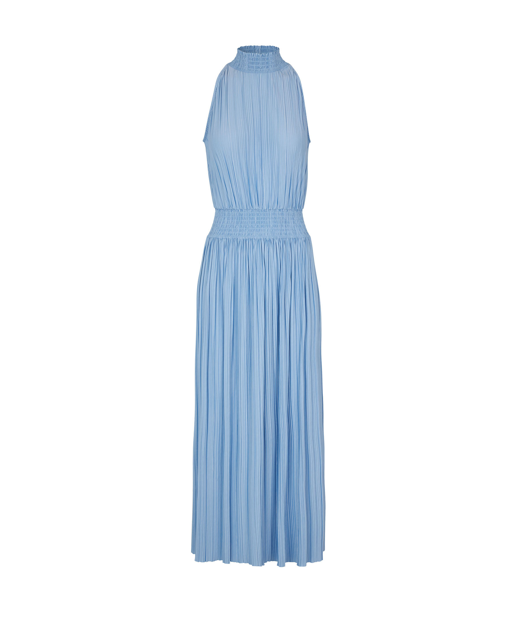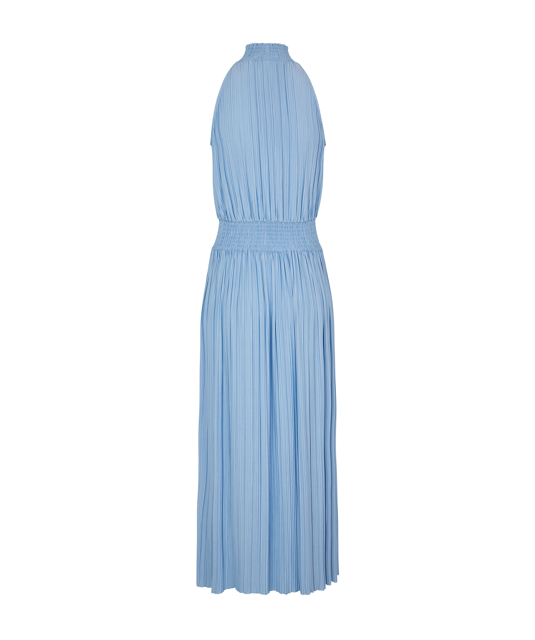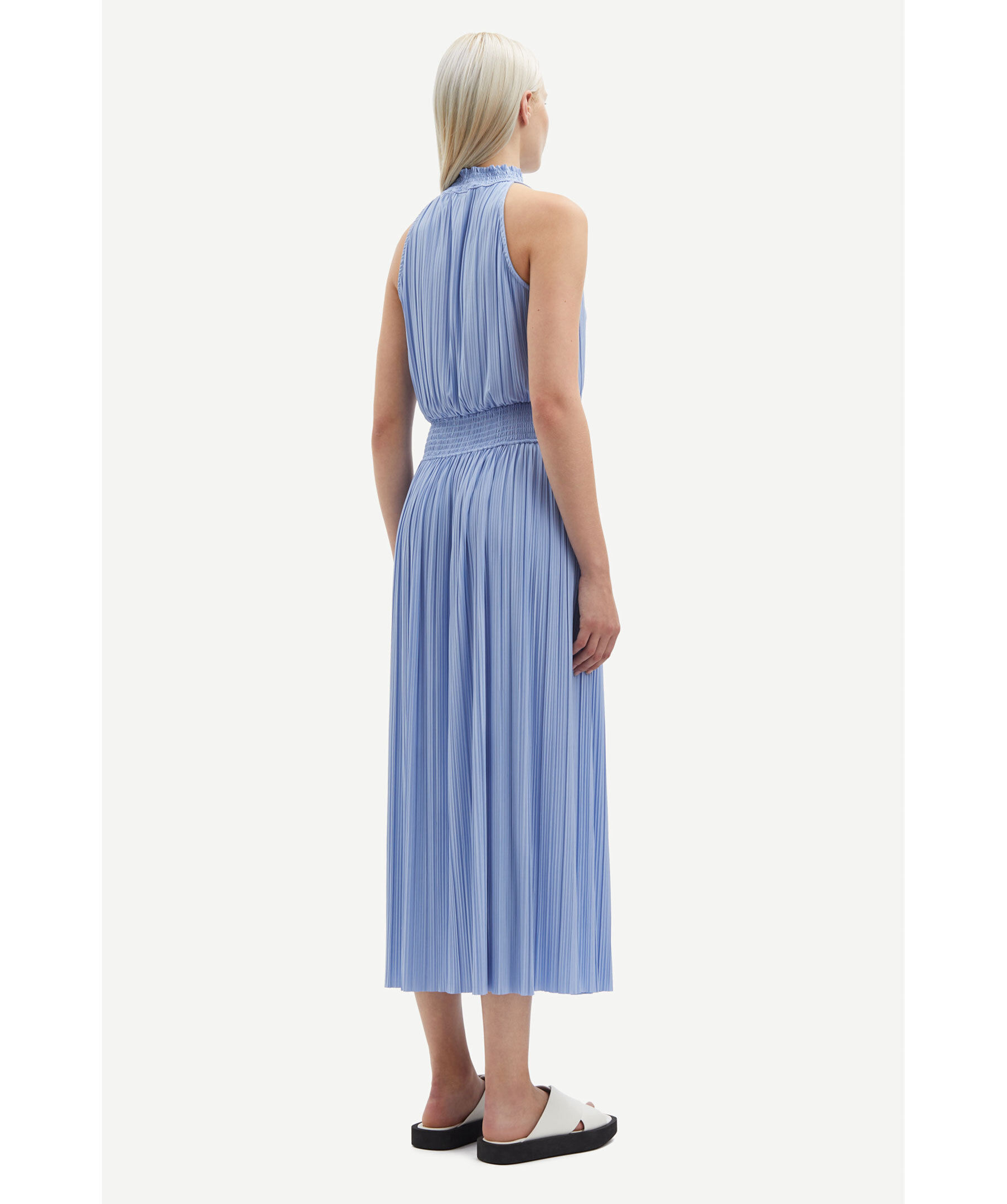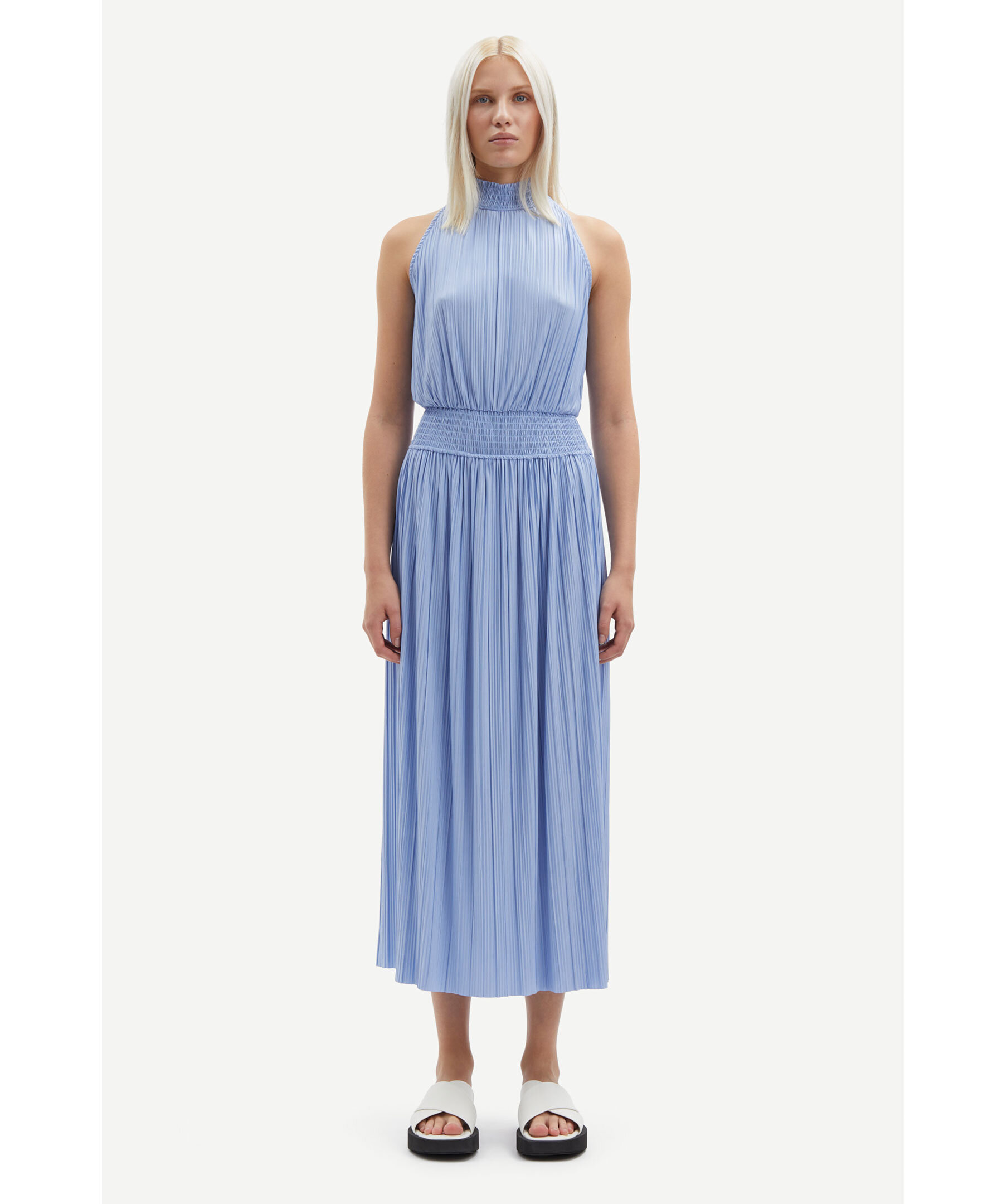 Blå maxiklänning med A-linjeskärning och halterneck Samsoe Samsoe. Har en smockad elastisk midja för bättre passform. Tillverkad av en stretchig återvunnen polyesterblandning. Produkten är GRS-certifierad och uppfyller höga standarder för sociala, miljömässiga och kemiska krav genom hela tillverkningsprocessen.