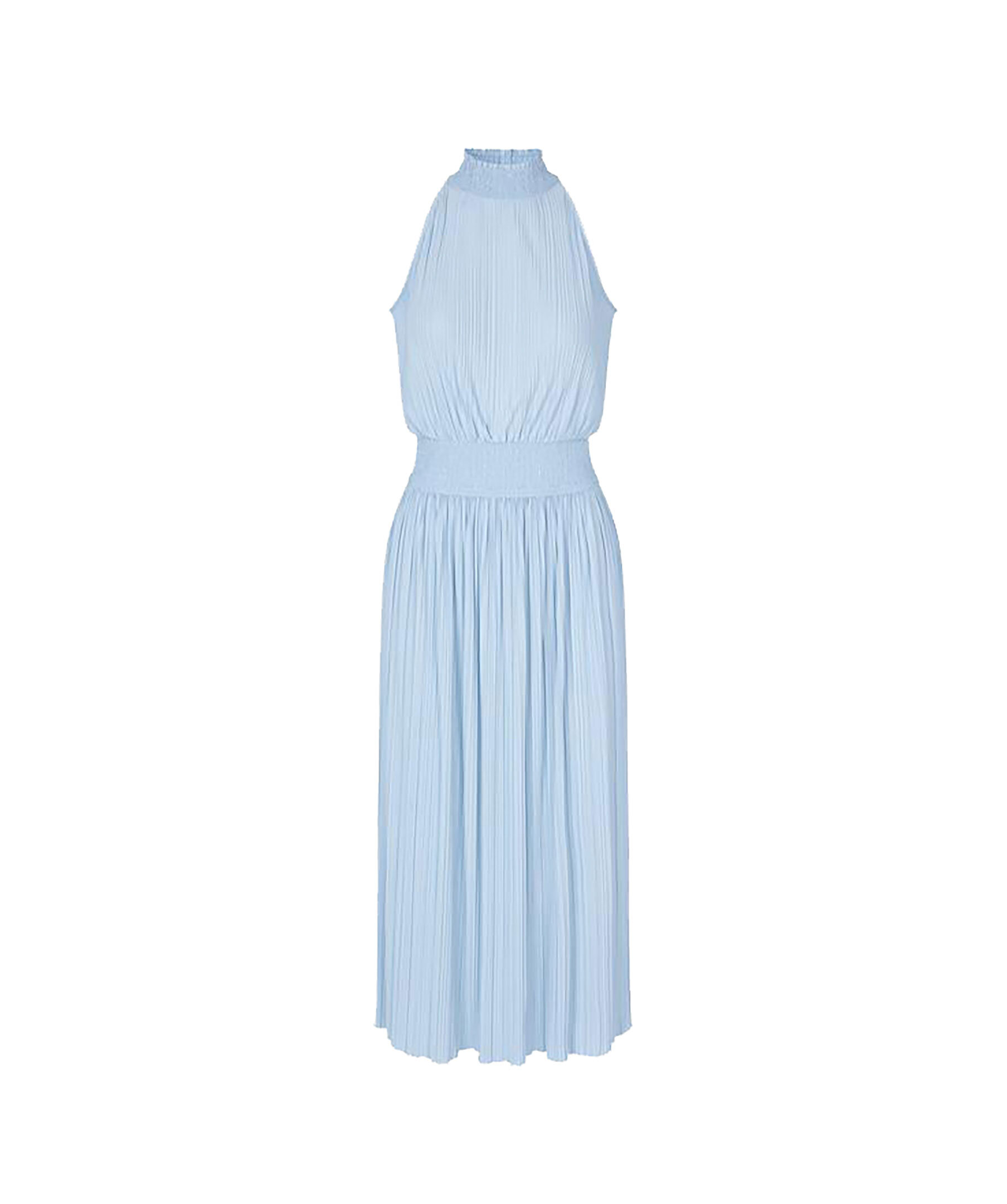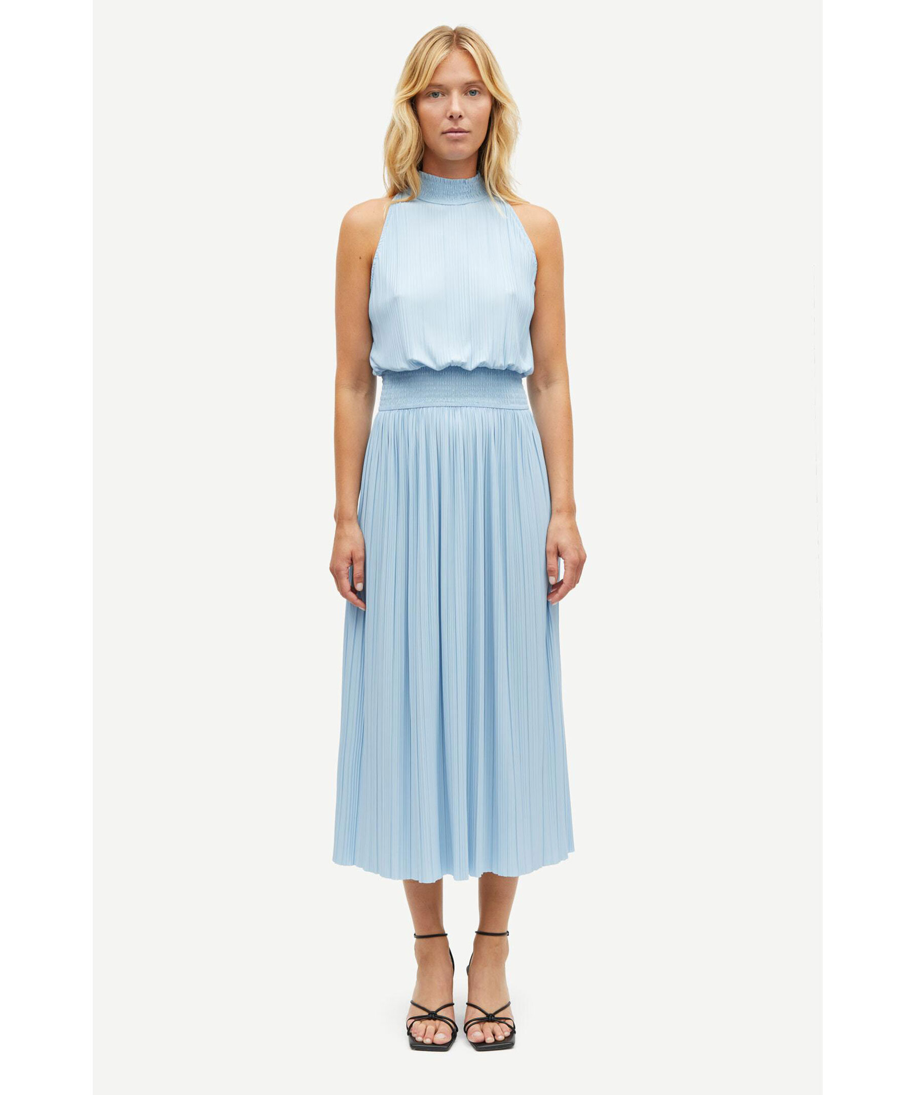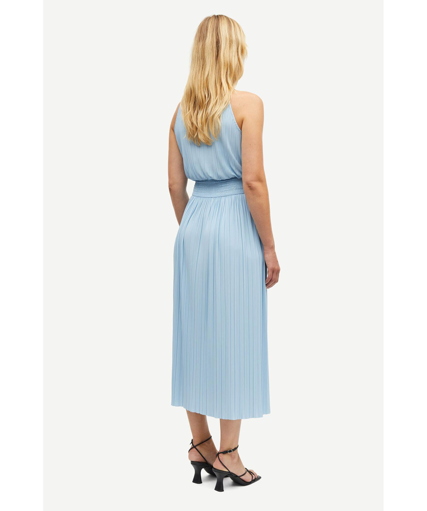 Ljusblå jersey maxiklänning från Samsoe Samsoe. Klänningen är lätt draperad och har en normal passform samt en a-linjeformad kjol. Halterneck och smockad resår i midjan. Tillverkad av en polyesterblandning.