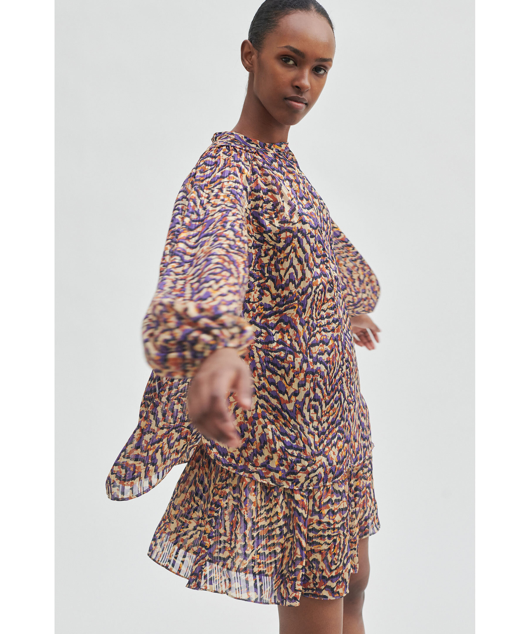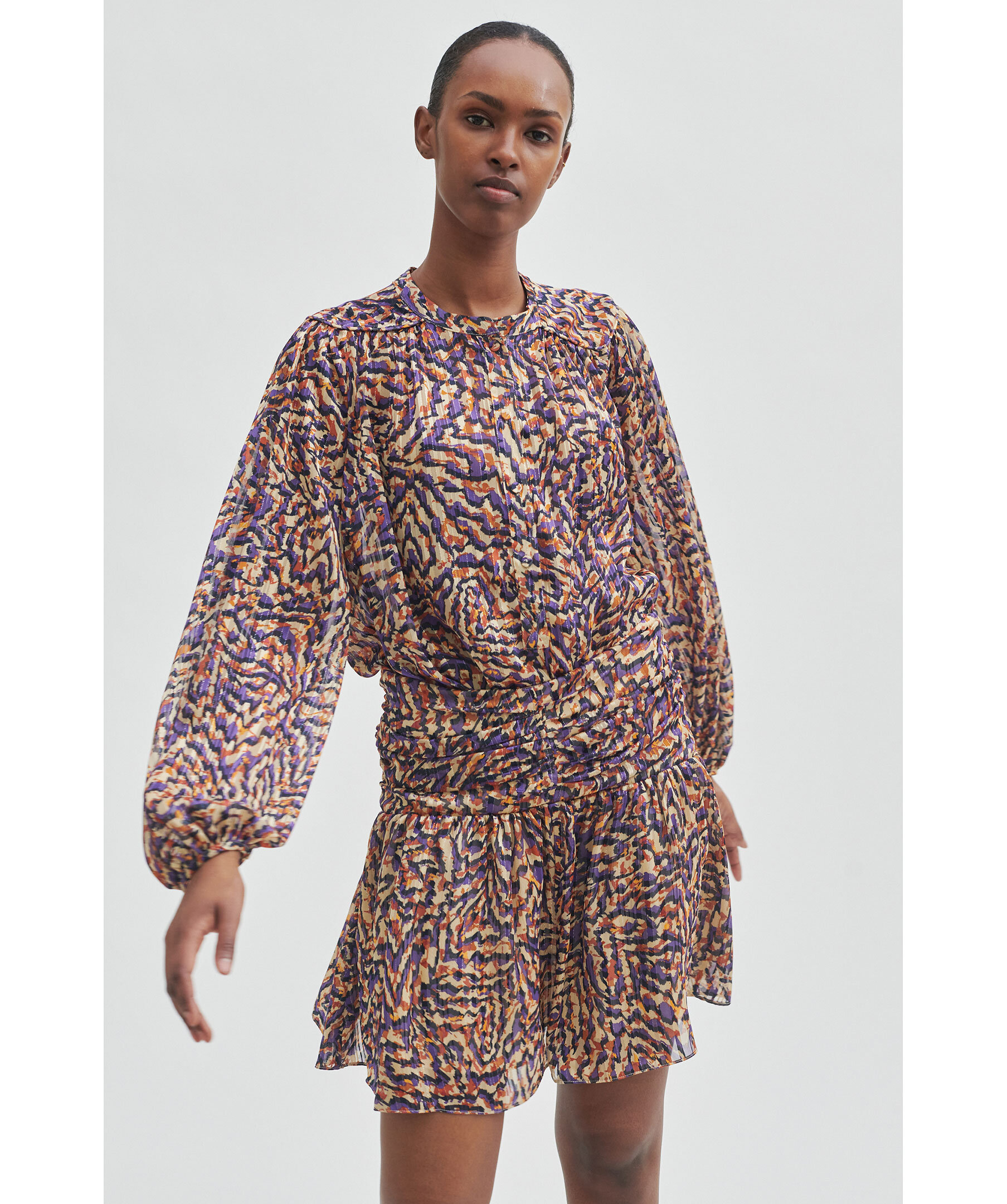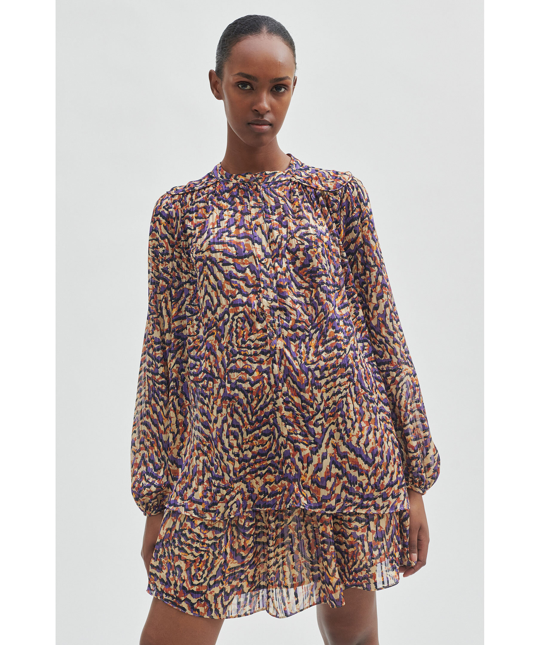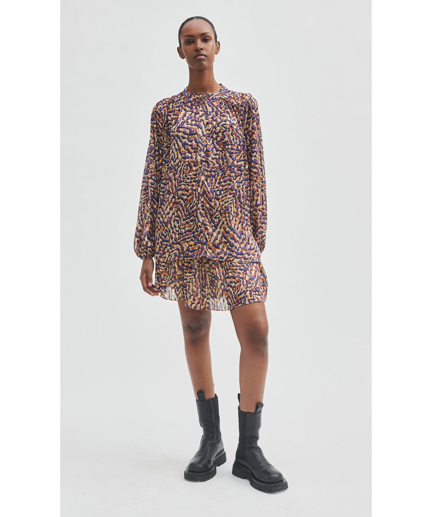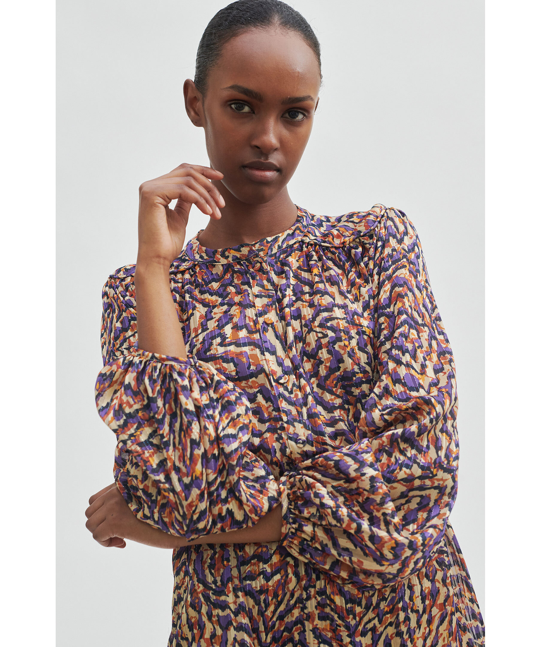 Multifärgad mönstrad blus från Second Female. Tillverkad i tunt tyg med Glittriga detaljer. Textilklädda knappar framtill. Blusen har vida ballongärmar.