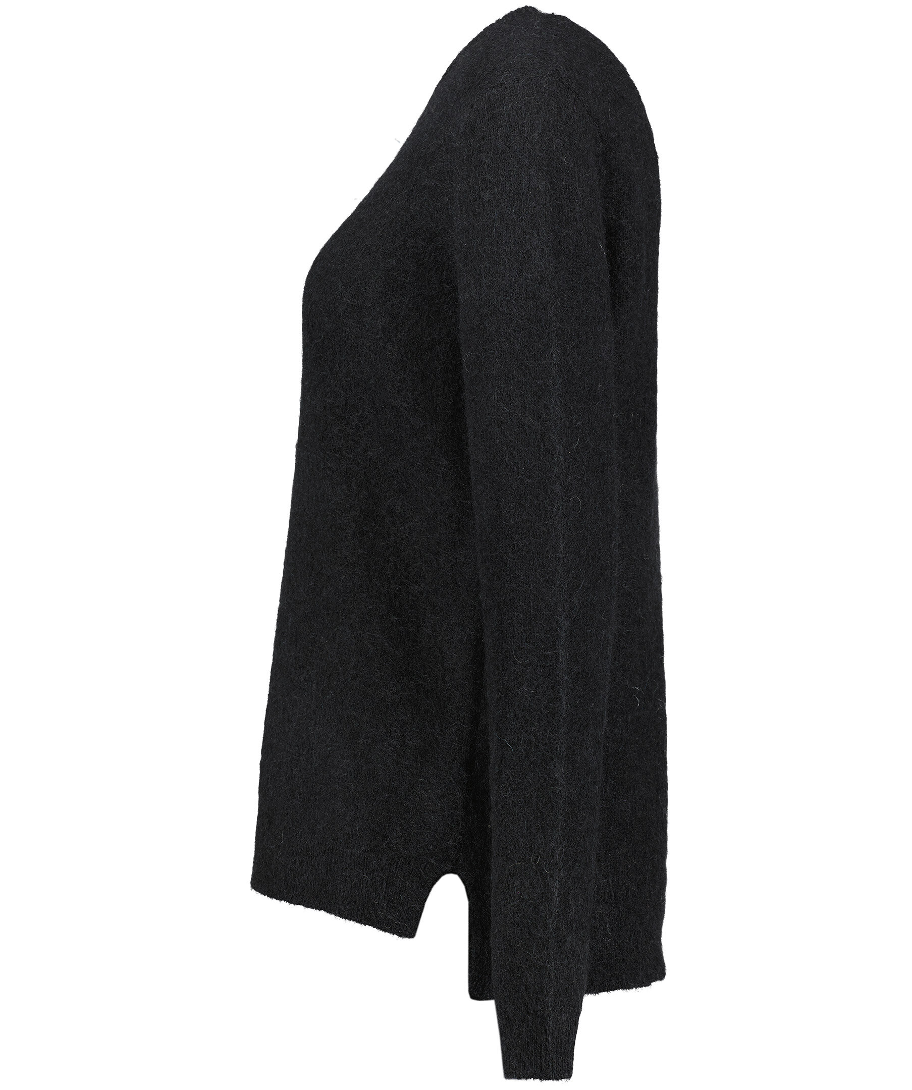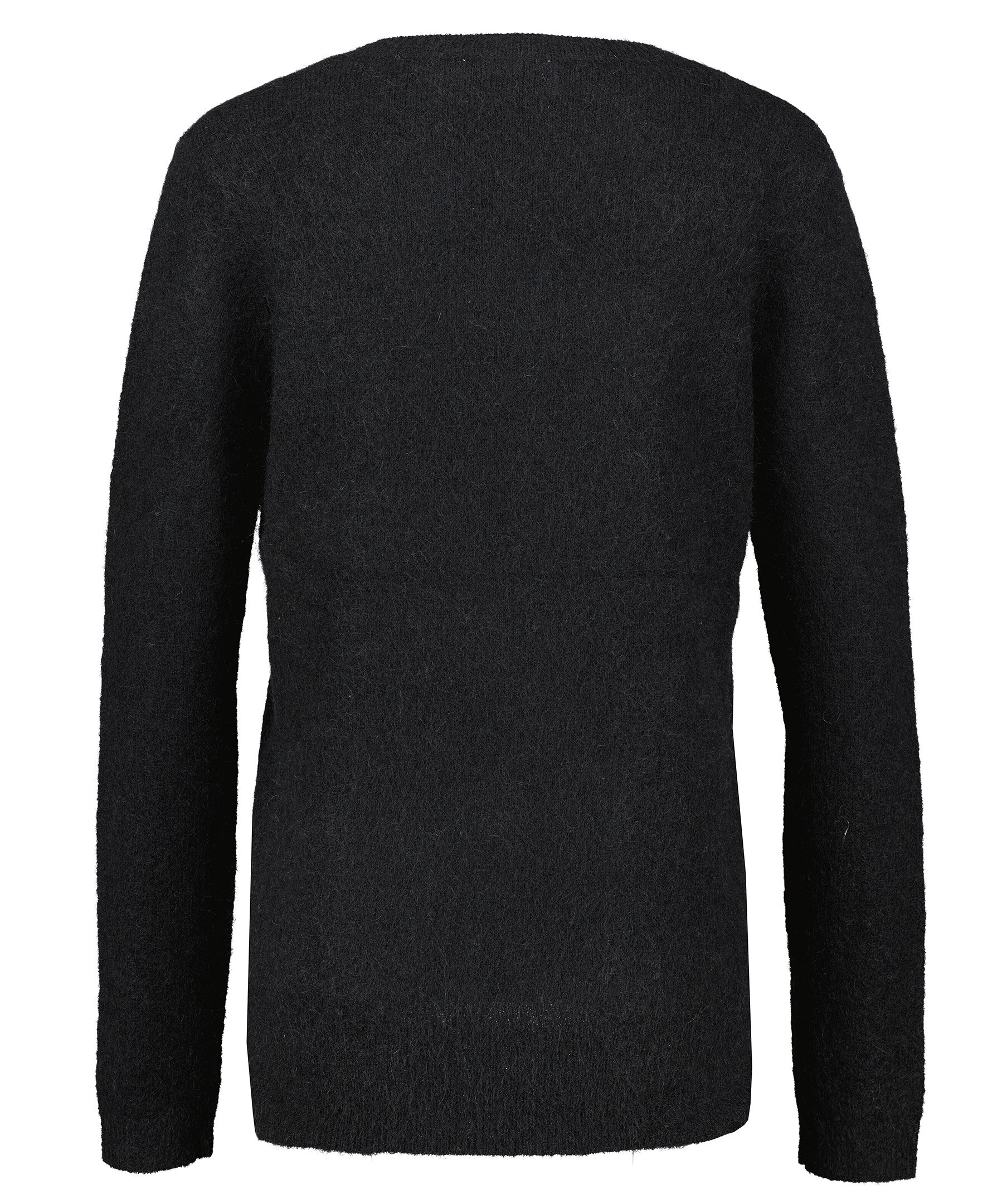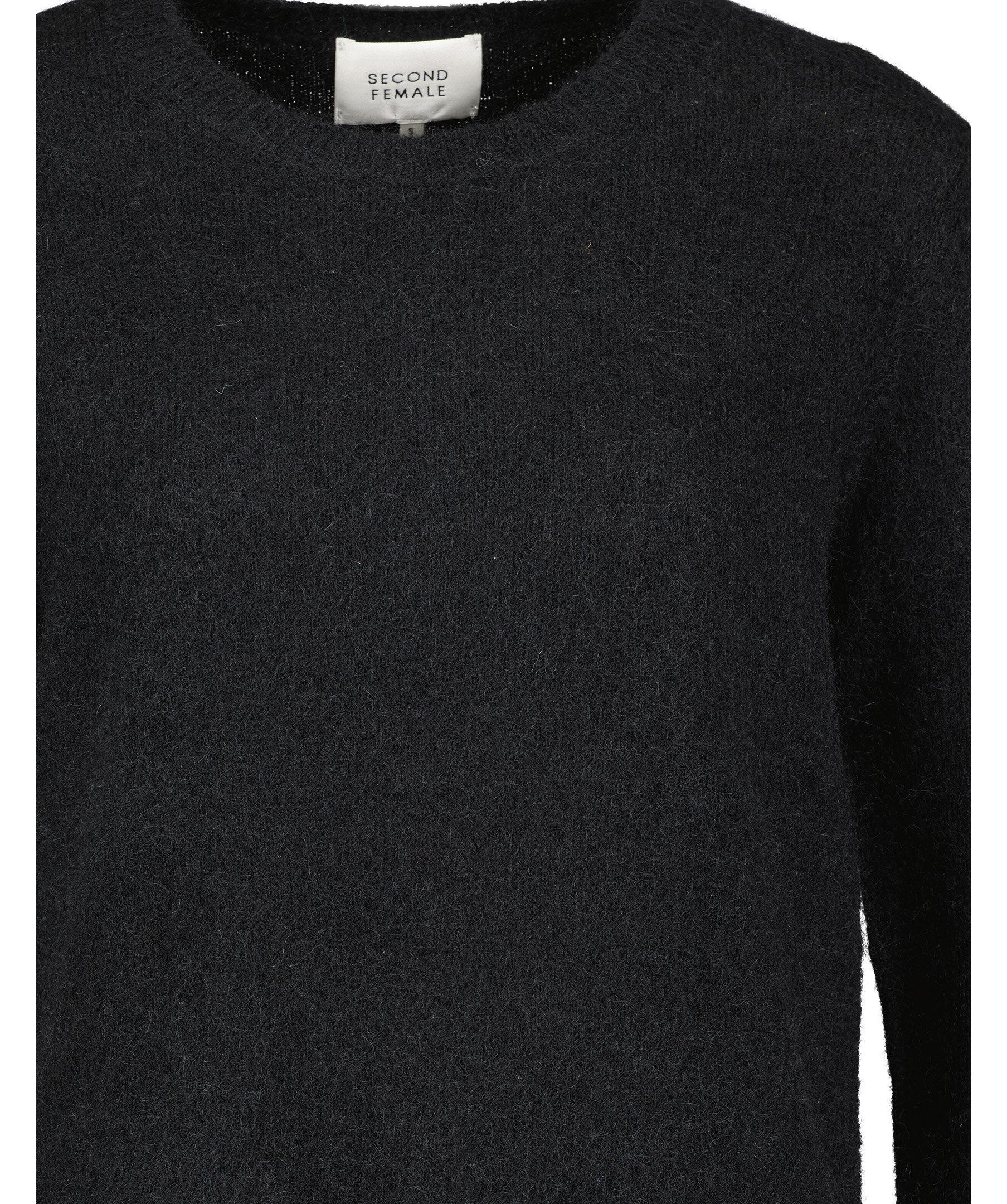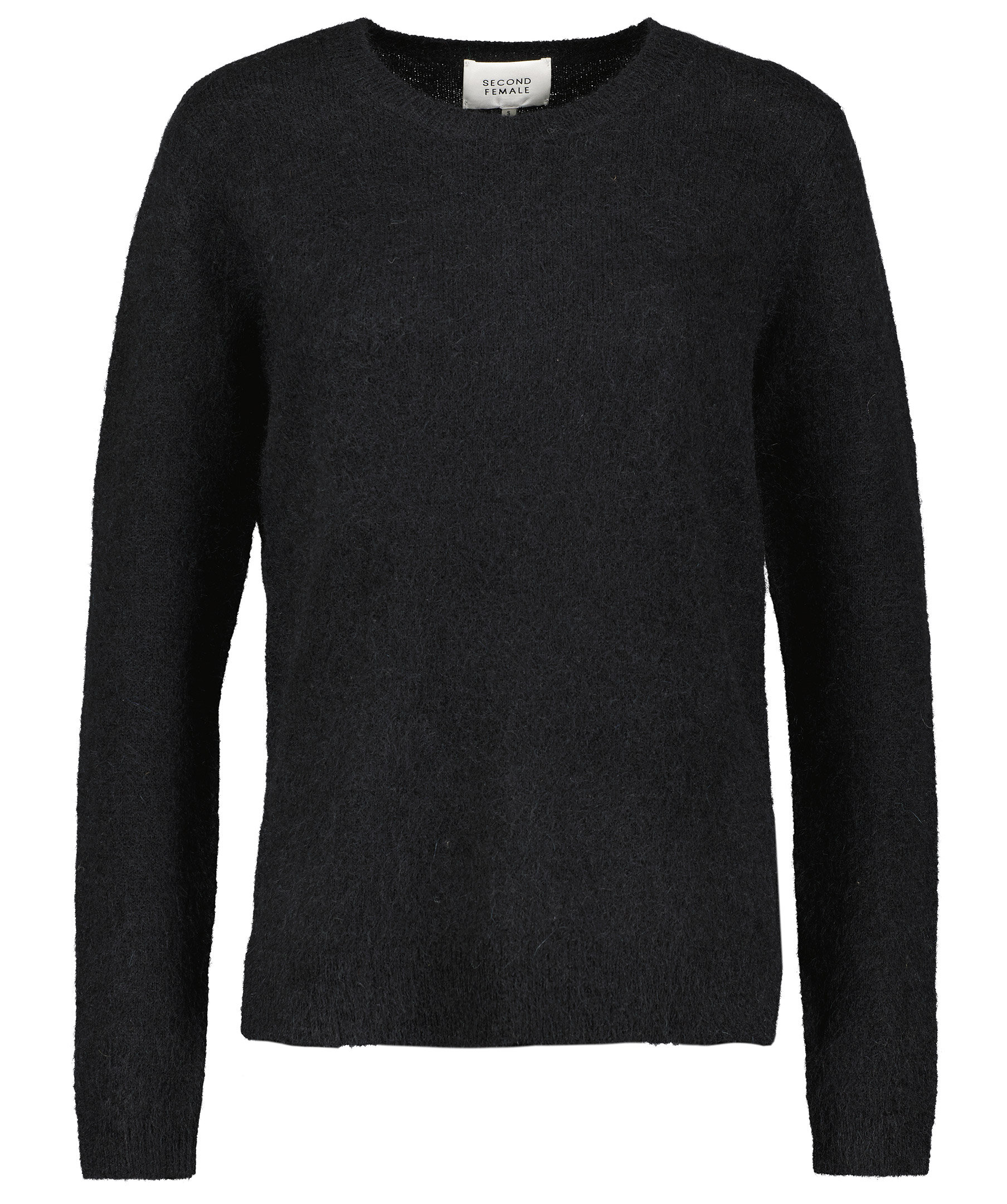 Svart finstickad tröja från Second female. Rundad halsringning. Ribbstickade muddar vid halsringningen, ärm- och plaggslut. Tillverkad i mohair blandning.