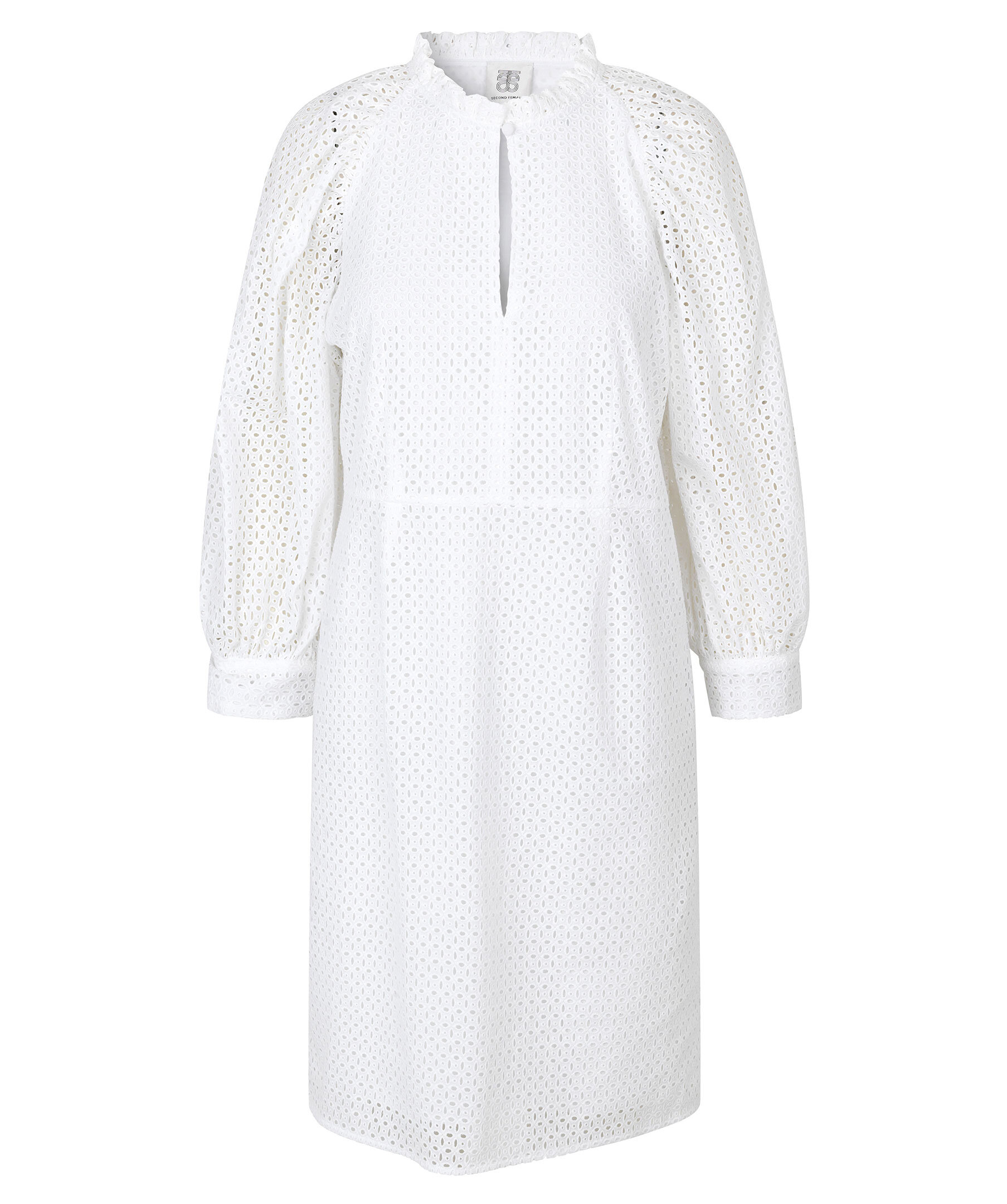 Vit klänning i spets med broderier från Second Female. Volanger med hög krage och knapp. Ballongärmar med enkla manschetter. Tillverkad i 100% Bomull. Relativt figurnära passform.
