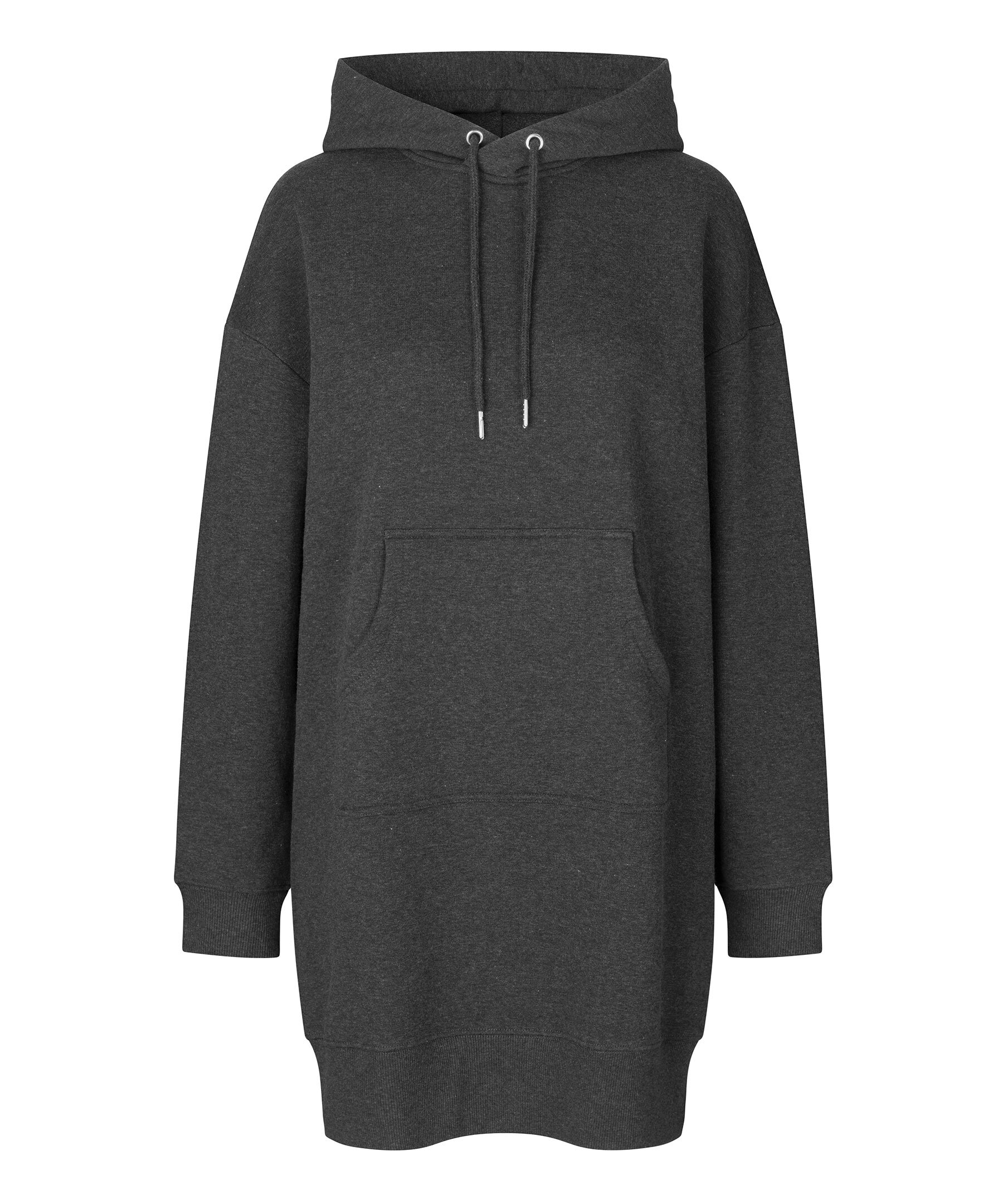 Mörkgrå melerad lång Hoodie från Second female. Luva med dragsko. Ribbstickade muddar i ärm- och plaggslut. Känguruficka på magen. Borstad insida.