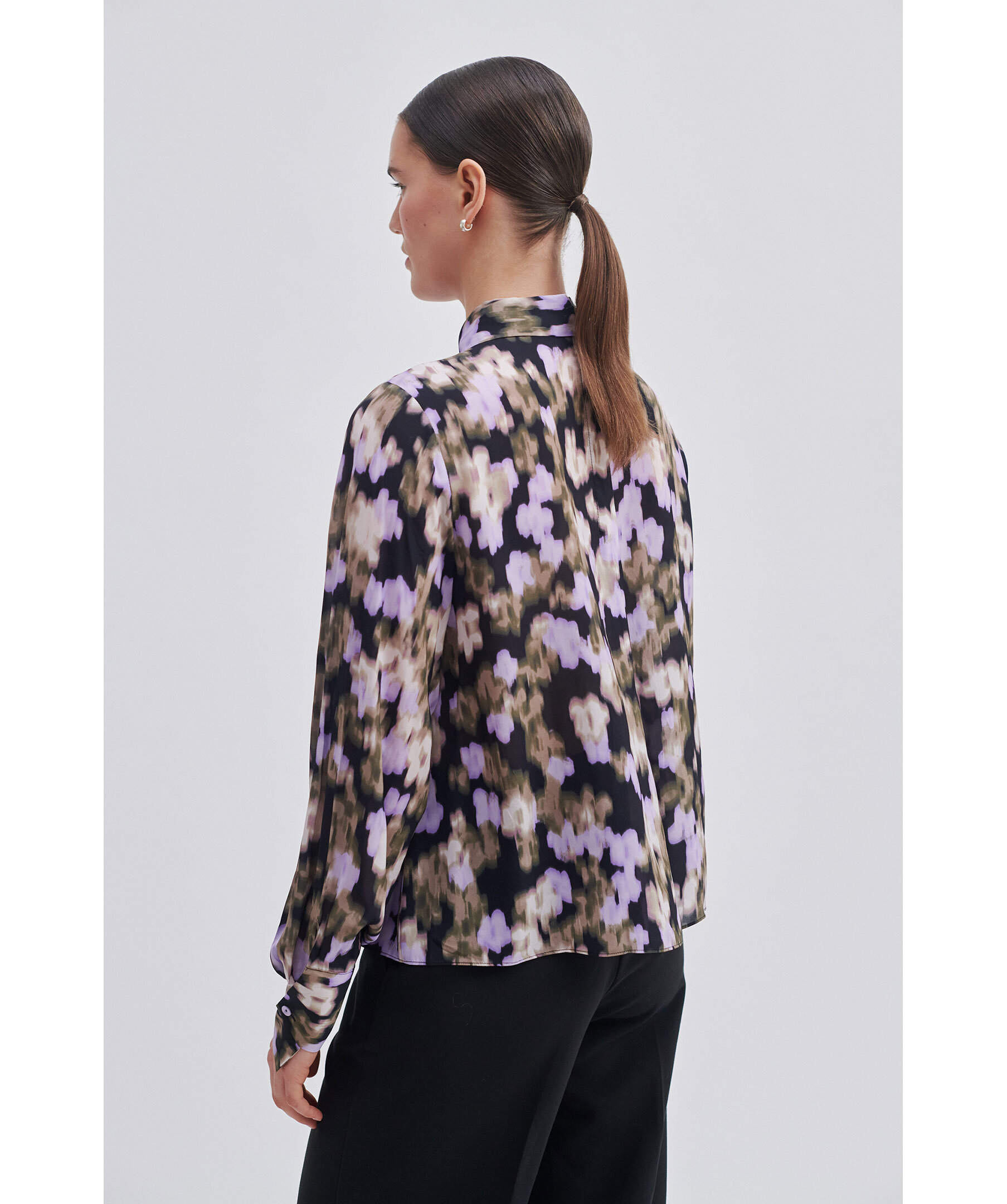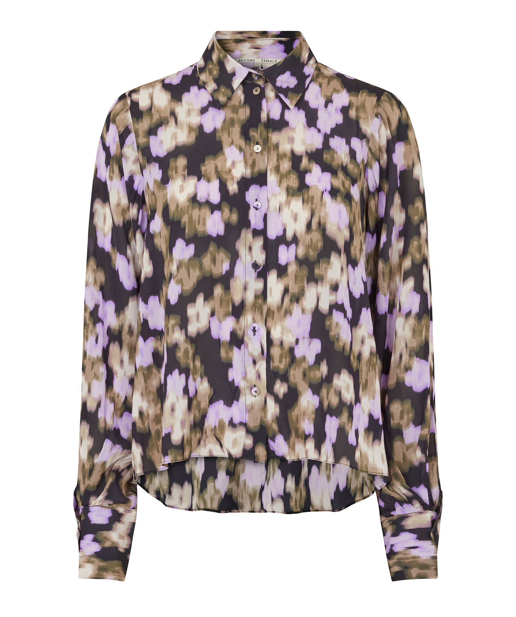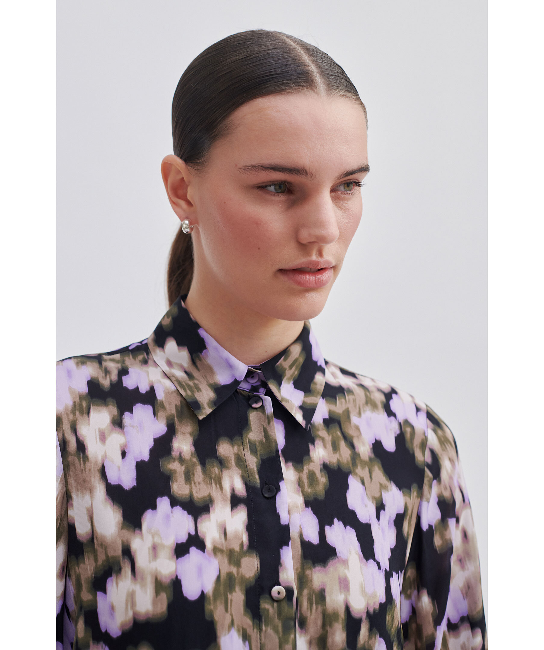 Mönstrad, flerfärgad skjorta från Second Female. Tillverkad i mjuk och flytande semi-transparent viskos med suddigt mönster. Har en liten spetsig krage och knäppning. Överlappande detalj baktill. Formade ärmar med knäppning i ärmslut. Lös och bred passform som skapar ett enkelt och lätt att bära uttryck.
