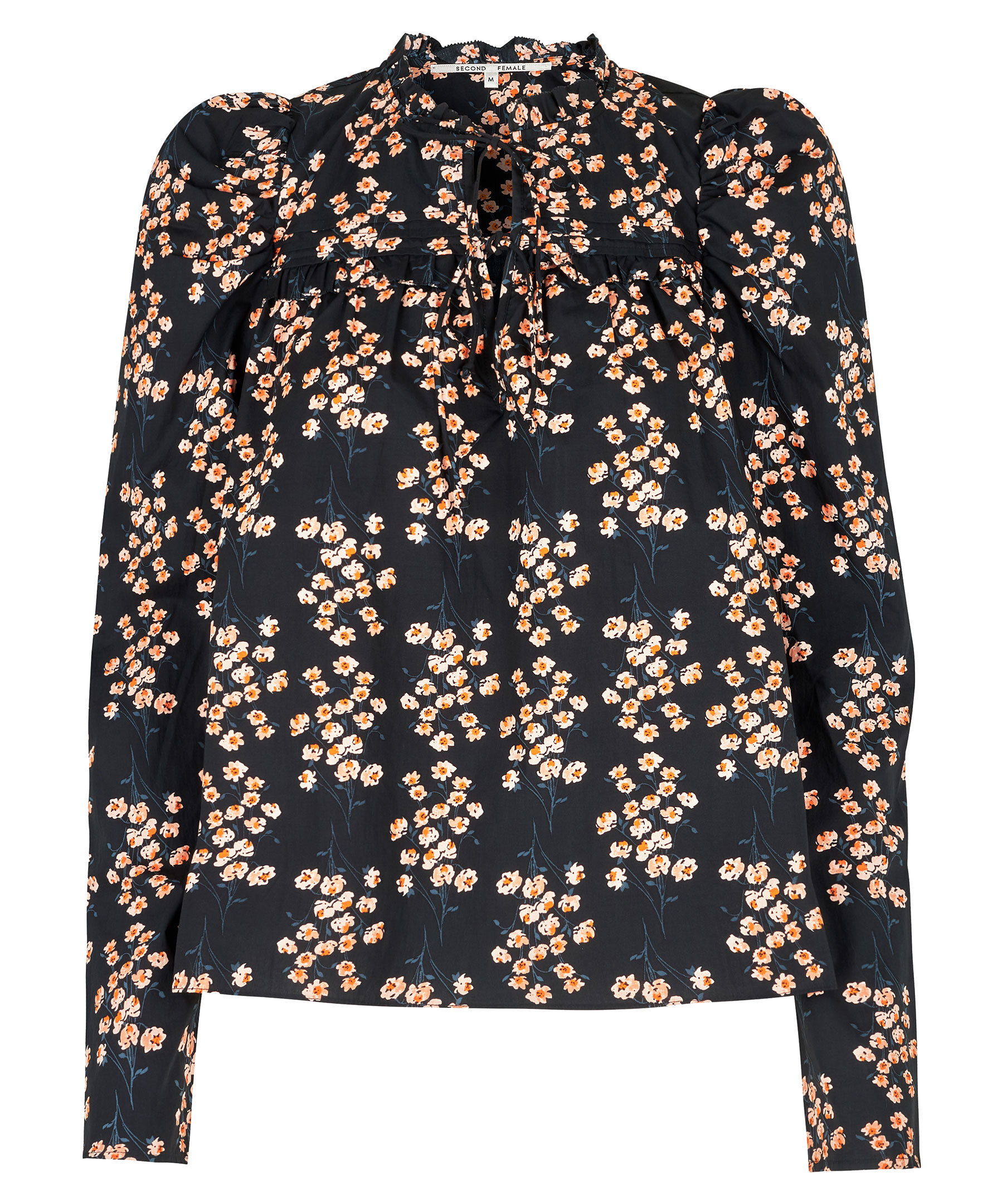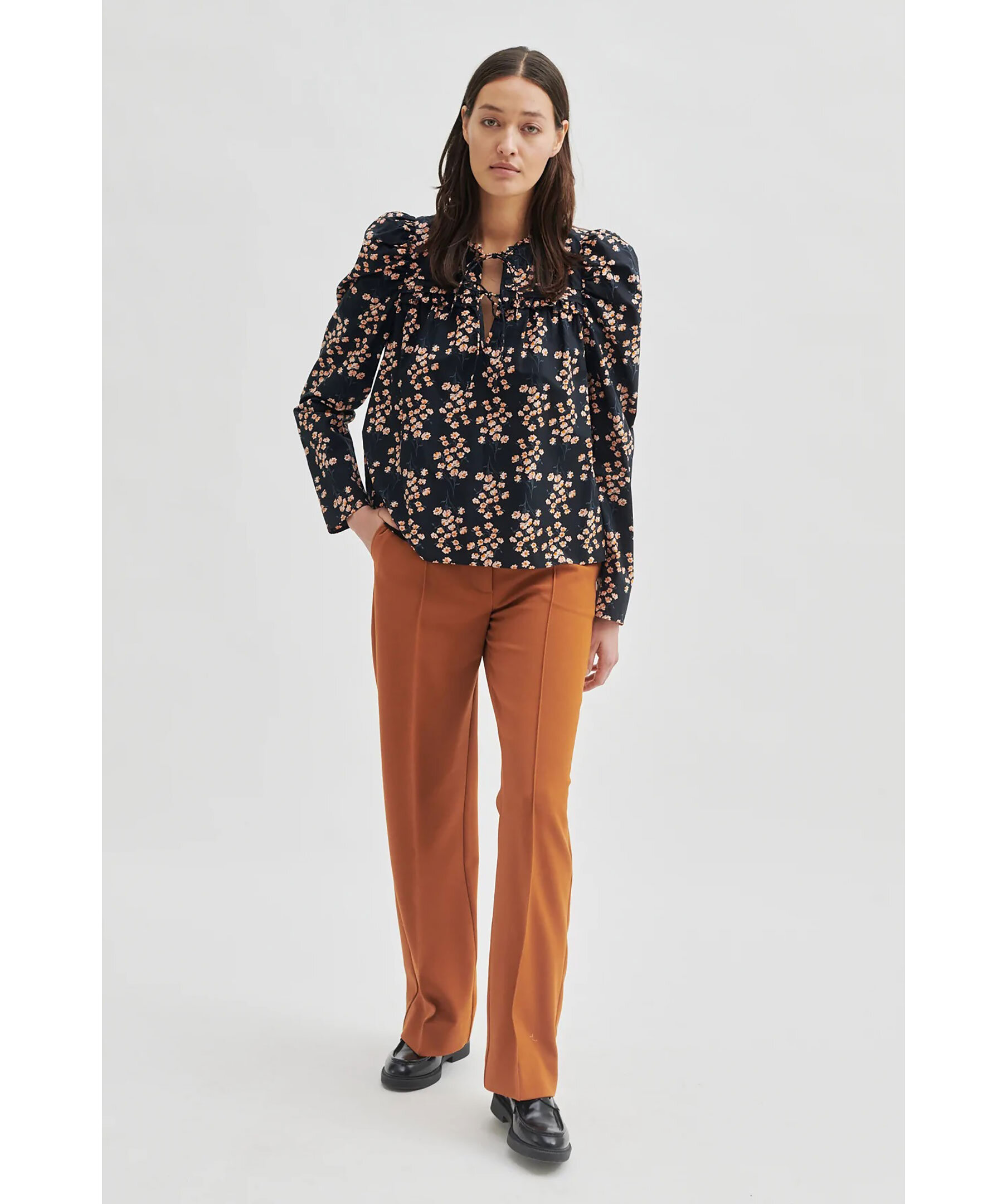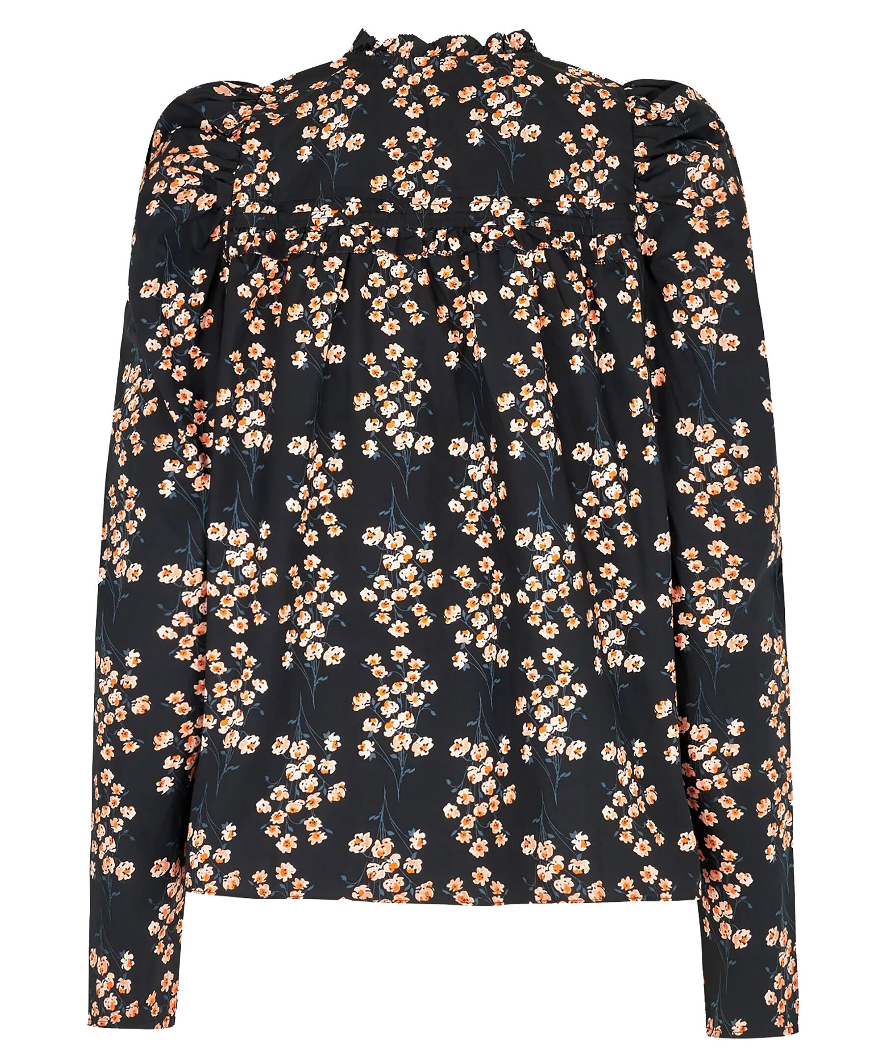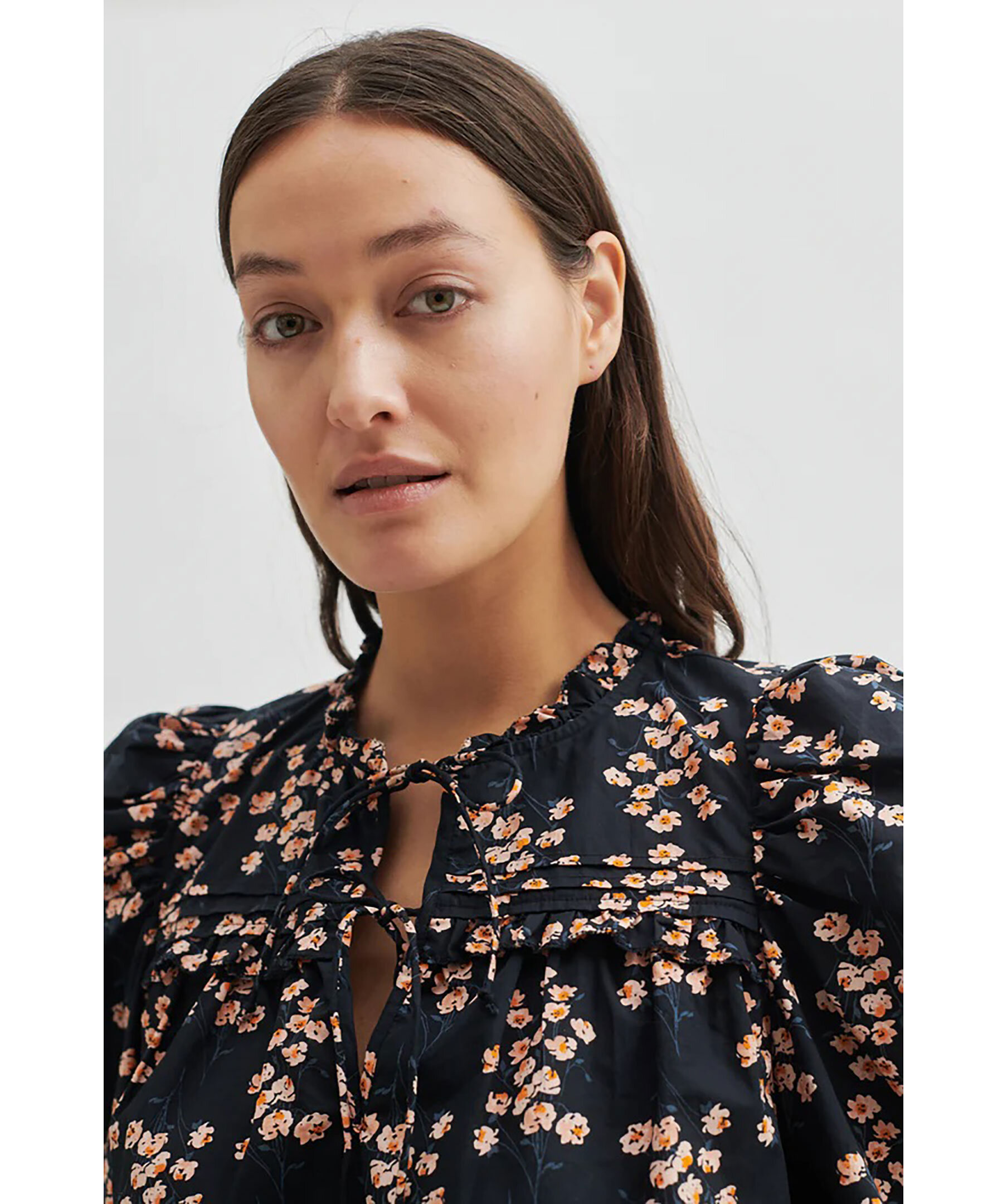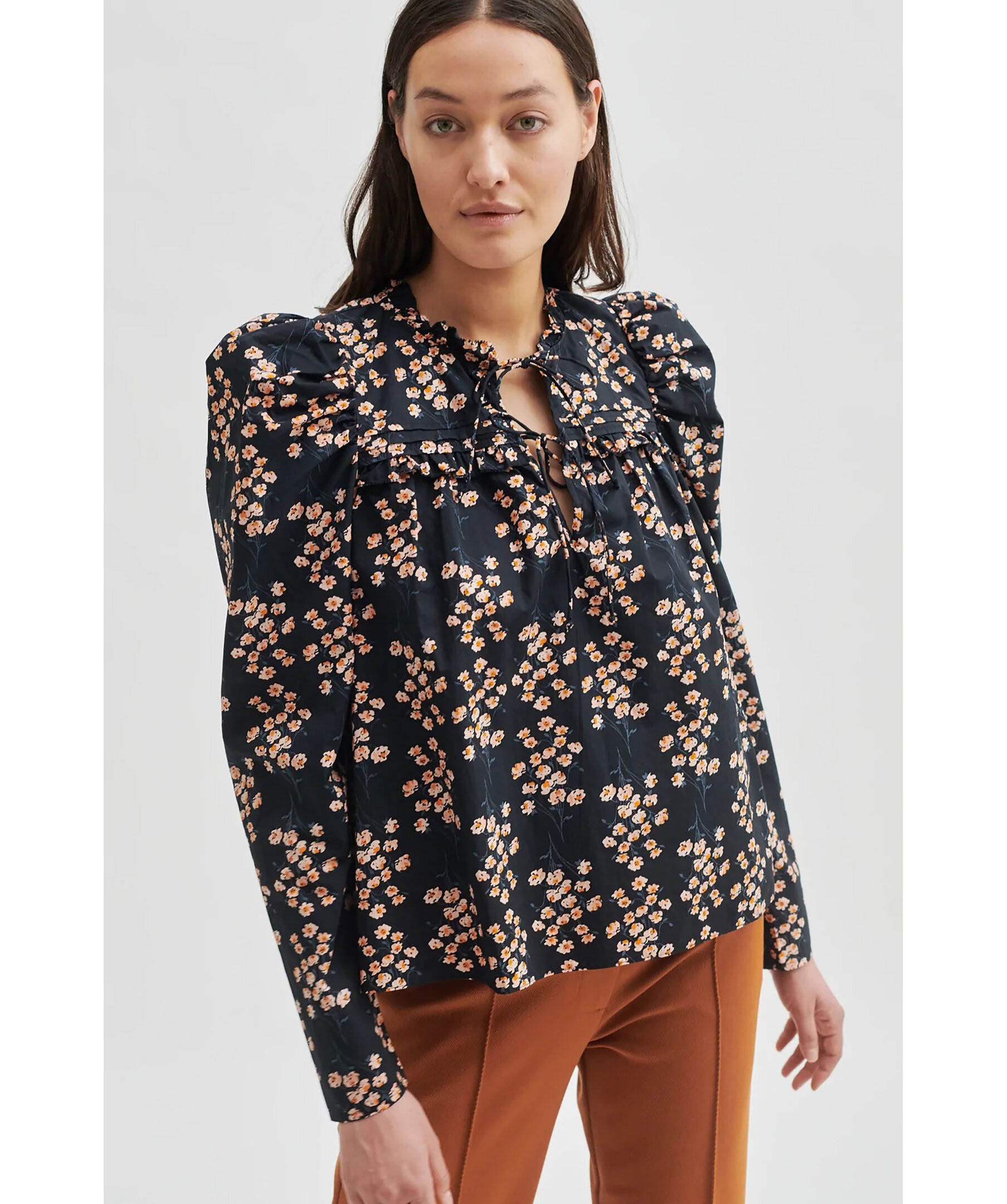 Svart blus med rosa blommönsterfrån Second Female. Tillverkad i len och mjuk ekologisk bomull. Öppen hals med knytband och volangkant runt halsen. Puffade axlar och lös och luftig passform.