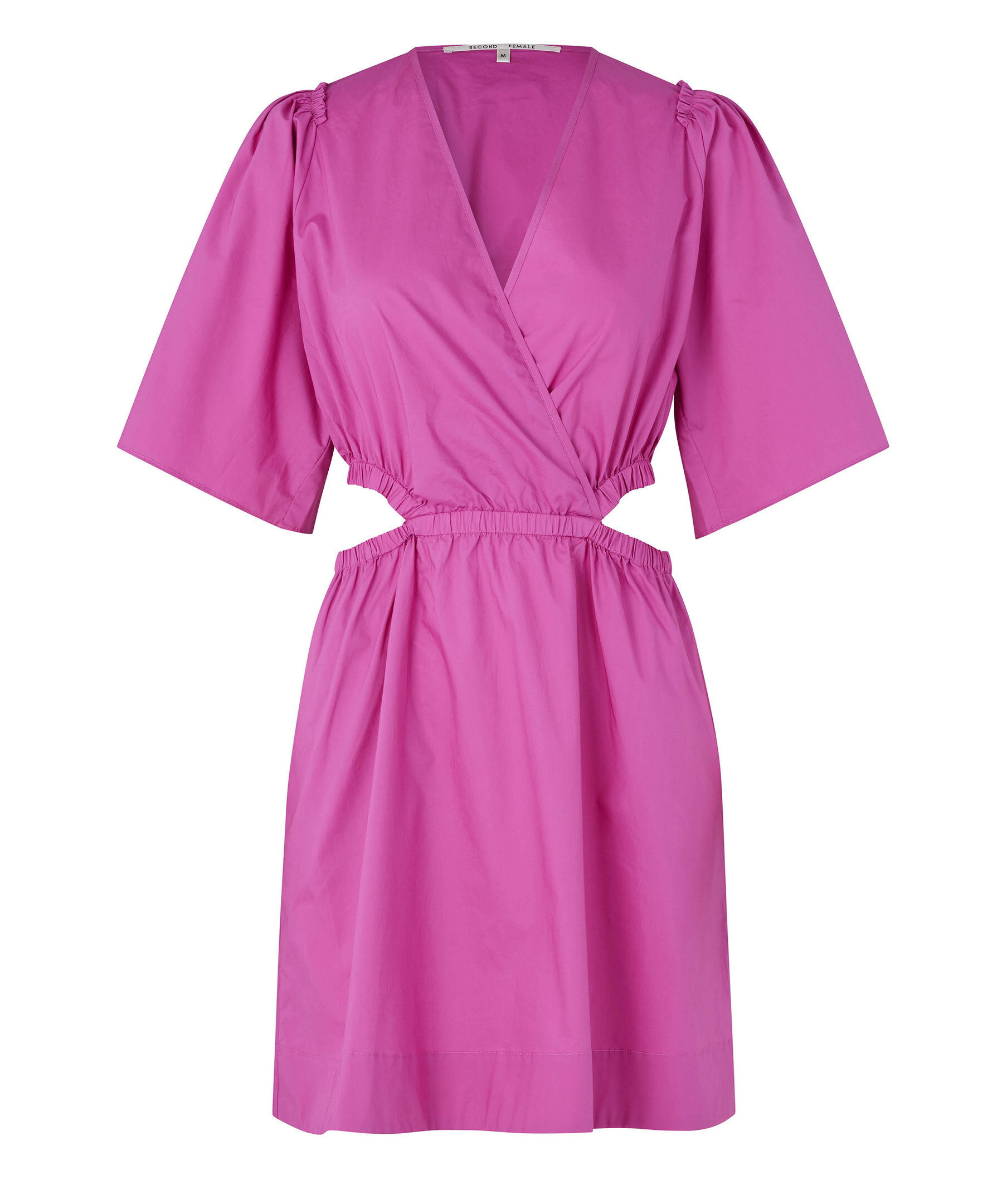 Cerisefärgad kort skuren klänning från Second Female. Tillverkad i lätt ekologisk bomull. Klänningen har en korsad halsringning och korta, utsvängda ärmar med volangkant vid axlarna. Utskurna detaljer i midjans sidor med resårkanter. Två innerfickor och slitsar i sidorna. Normal passform.
