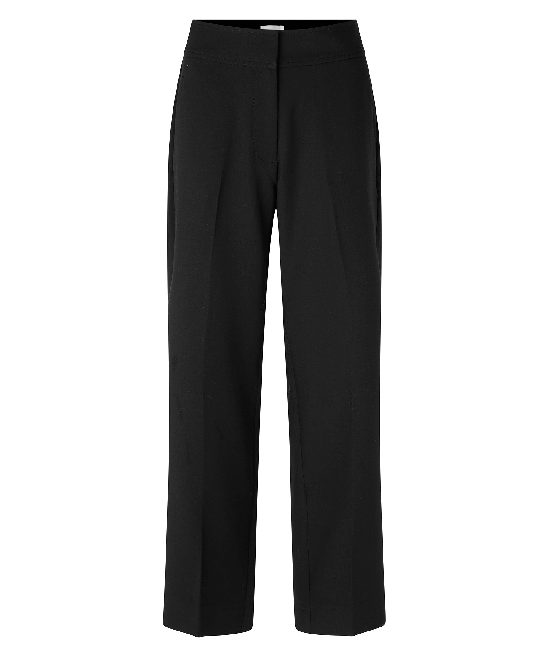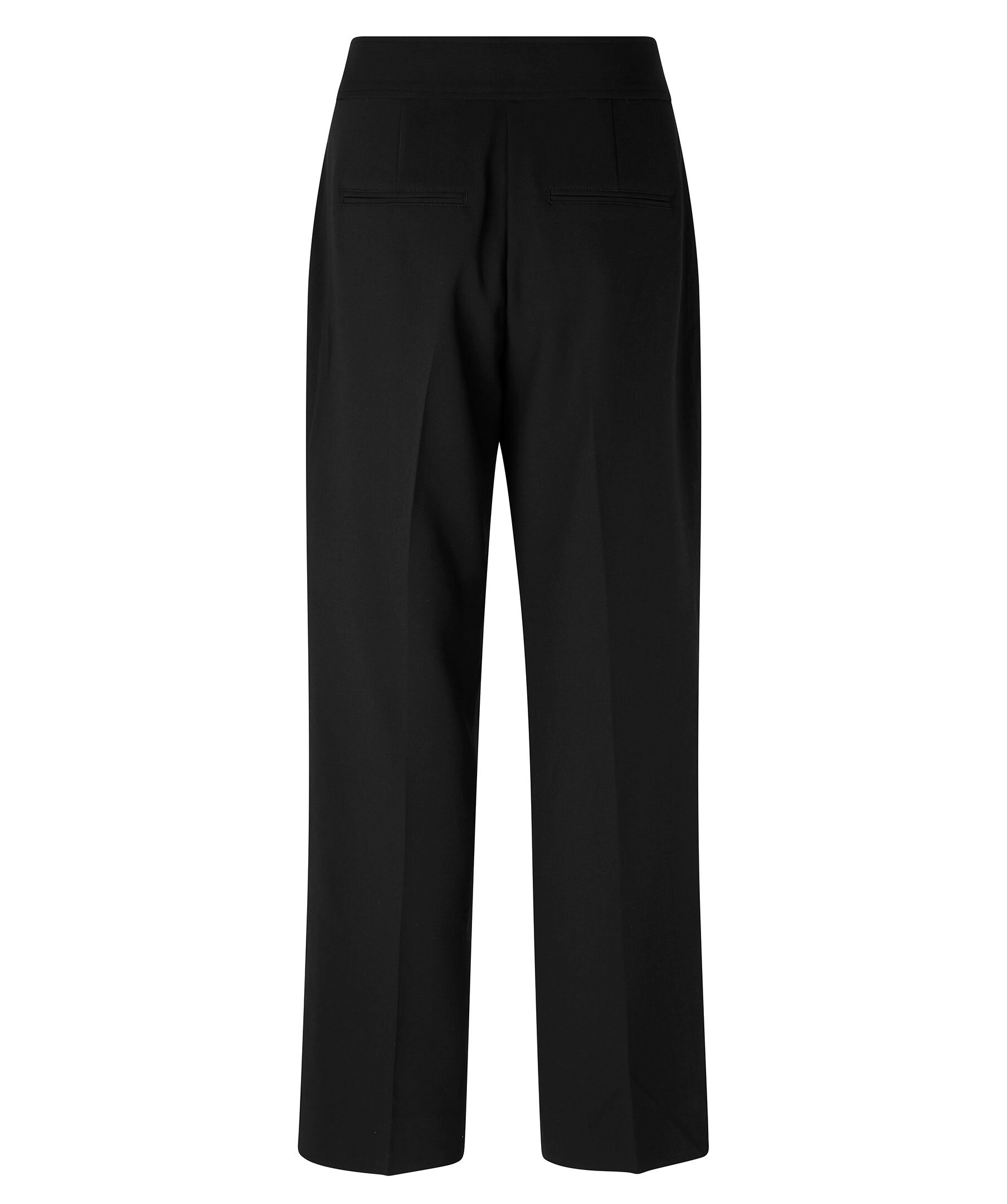 Svarta kostymbyxor med brett midjeband och raka ben från Second Female. Pressveck fram och dold gylf med dragkedja och stängning med knapp samt hake och hälla.
