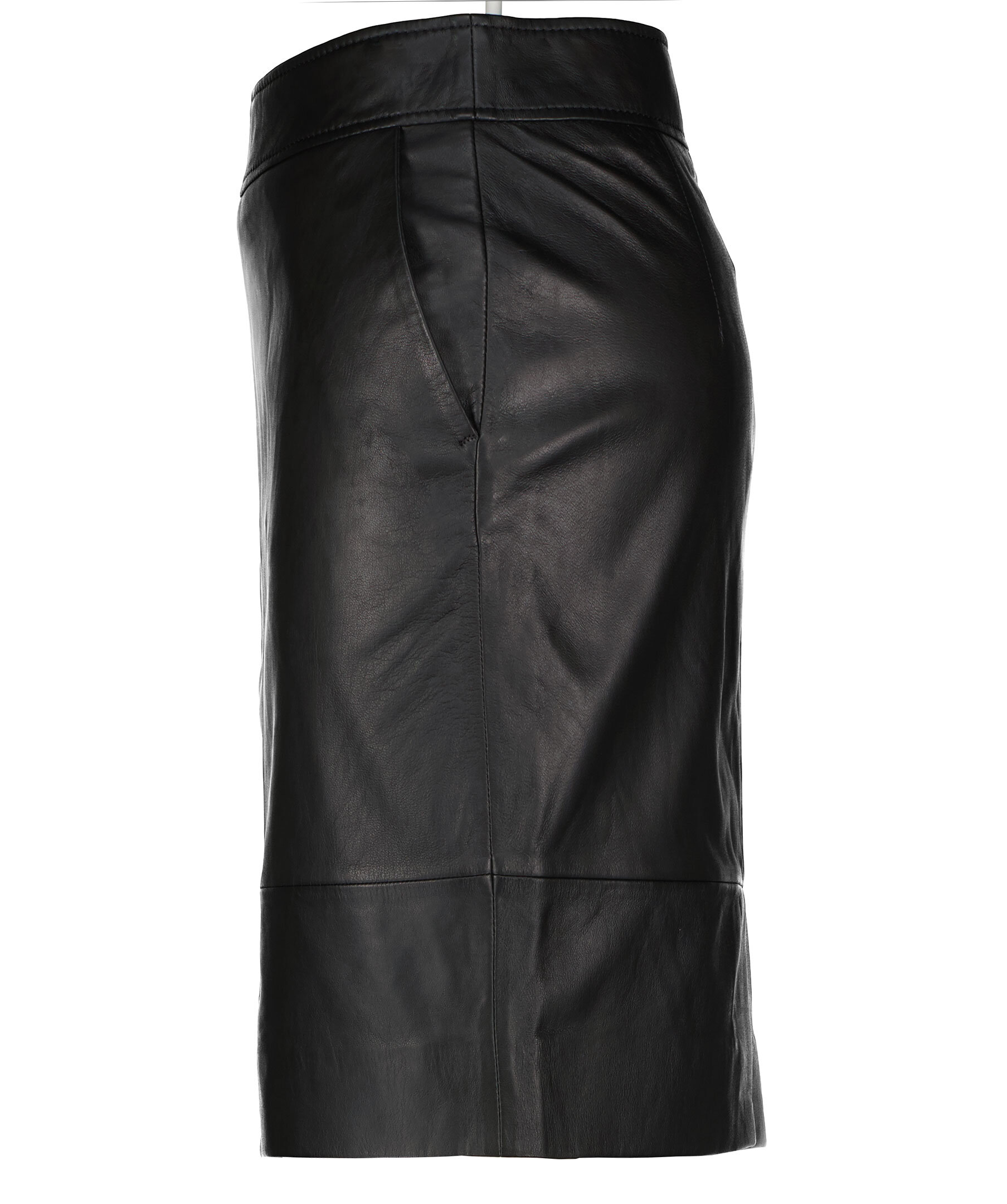 Svart pennkjol i läder från Second Female. Smal och figursydd passform med ett foder av polyester. Kjolen slutar strax över knäna, tunn dragkedja och tryckknapp bak och slits bak. Snedställda, öppna fickor i sidorna.