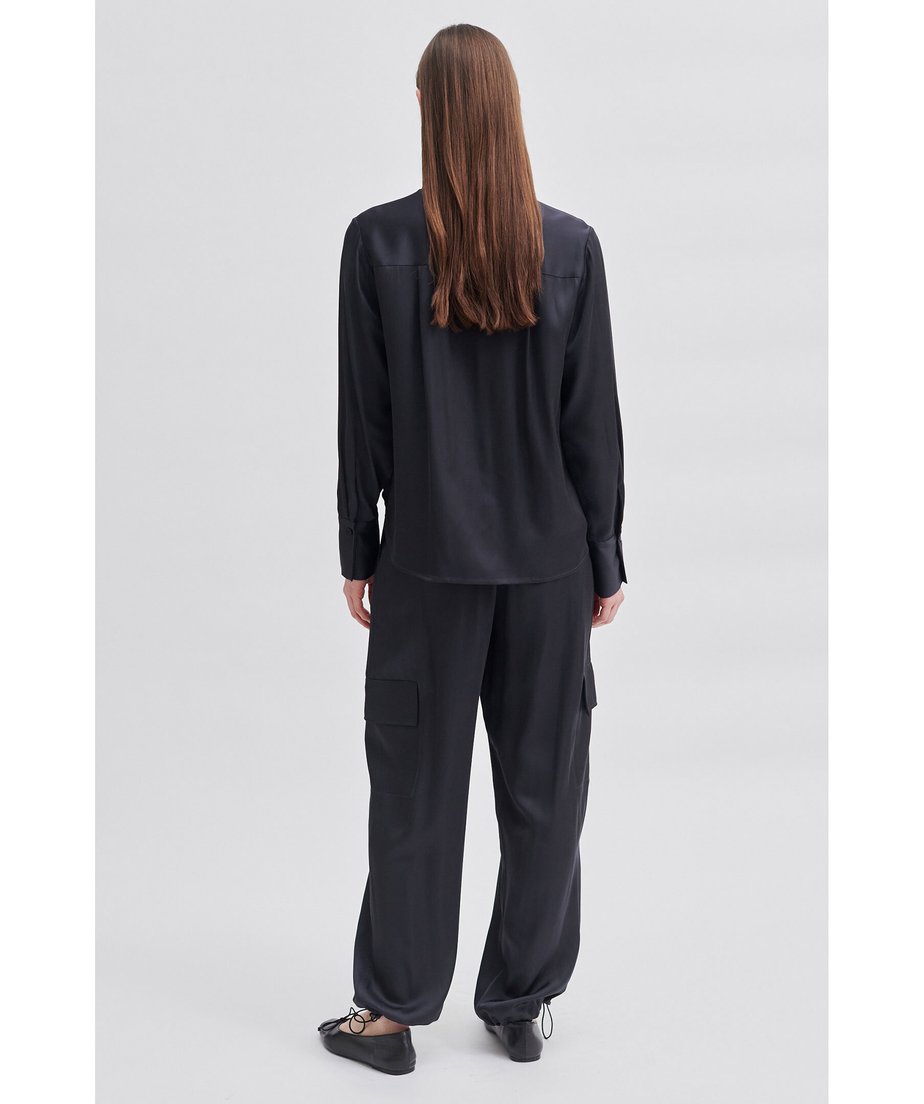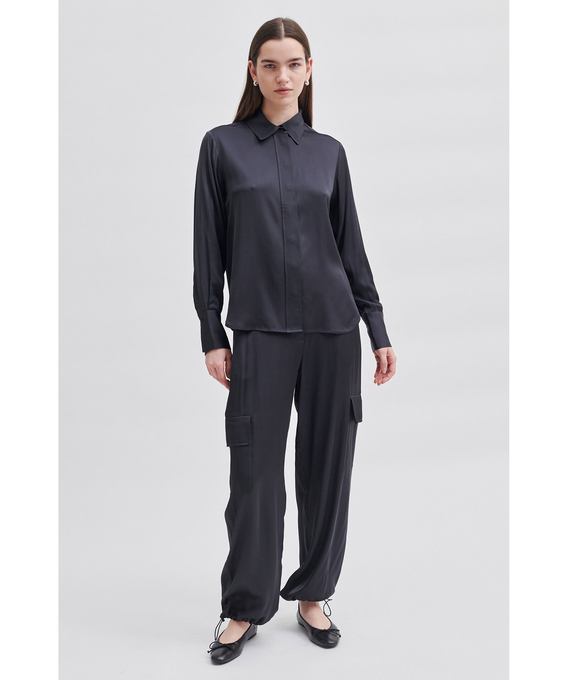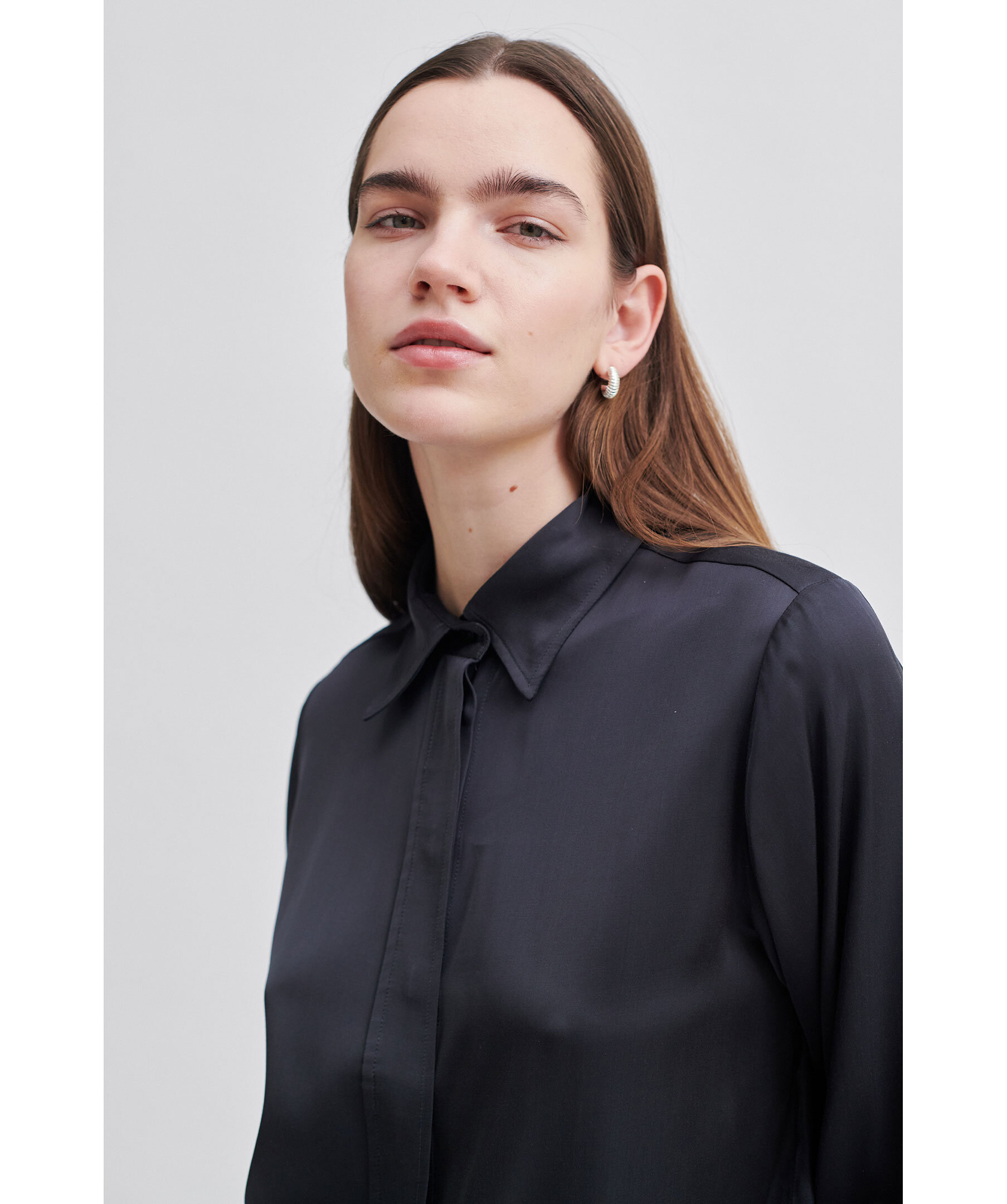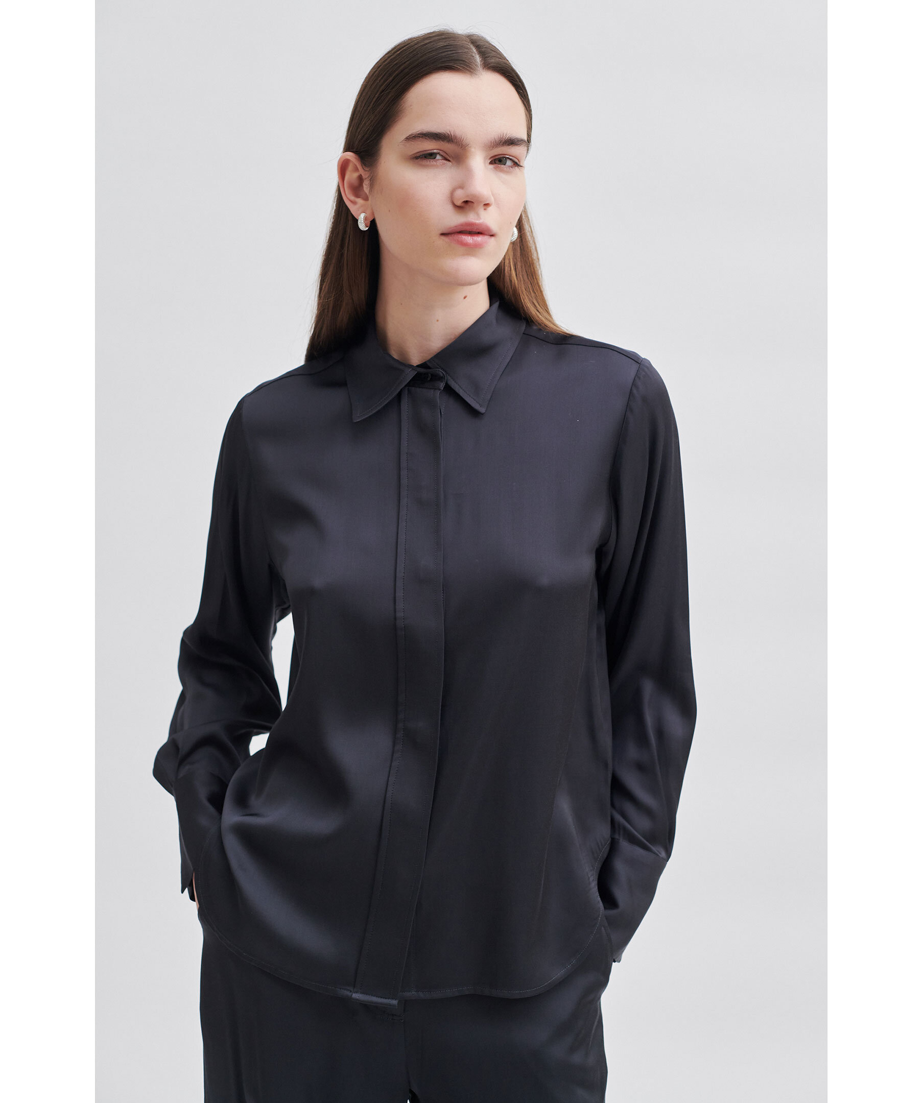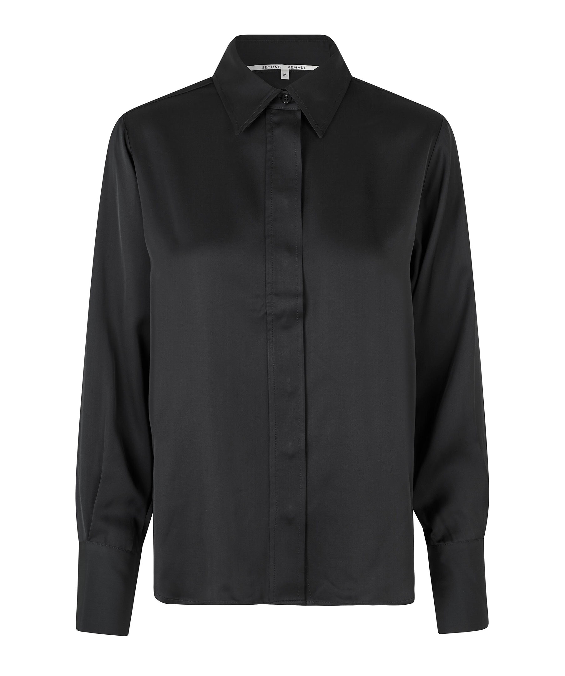 Mörkgrön skjorta från Second Female. Stängs framtill med dolda knappar. Spetsig krage. Breda manschetter vid ärmslut. Tillverkad i 100% Viskos.