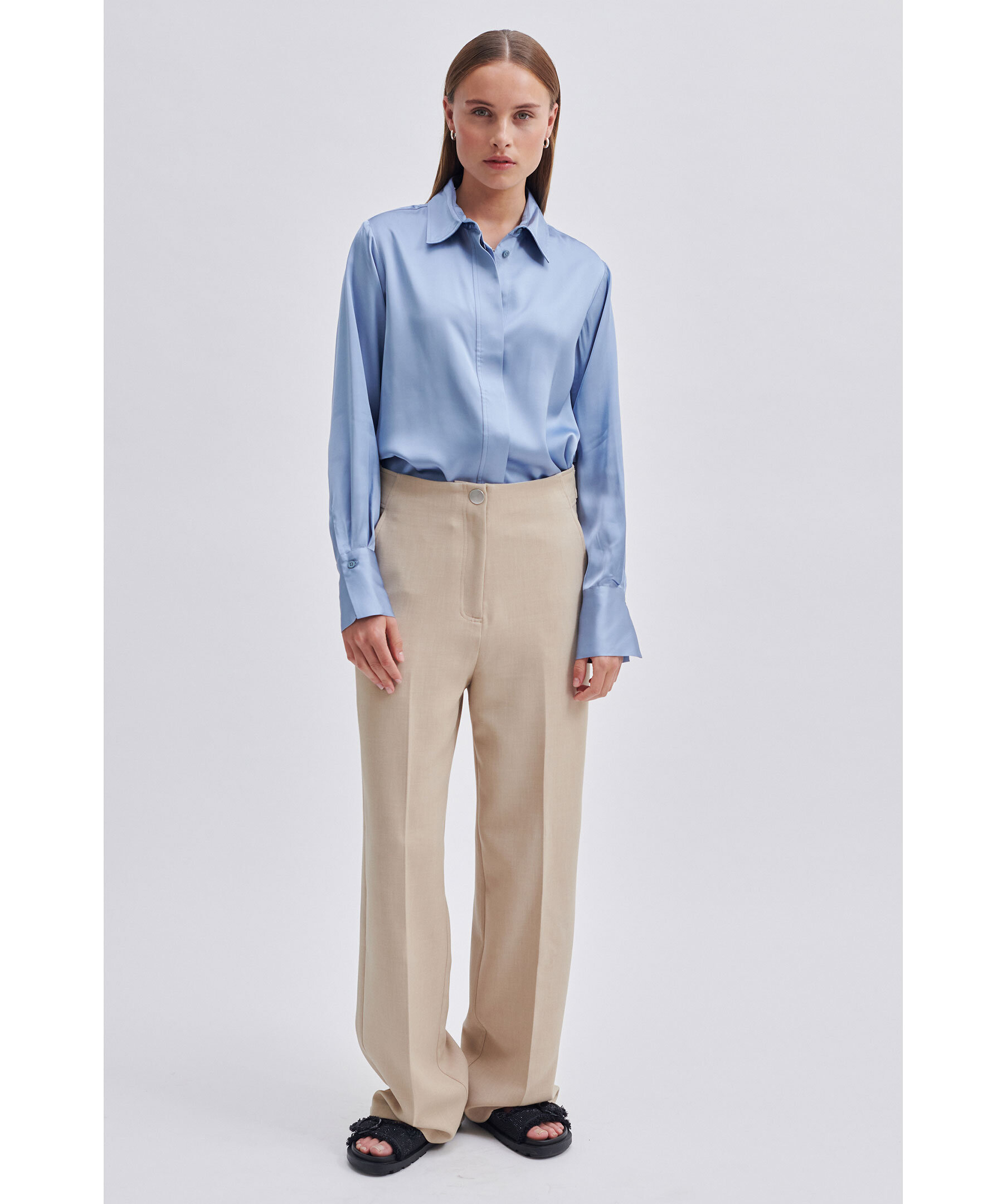 Dovt blå silkskjorta från Second Female. Tillverkad i supermjuk och slät viskos med glansig kvalitet. Vanlig krage med knappslå och dold knäppning framtill med synlig toppknapp. Långa ärmar med breda muddar och enkelknappsstängning med slitsar i ändarna. Vanlig passform med avslappnad siluett.