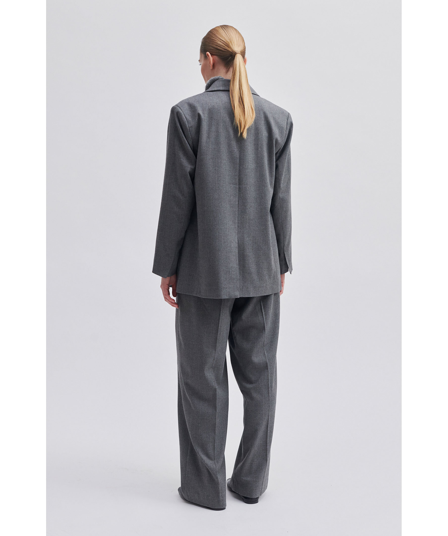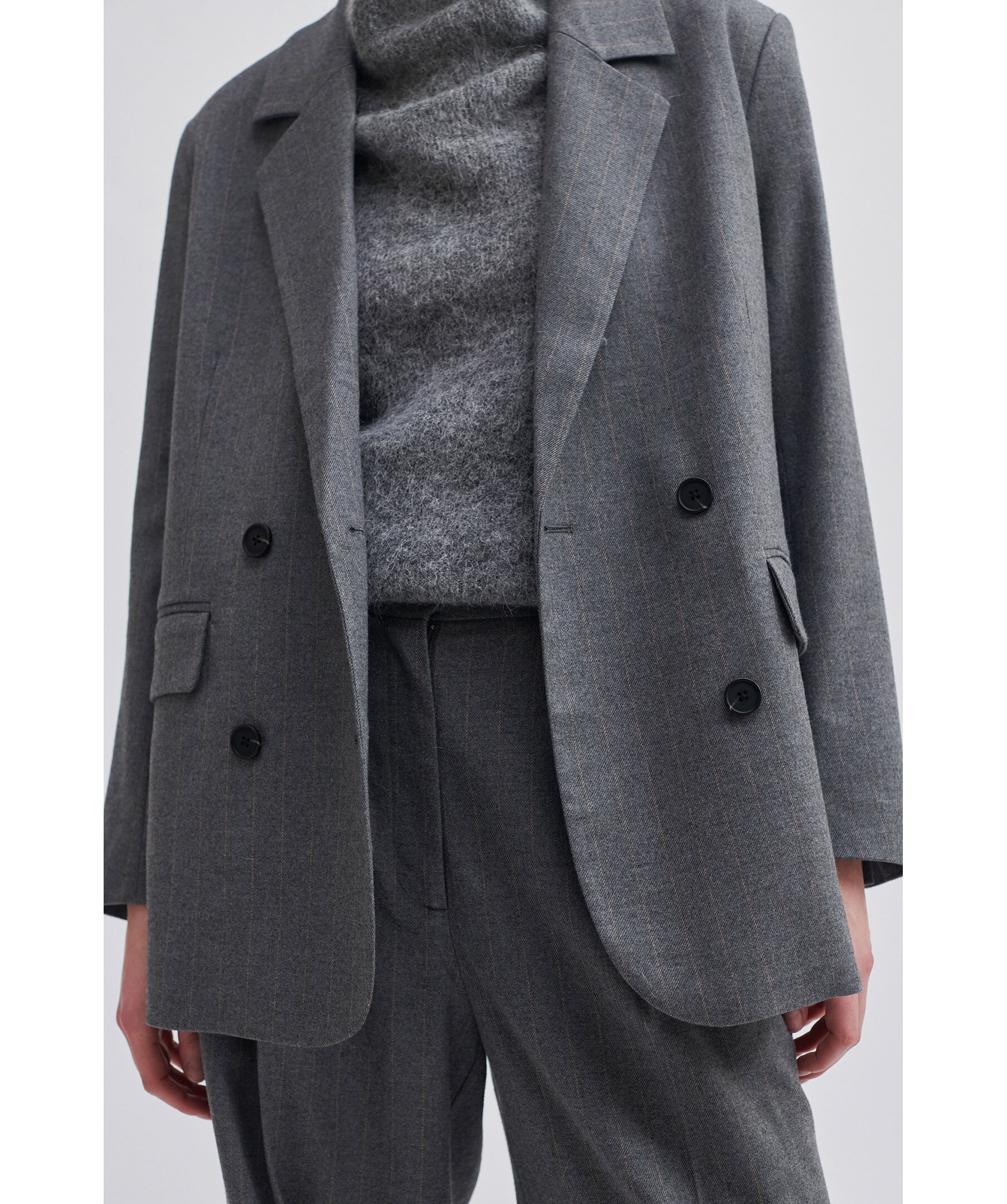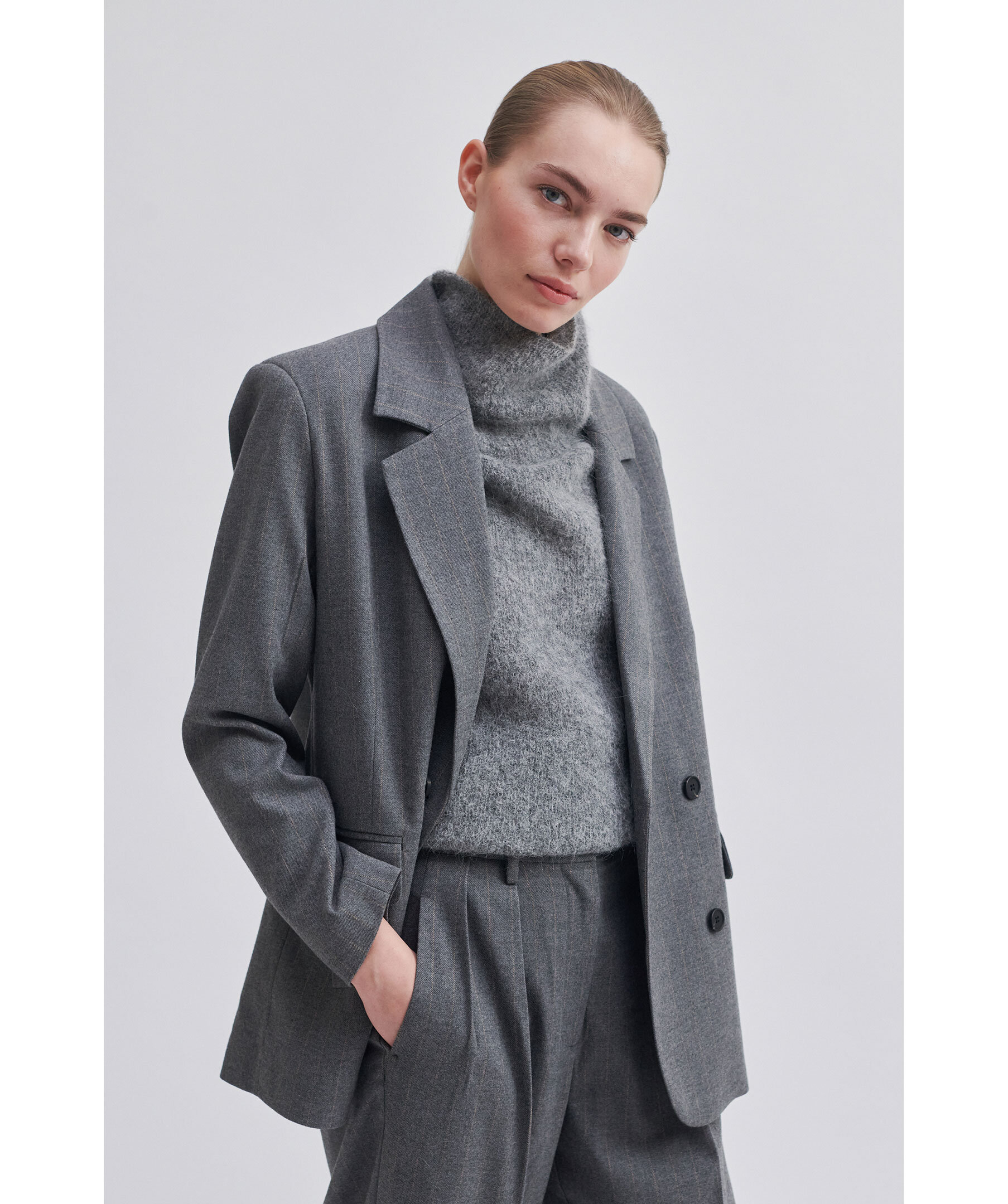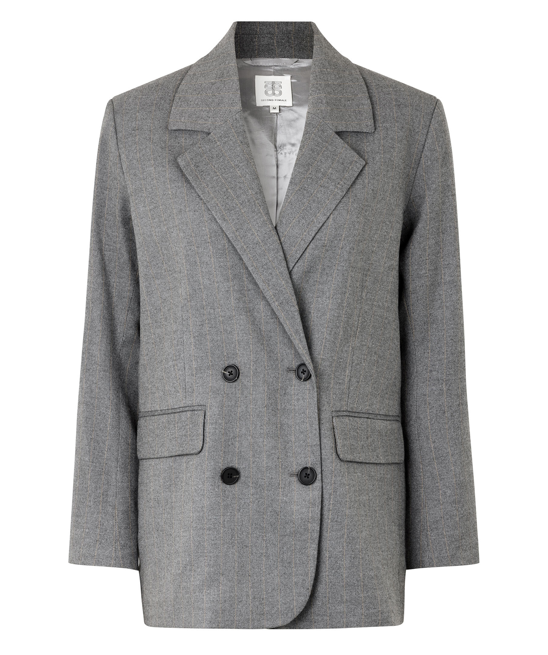 Grå kavaj från Second Female med kritstrecksränder. Breda och trubbiga slag, dubbelknäppt stängning och lätt vadderade axlar. Två framfickor med ficklock. Avslappnad och rak passform som skapar en något androgyn siluett. Helfodrad.
