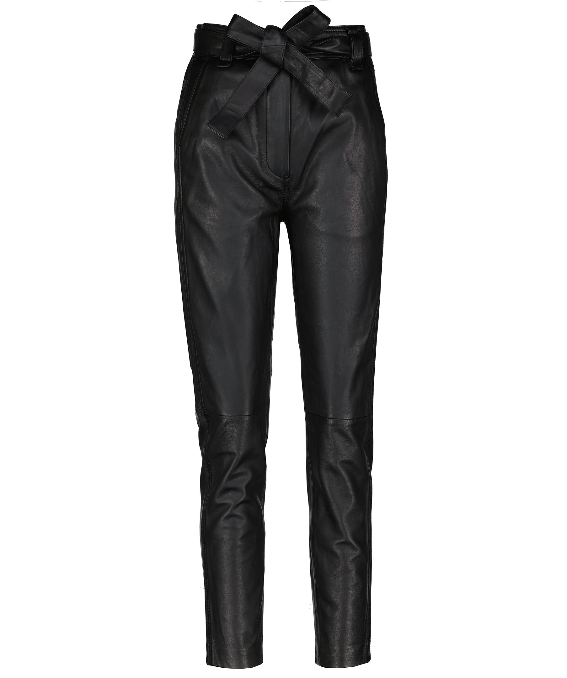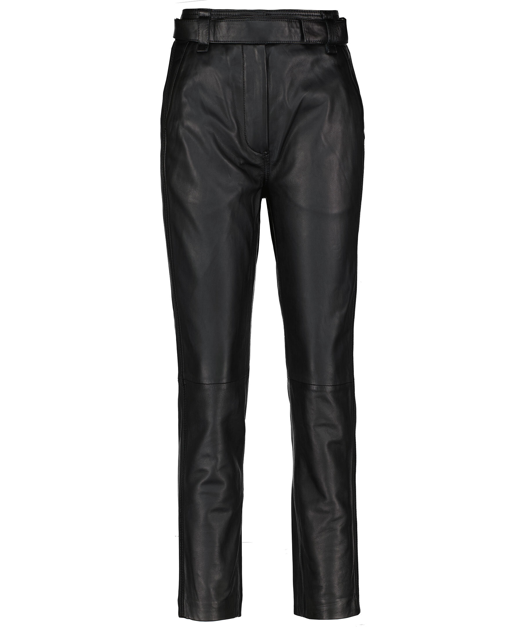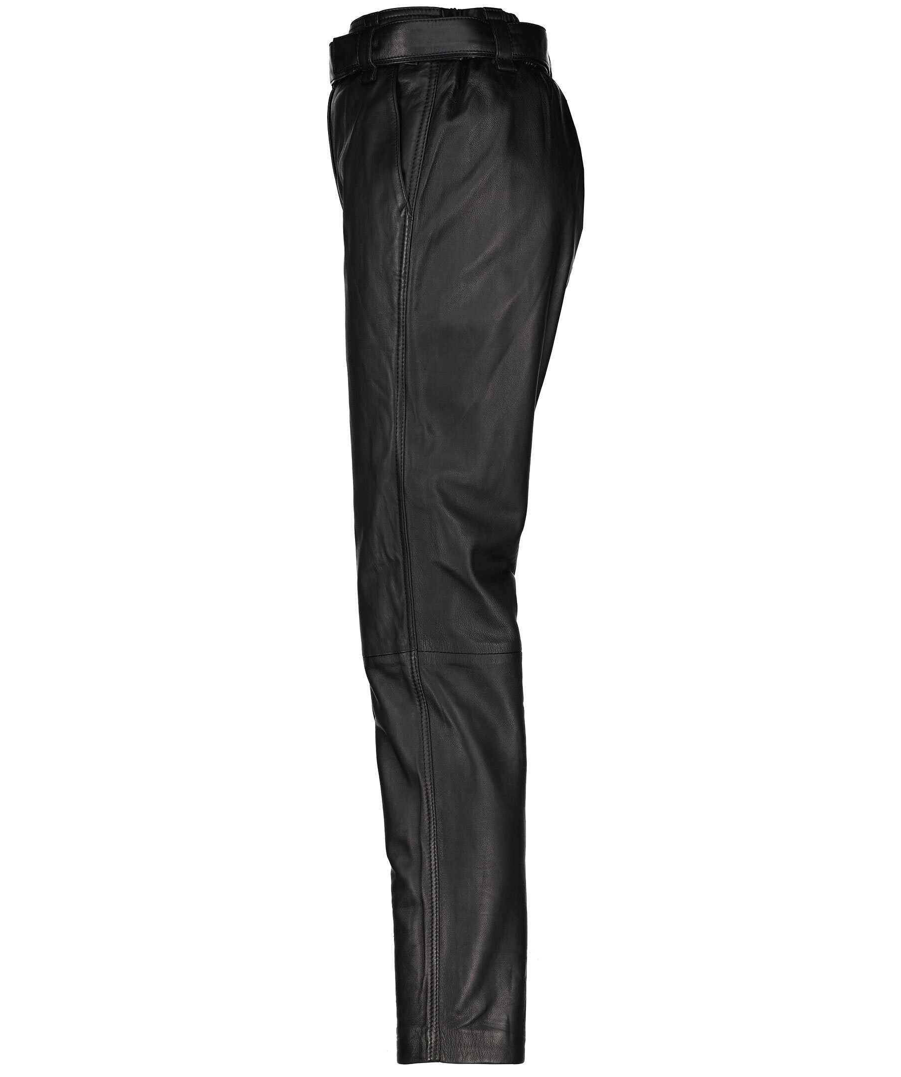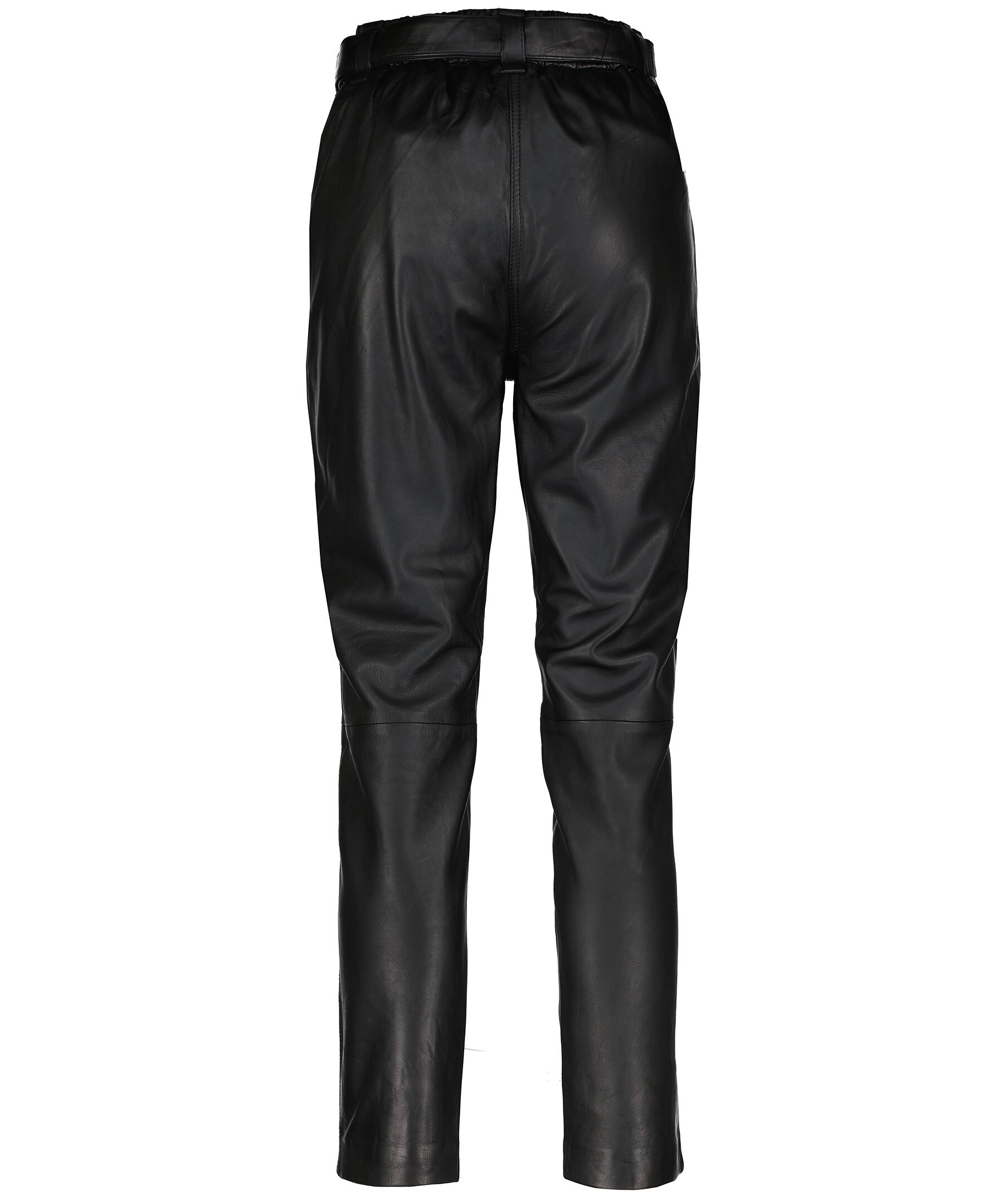 Svarta byxor i läder från Second Female. Raka ben och skuren längd. Fickor fram och hällor och bälte i midjan. Dold dragkedja och tryckknapp fram. Har ett foder i glansigt polyester.