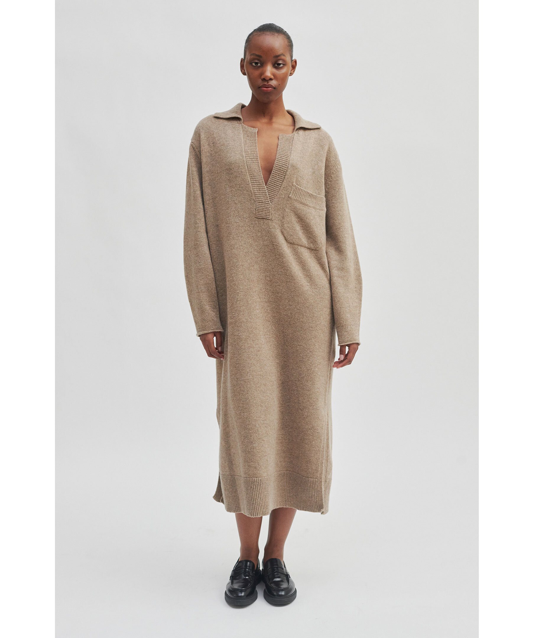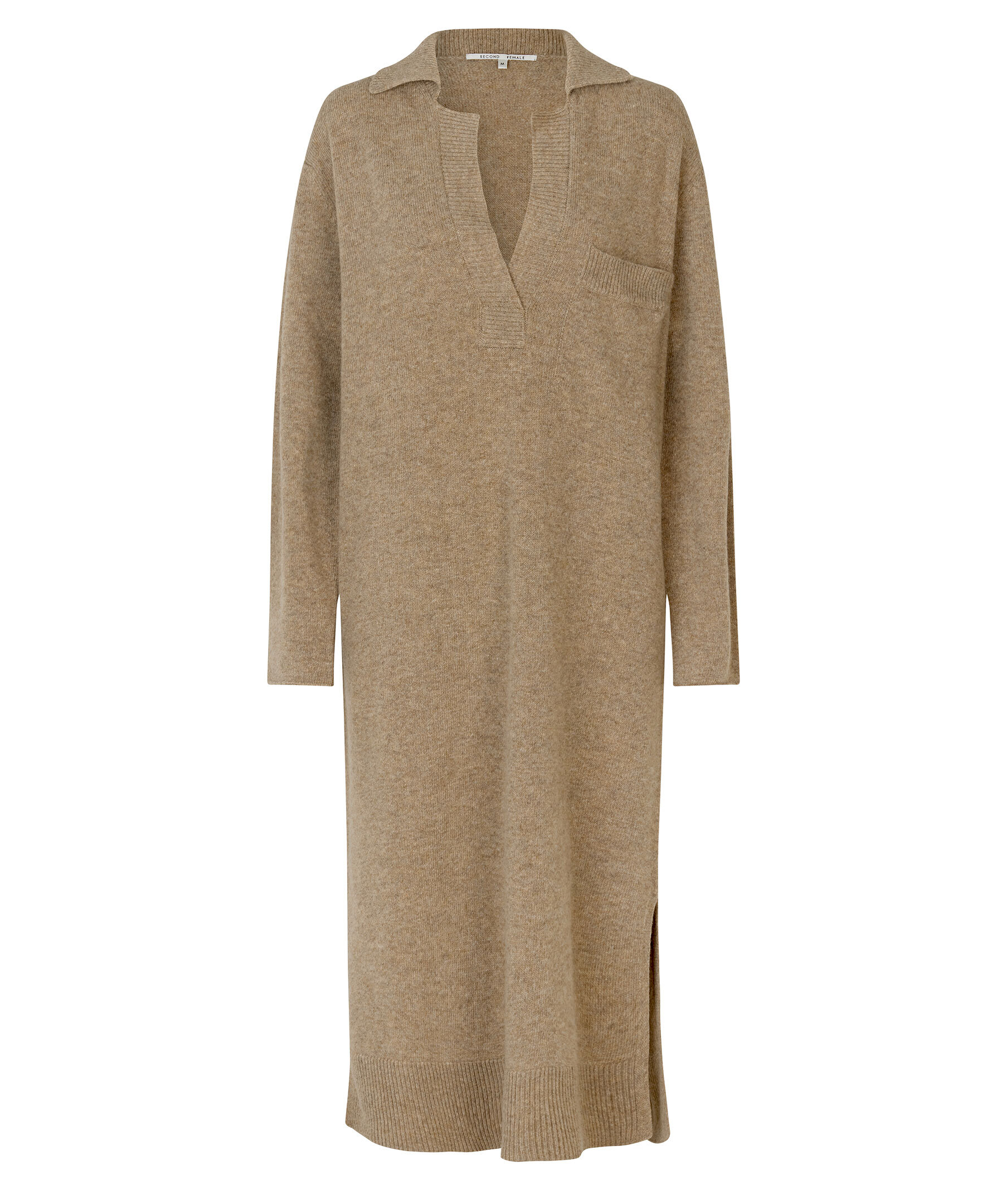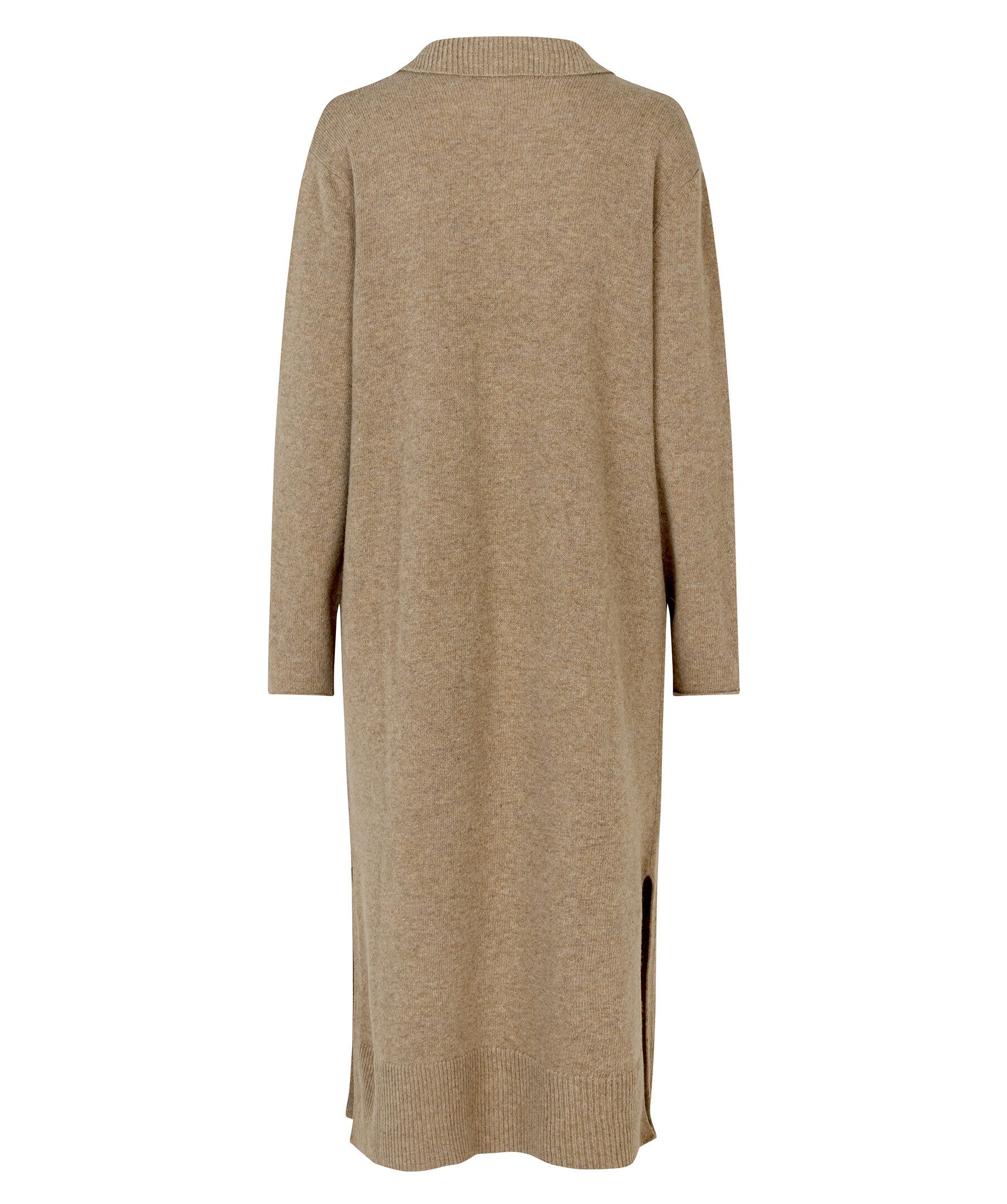 Beige, stickad långklänning med lös passform och långa ärmar från Second Female. Klänningen har en v-ringad hals med krage och ribb. Vid bröstet finns en ficka och i sidsömmarna finns slitsar. Ribbade kanter i ärmslut, ring ringningen och i plaggslut.