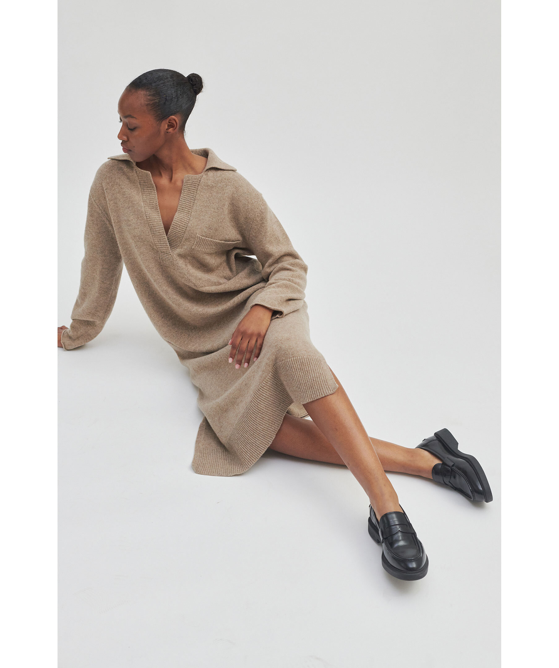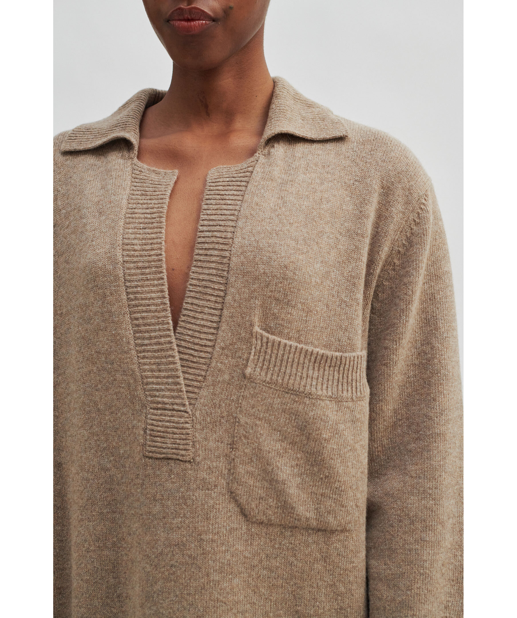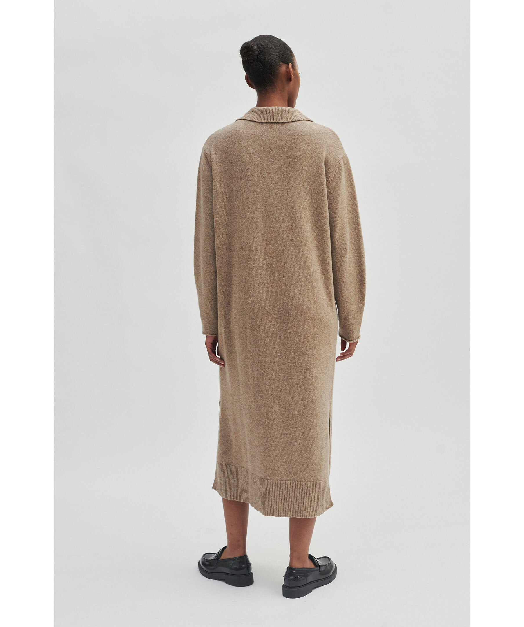 Beige, stickad långklänning med lös passform och långa ärmar från Second Female. Klänningen har en v-ringad hals med krage och ribb. Vid bröstet finns en ficka och i sidsömmarna finns slitsar. Ribbade kanter i ärmslut, ring ringningen och i plaggslut.