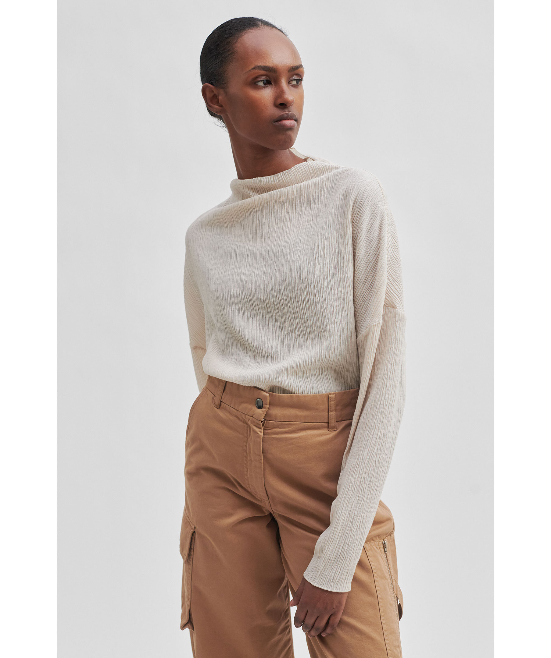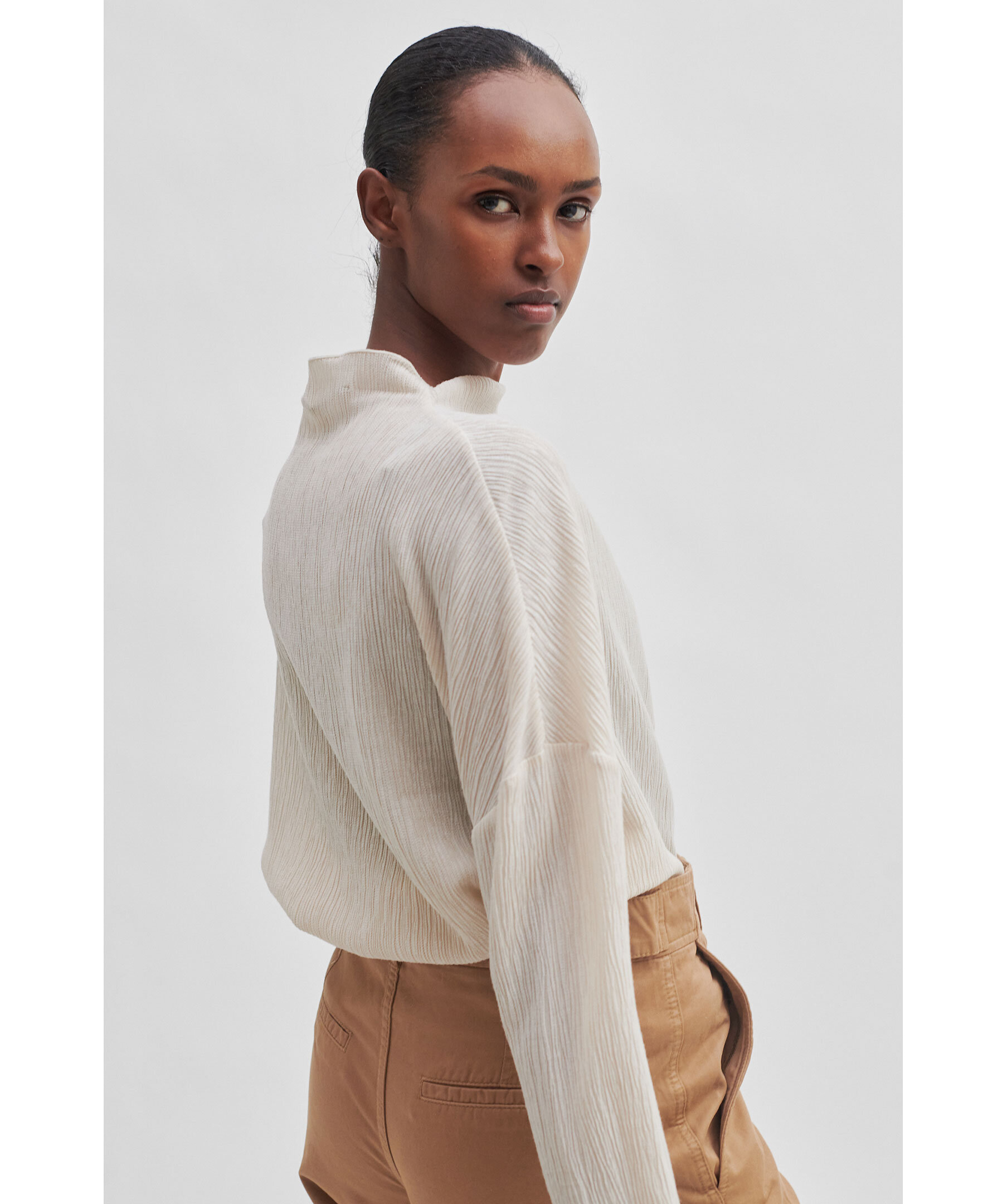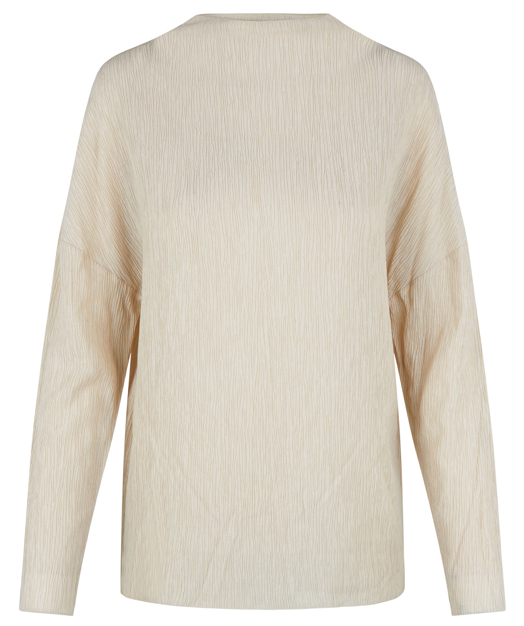 Beige blus från Second Female. Långärmad modell med hög krage i crepe-kvalitet.
