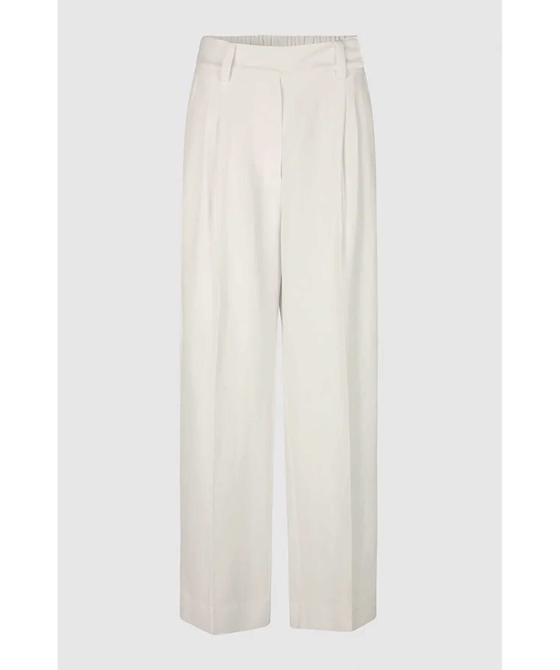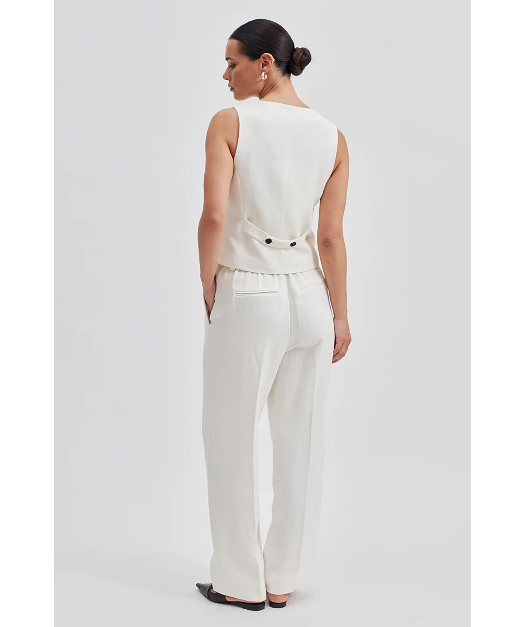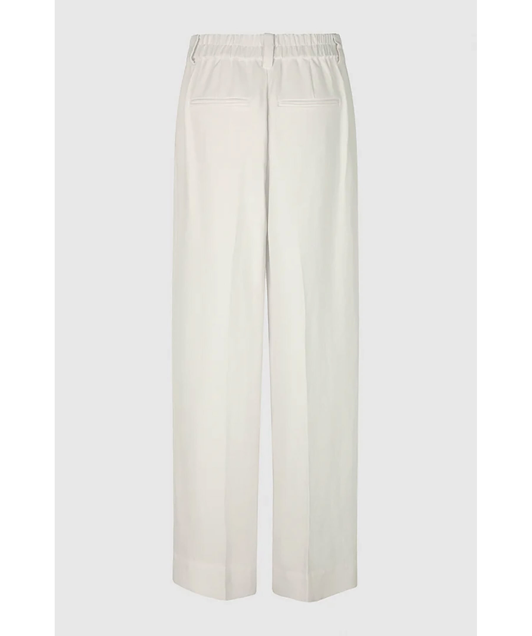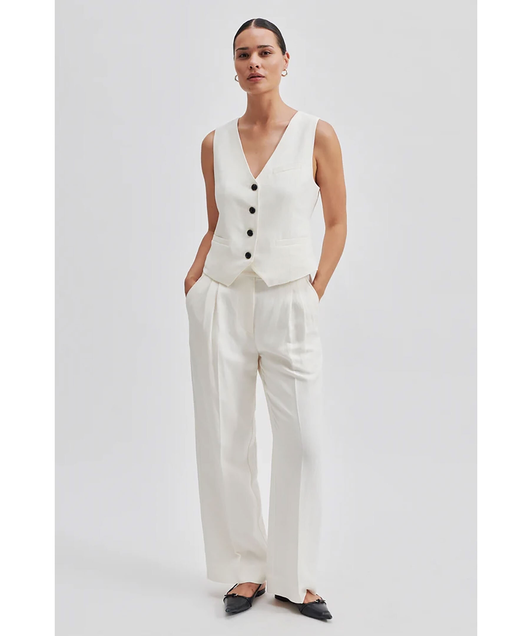 Vita linnebyxor från Second Female. Höga i midjan. Pressveck fram och baktill. Två fickor framtill, två bakfickor. Hällor för bälte. Tillverkade i Linneblandning.