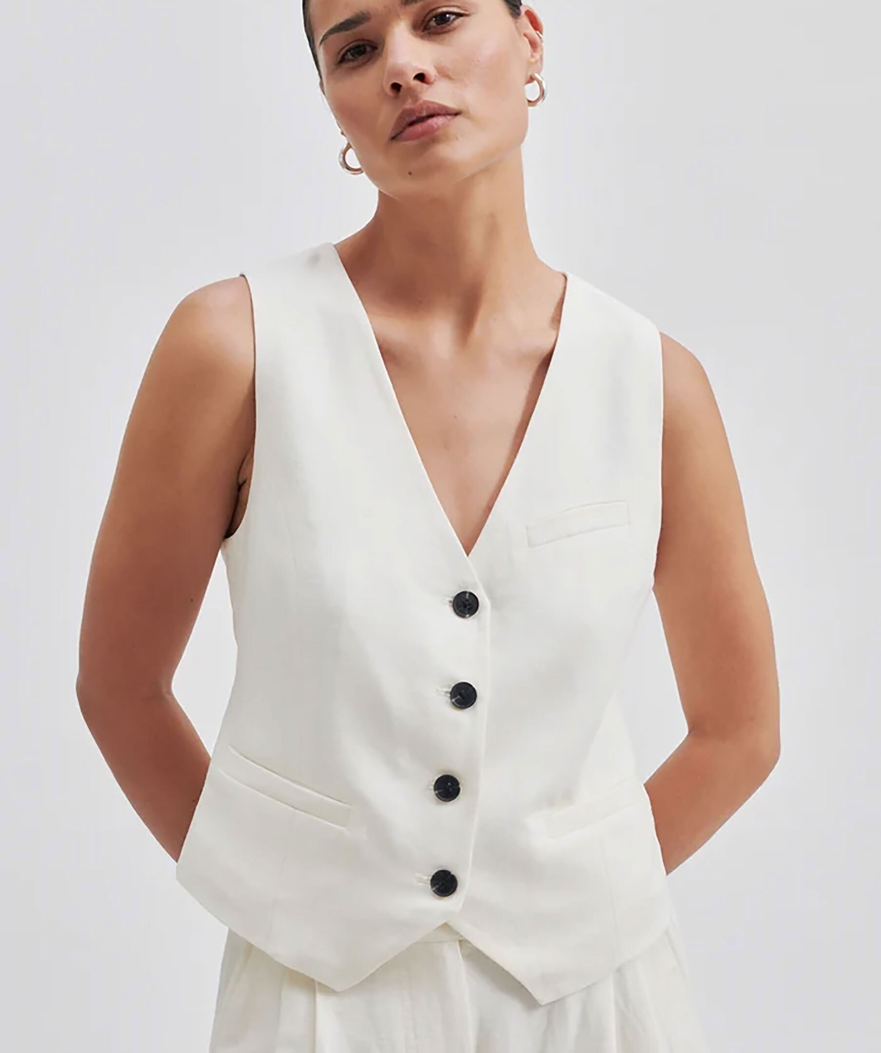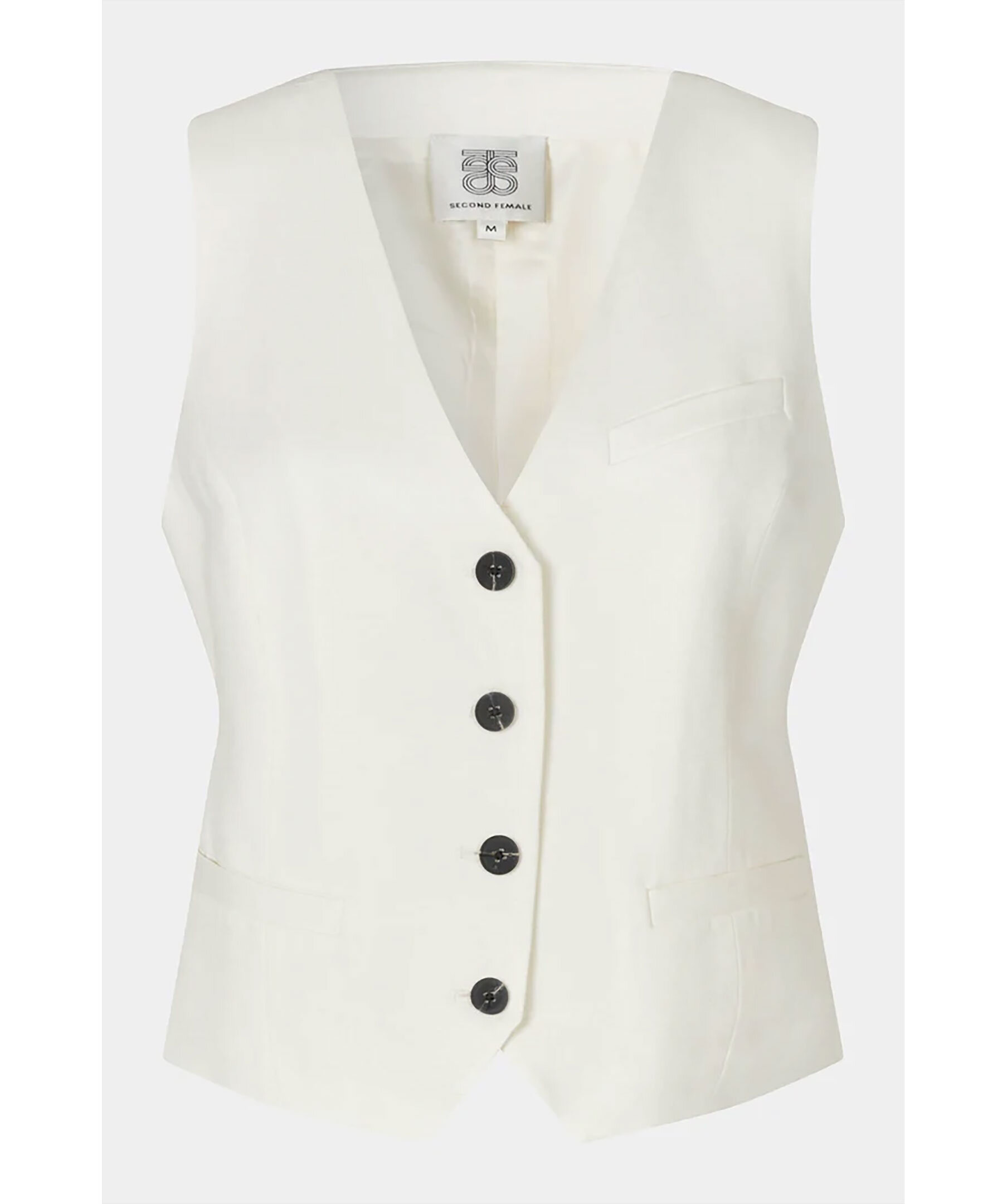 Vit linneväst från Second Female. Stängs framtill med svarta knappar. Två snedställa fickor framtill, en bröstficka på vänster sida.