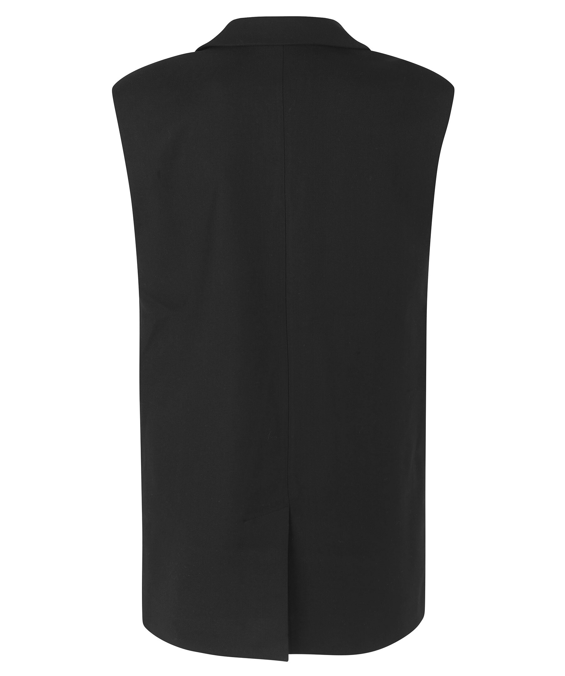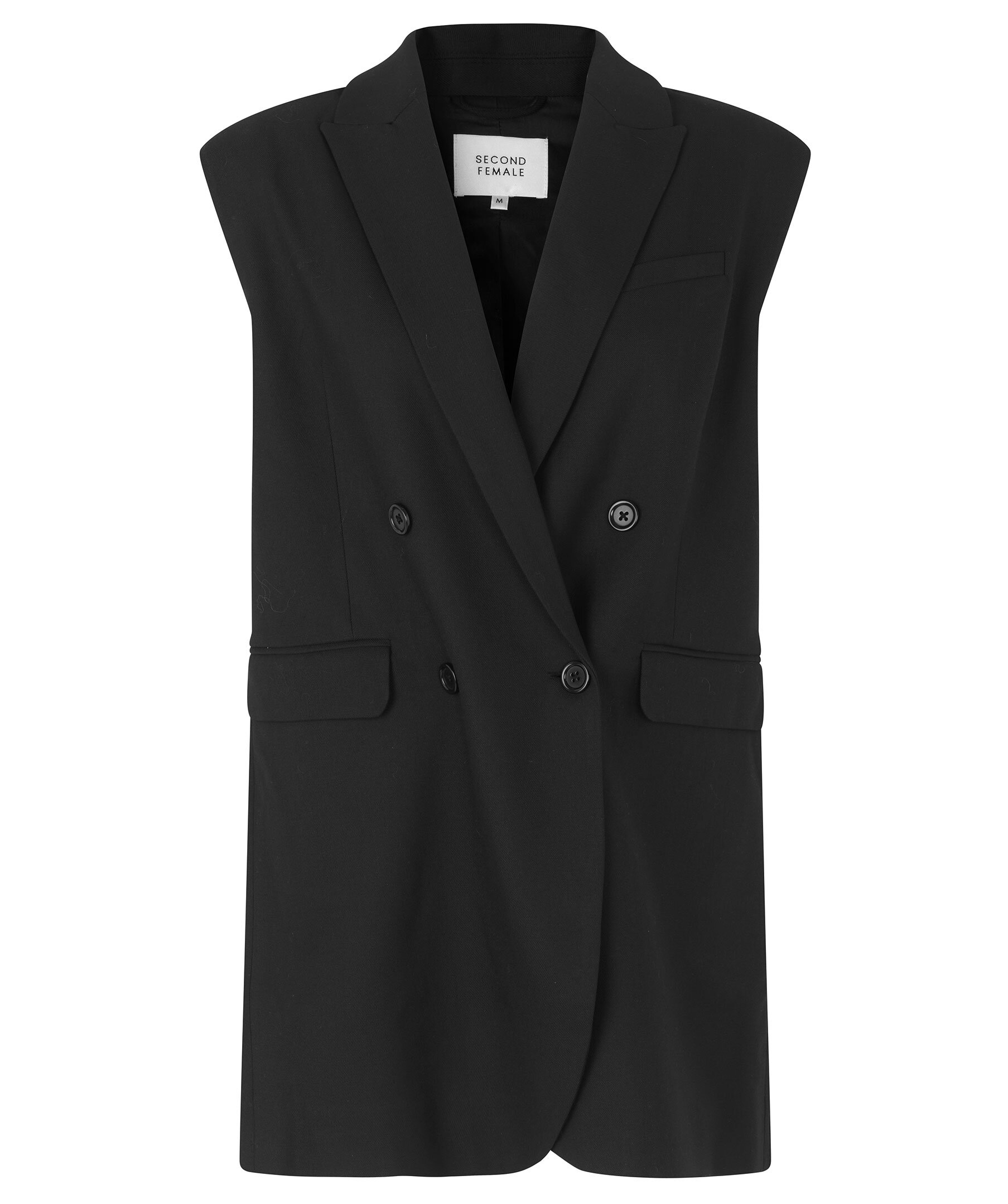 Svart kostymväst från Second Female med dubbelknäppning. Västen har en rak siluett, slutar strax nedanför rumpan. Två fickor fram, slits baktill.