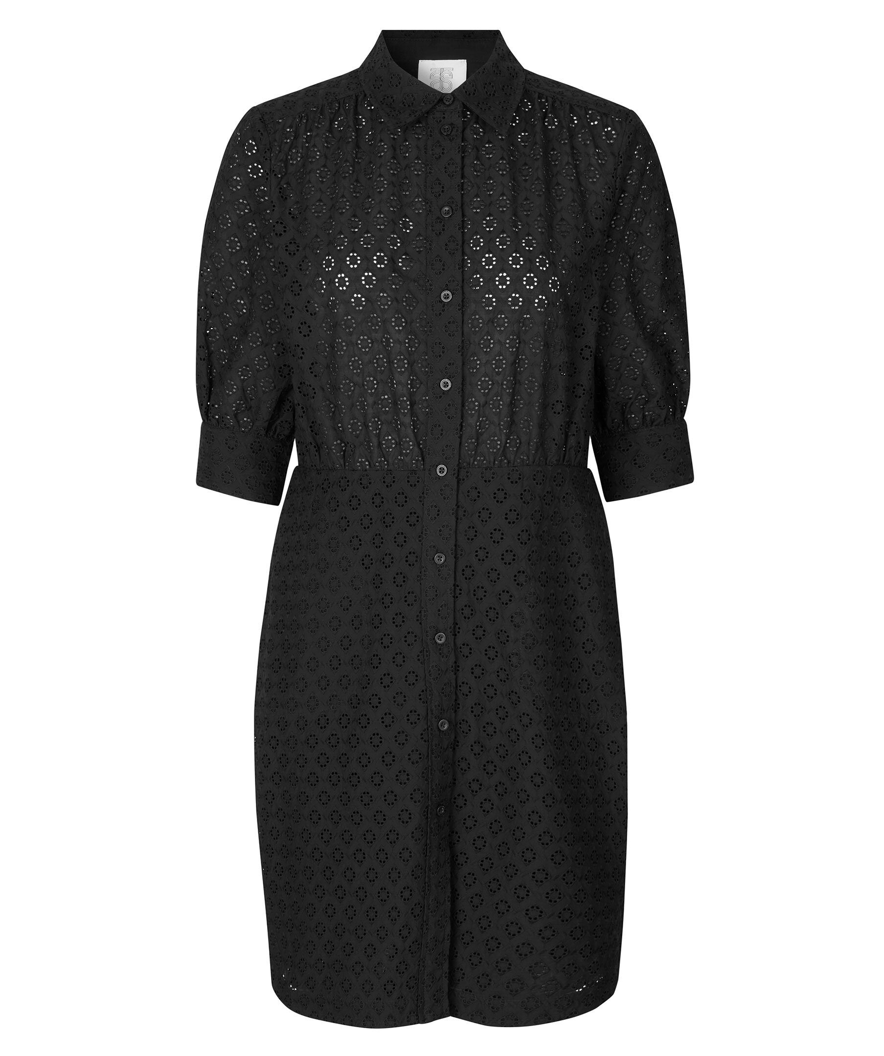 Svart bomullsklänning med krage från Second Female. Klänningen slutar vid knäna och har ett utstansat blommönster som ger en känsla av spetts. Klänningens kjolparti har ett tunt bomullsfoder, överdelen är semitransparent. Stängs med knappar längst mitten och har två sidfickor. Ärmarna slutar vid armvecket. Något figursydd.
