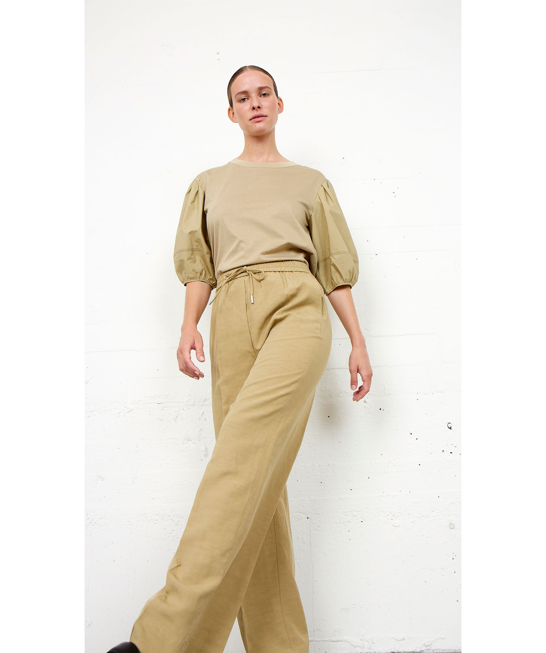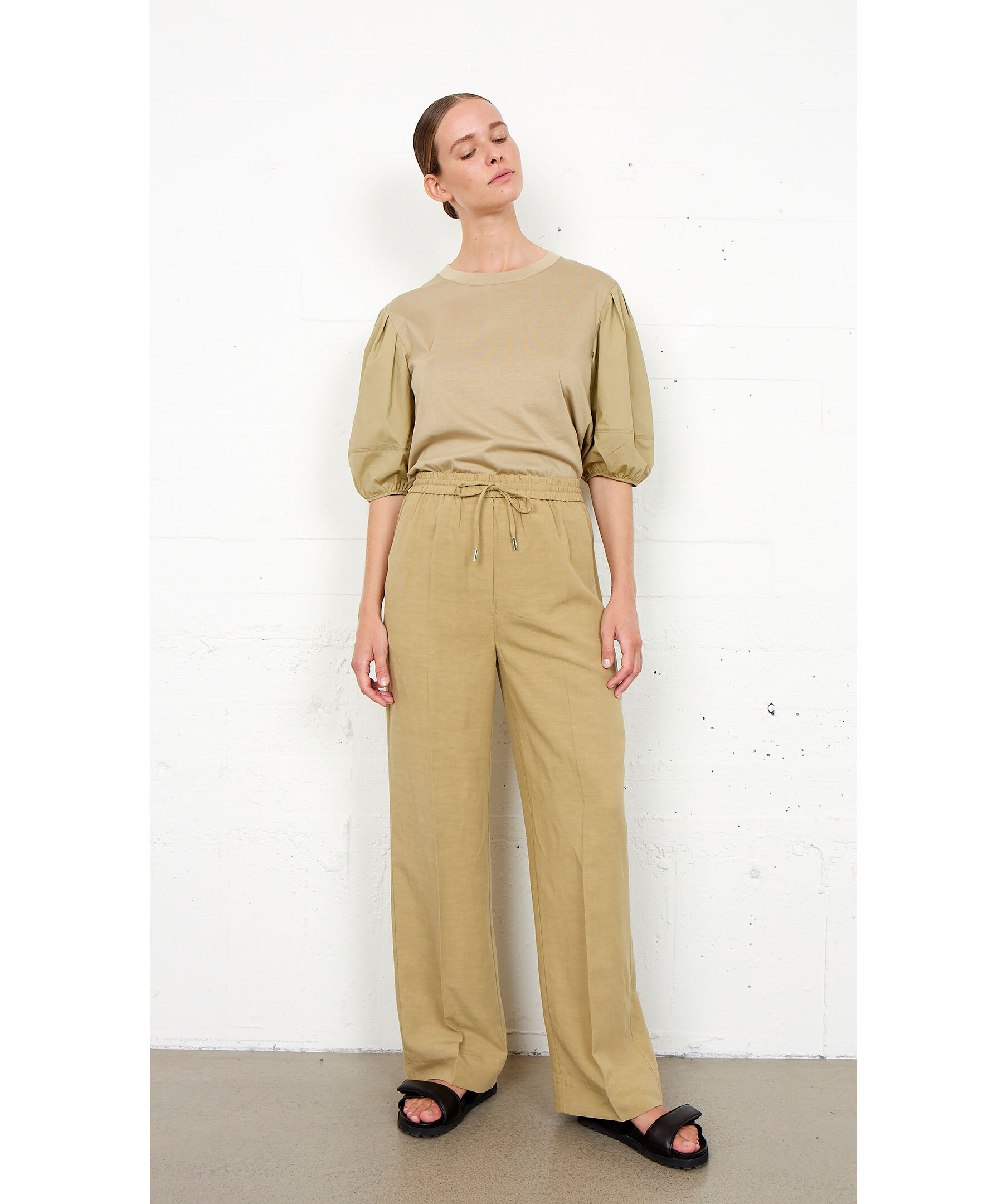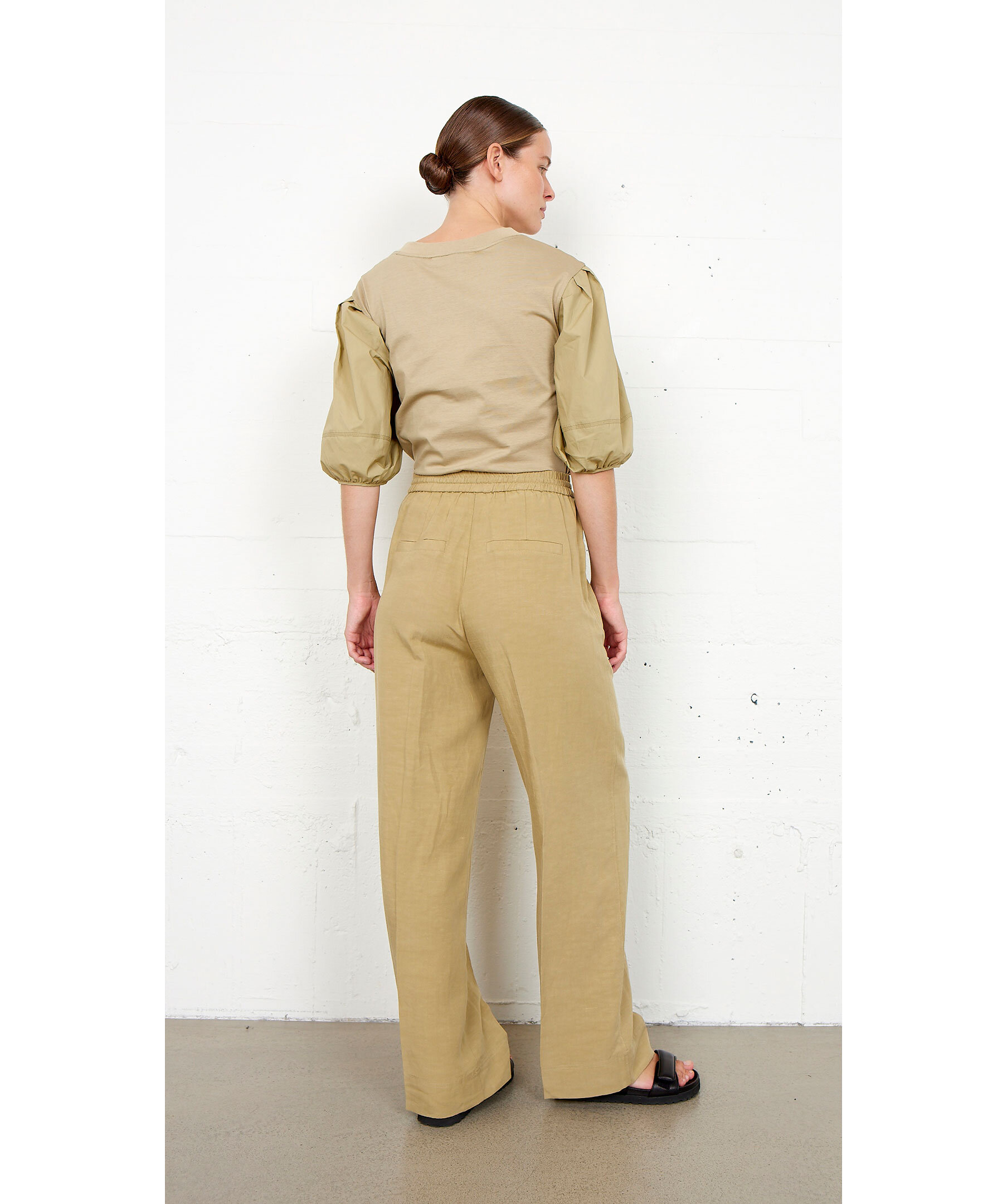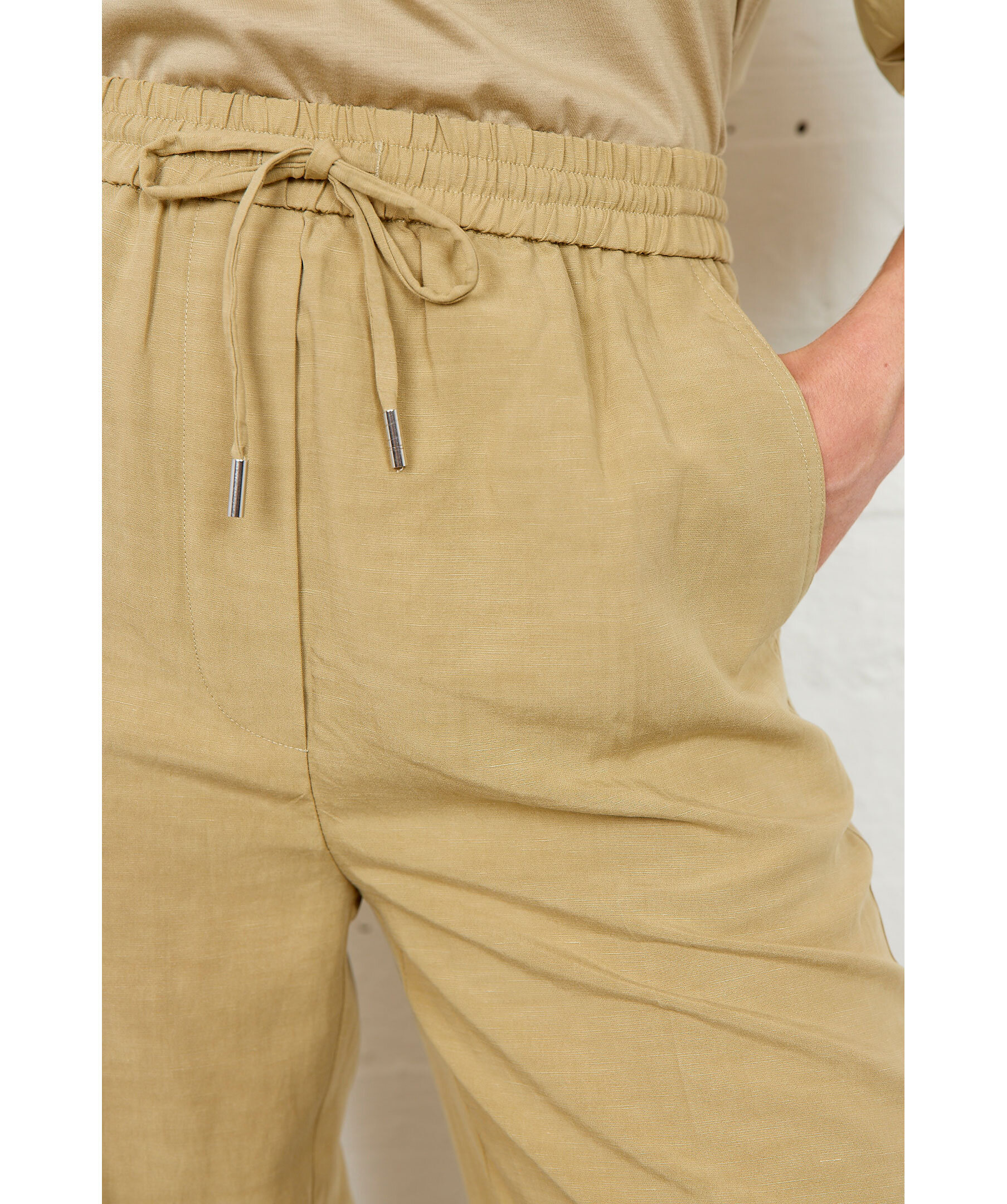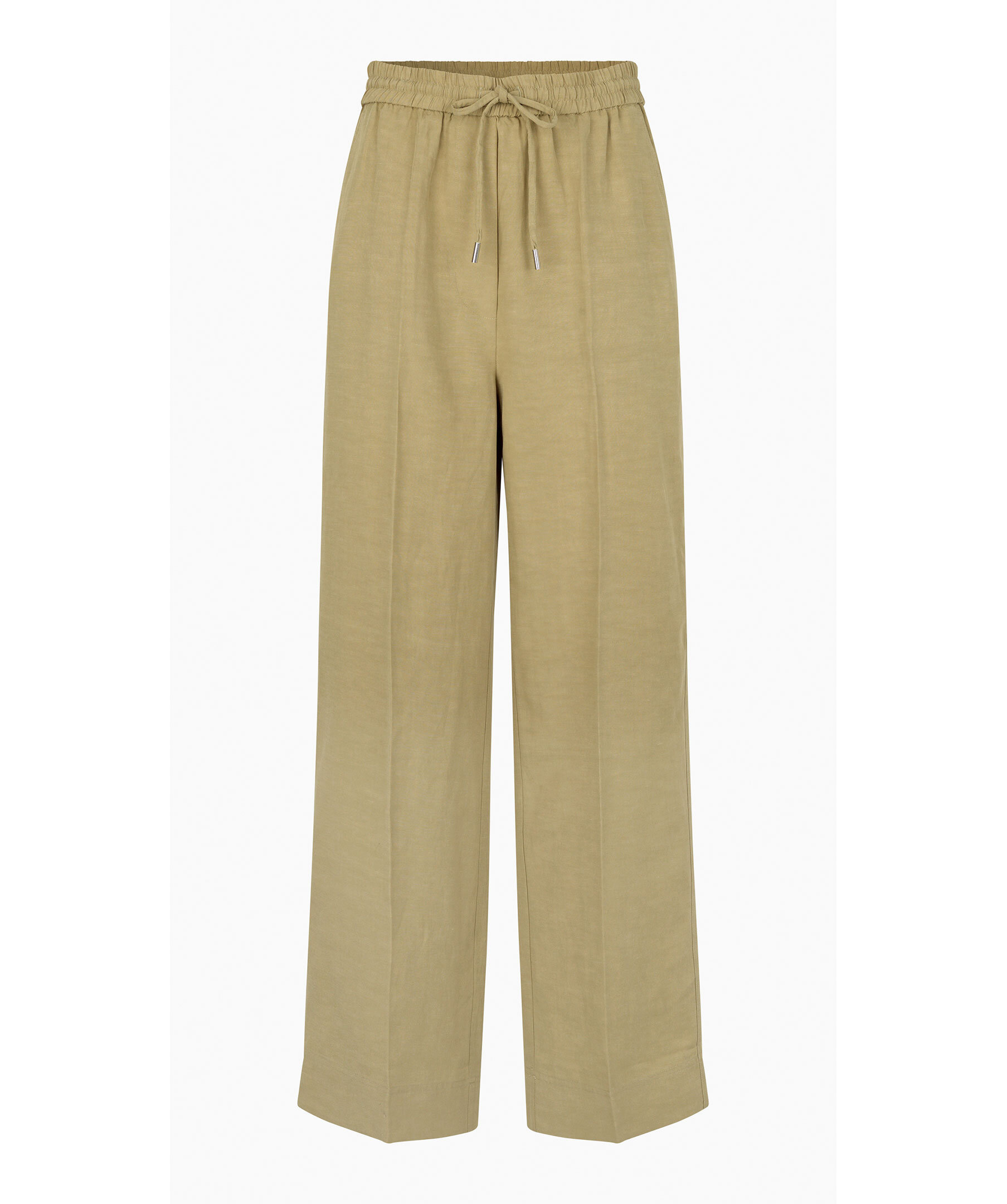 Khakifärgade linnebyxor i avslappnad modell med raka ben från Second Female. Tillverkade i en lätt tencel-linneblandning. Resår med dragsko i midjan, två snedställda fickor fram och två dekorativa passpoalfickor bak. Hög midja med raka, lösa ben.