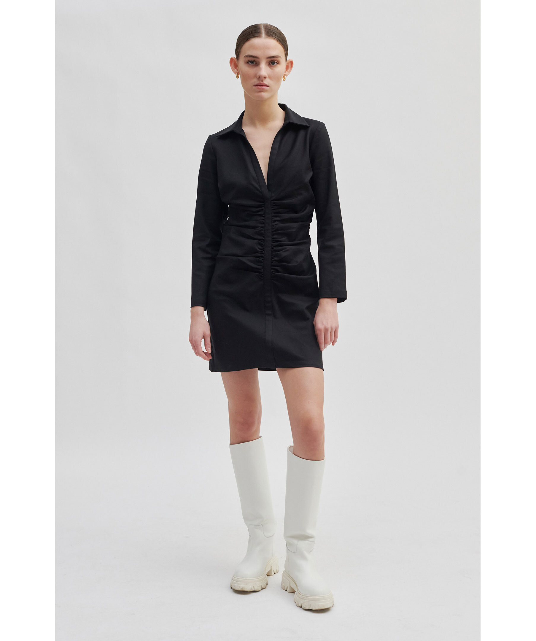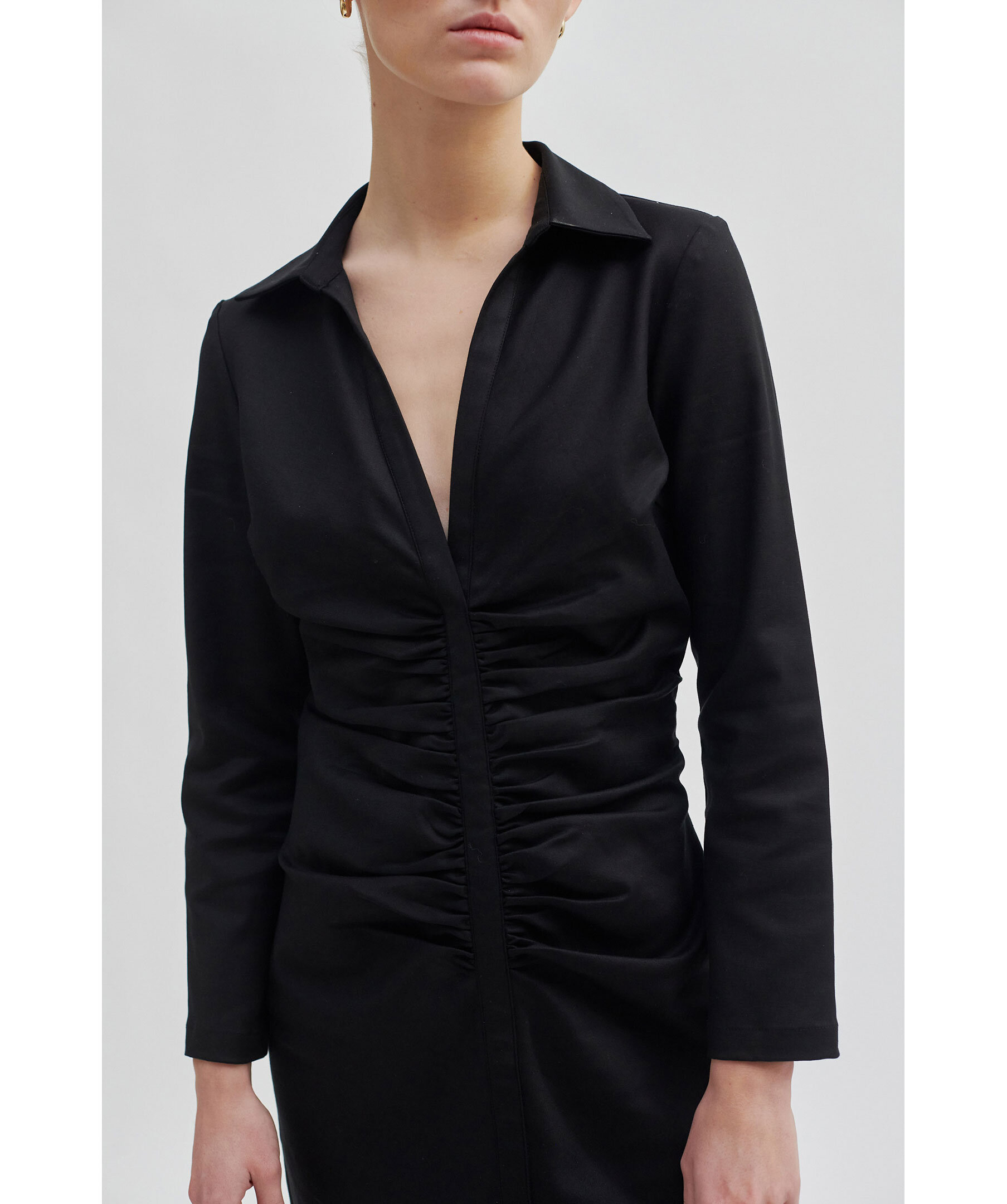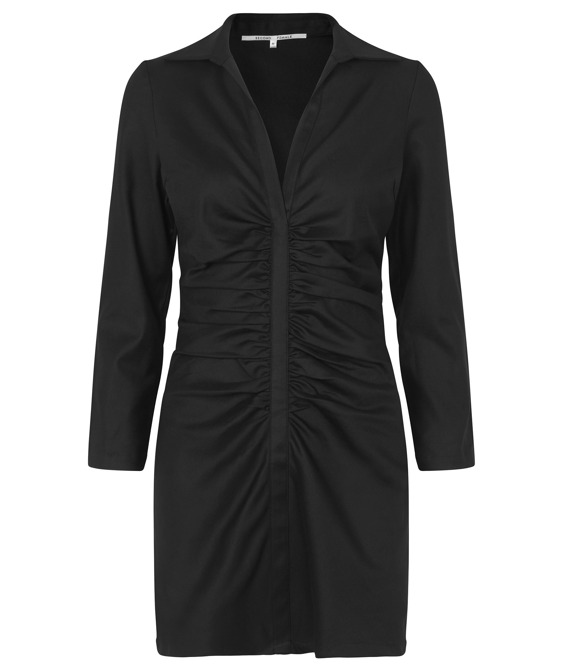 Svart, kvinnlig klänning med smal passform och minilängd från Second Female. Klänningen har en krage och falsk knappslå med rynkor framtill, vilket skapar en snygg, draperad passform. I sidan finns en osynlig dragkedja. Ärmarna är långa och smala.